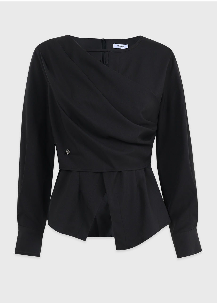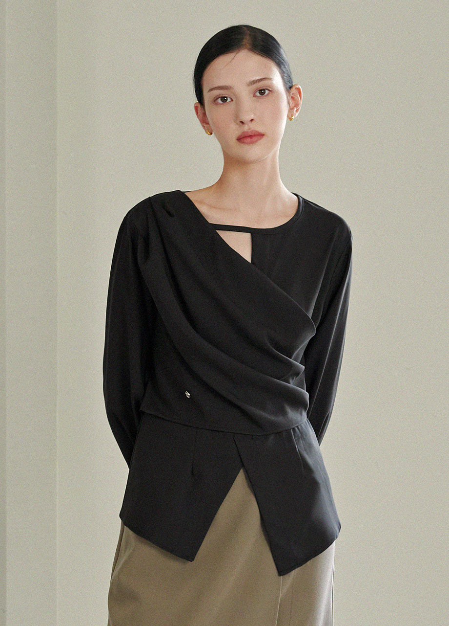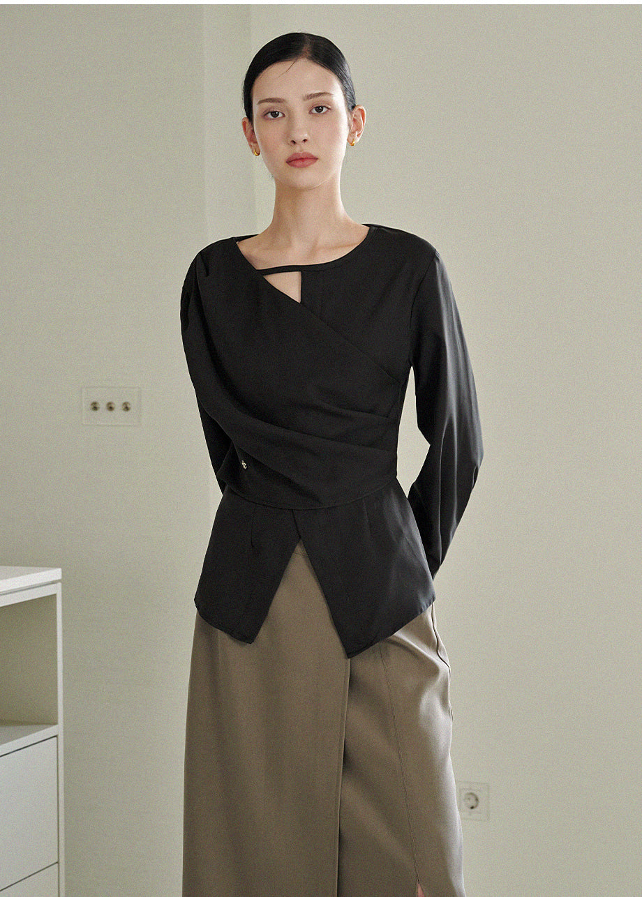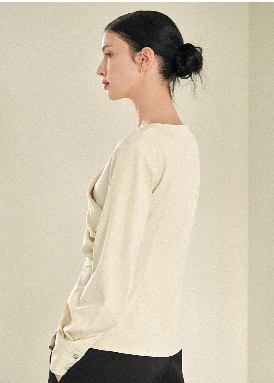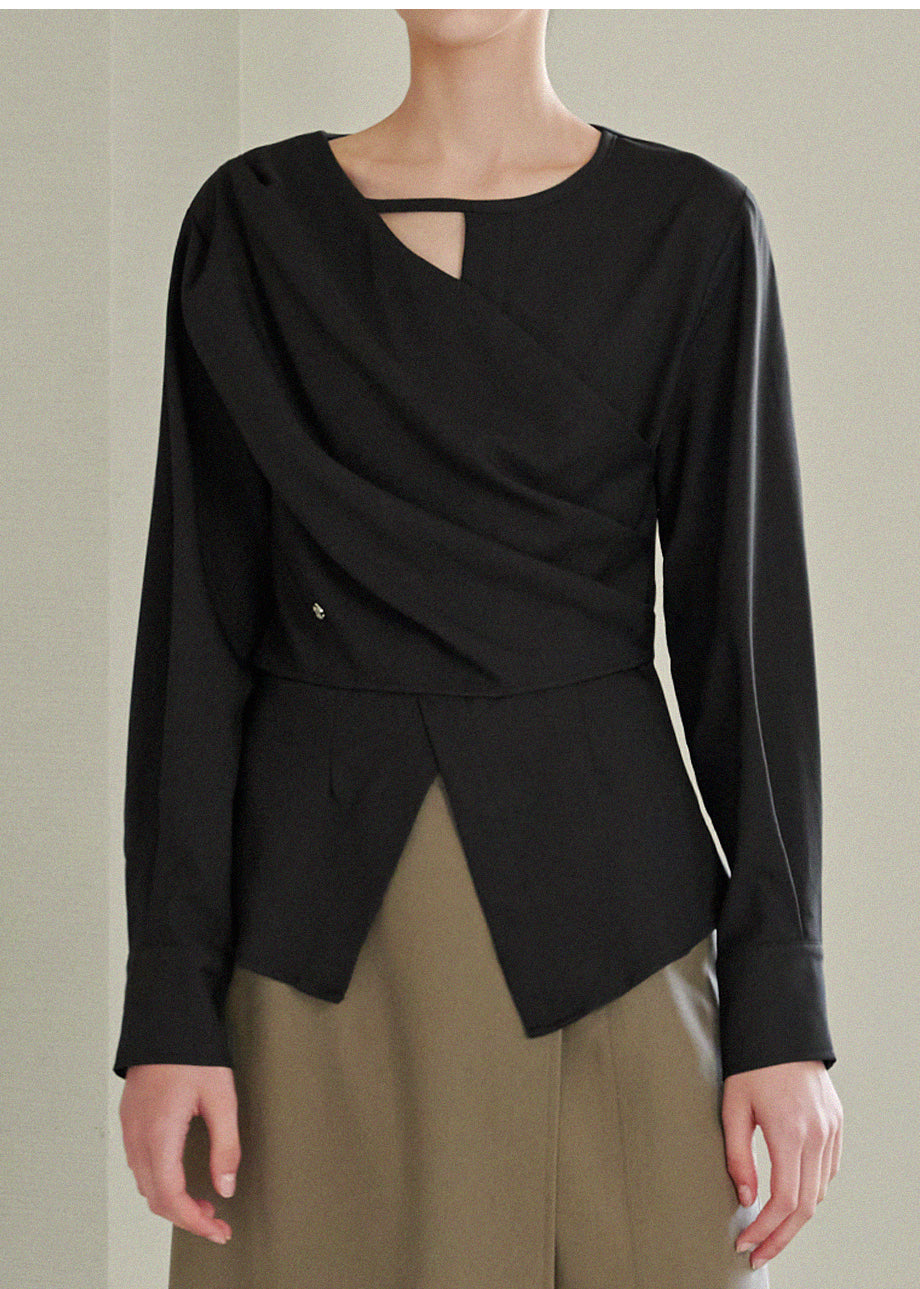 フェミニンで高級感のあるブラウスです。耐久性に優れた生地でフィットとクオリティを高め、ドレープの効いたラップ風レイヤードデザインで洗練されたスタイリングが可能です。