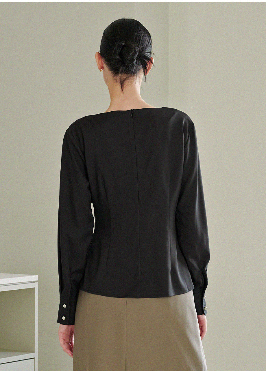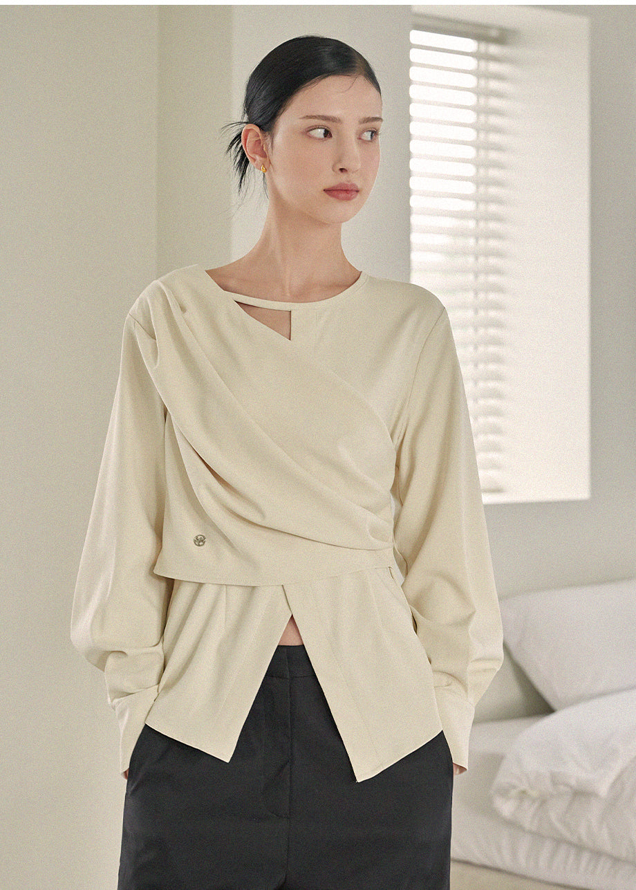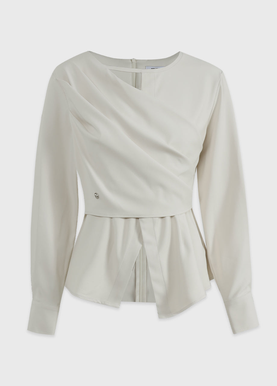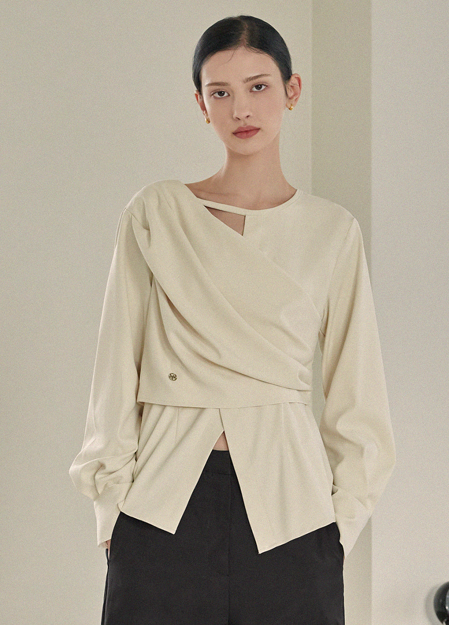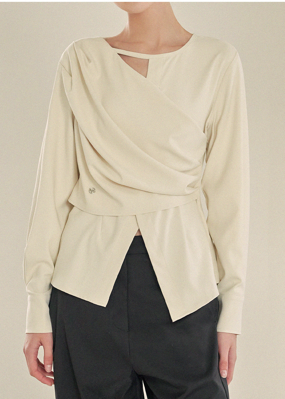 フェミニンで高級感のあるブラウスです。耐久性に優れた生地でフィットとクオリティを高め、ドレープの効いたラップ風レイヤードデザインで洗練されたスタイリングが可能です。