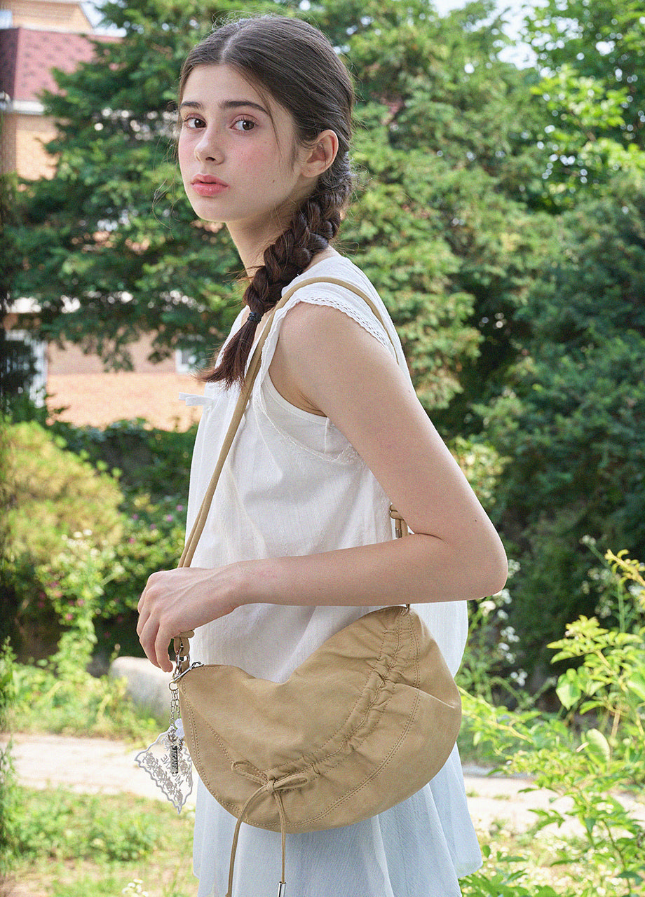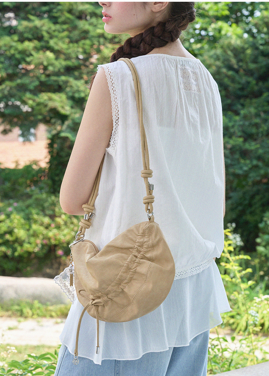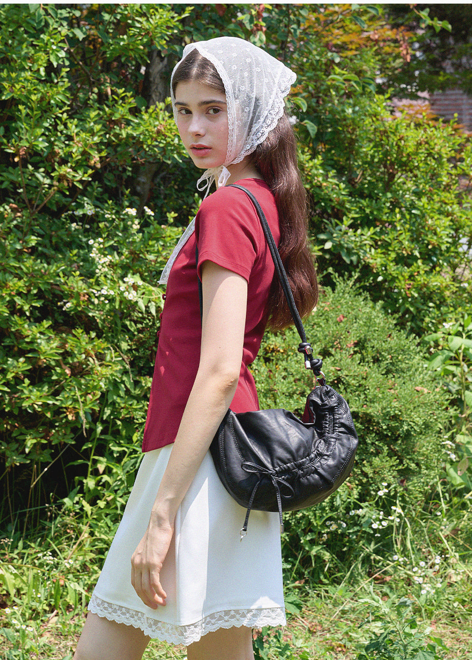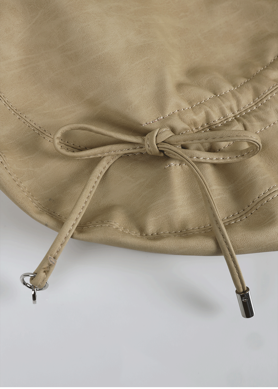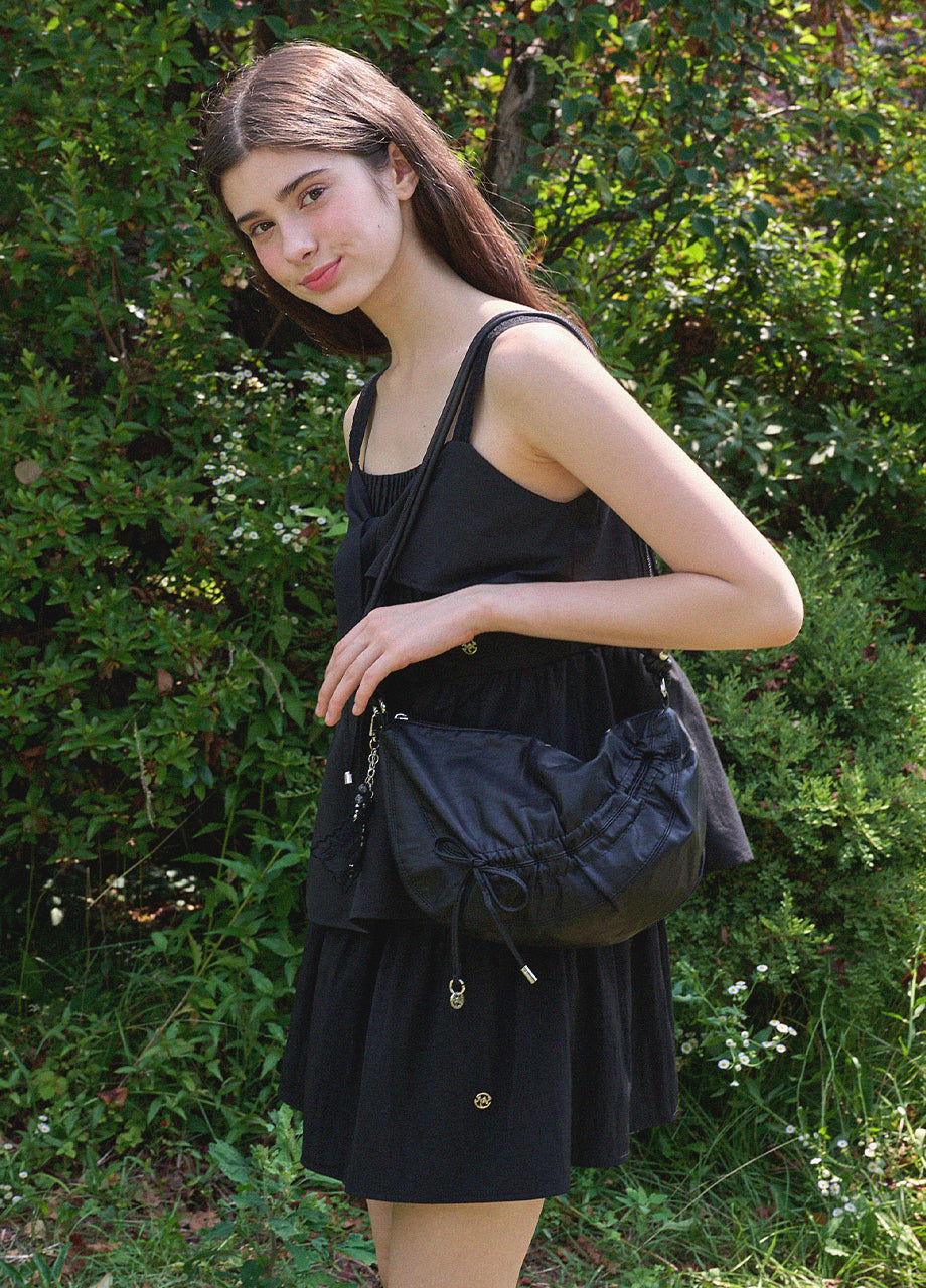フロントにビーズとペンダントの装飾が施された、ヴィンテージ感漂うストリングバッグ。日常スタイルに個性的なレトロ感をプラスします。