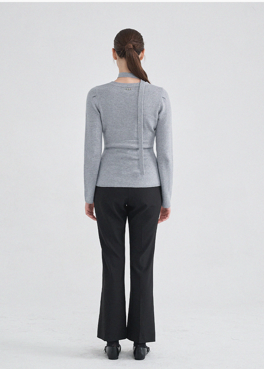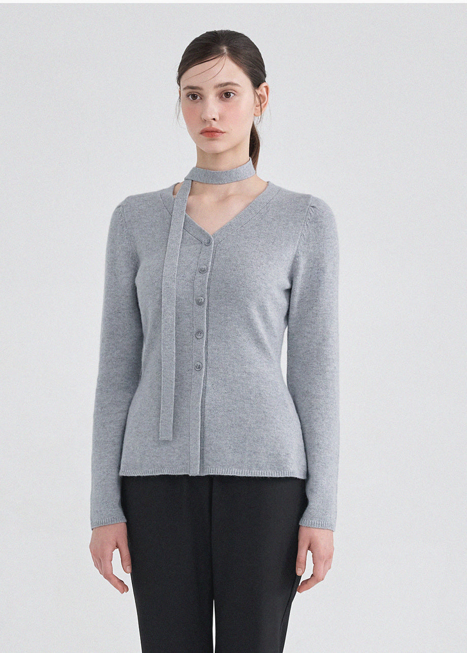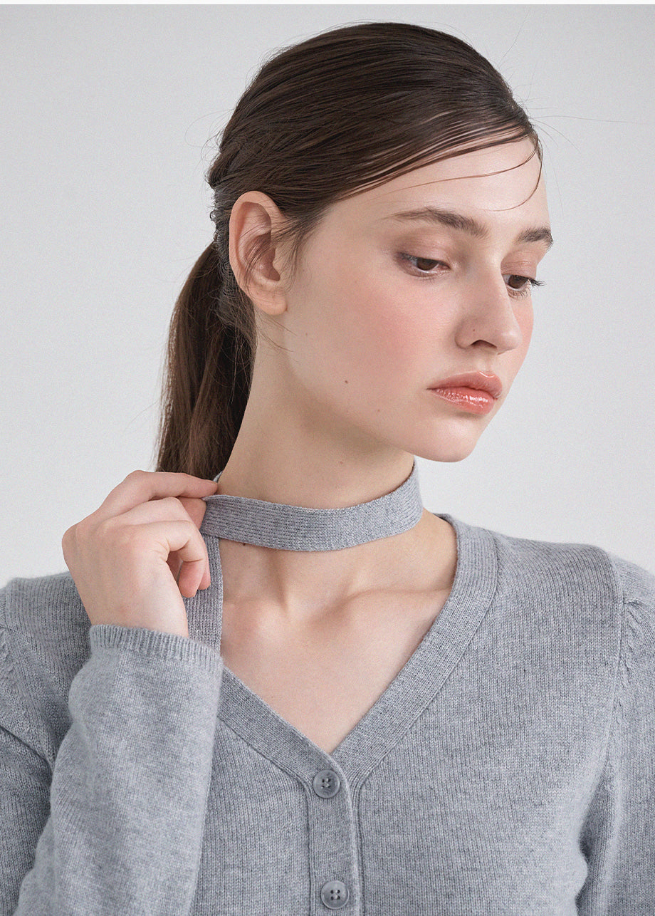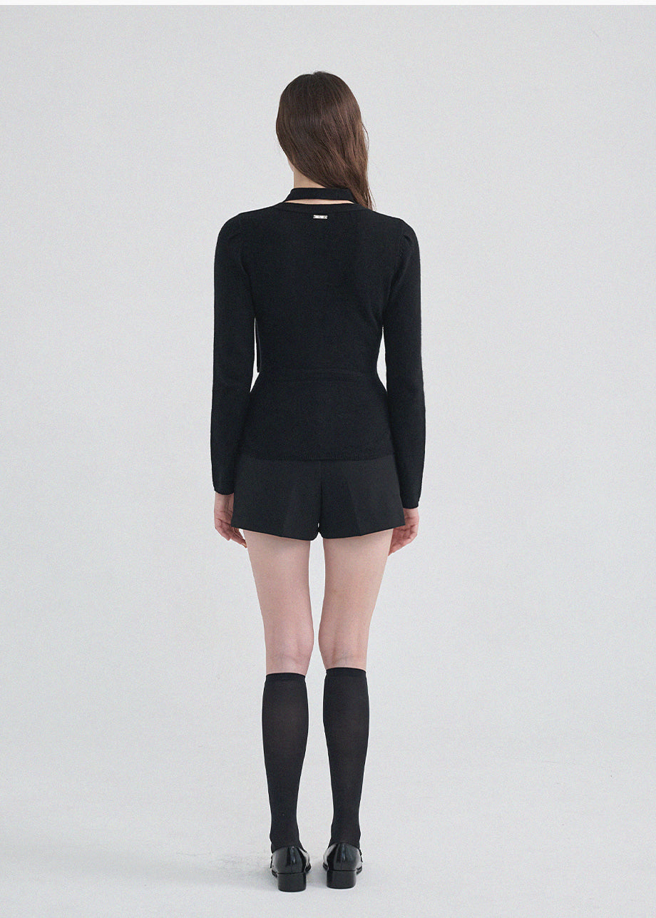 クラシックフェミニンムードのニットです。上質な天然繊維として知られるアンゴラとウールをブレンドした柔らかい素材で上品な着心地が特徴。セットのタイストラップで様々なスタイリングが楽しめます。Vネックデザインにフェイクボタンディテールを加えてクラシックなムードも演出できます。ウエストのラインを整えて裾のペプラムデザインで制作され、体型をカバーしつつ、よりスリムな着こなしを叶えてくれます。肩のピンタックがおしゃれなポイントになり、ネック後ろ中央にはペンダントで装飾を施し、上品に仕上げました。*装飾が施された製品のため、クリーニング専門店でのお手入れをおすすめいたします。ご注意:濃色に白い毛が見える場合がありますが、天然素材の特性であり、不良品ではございません。