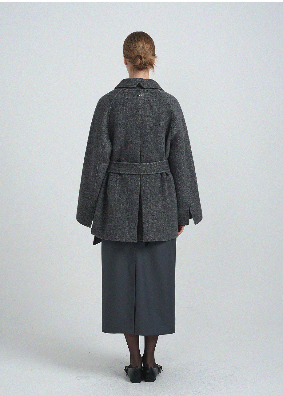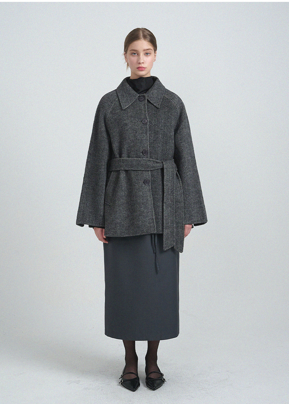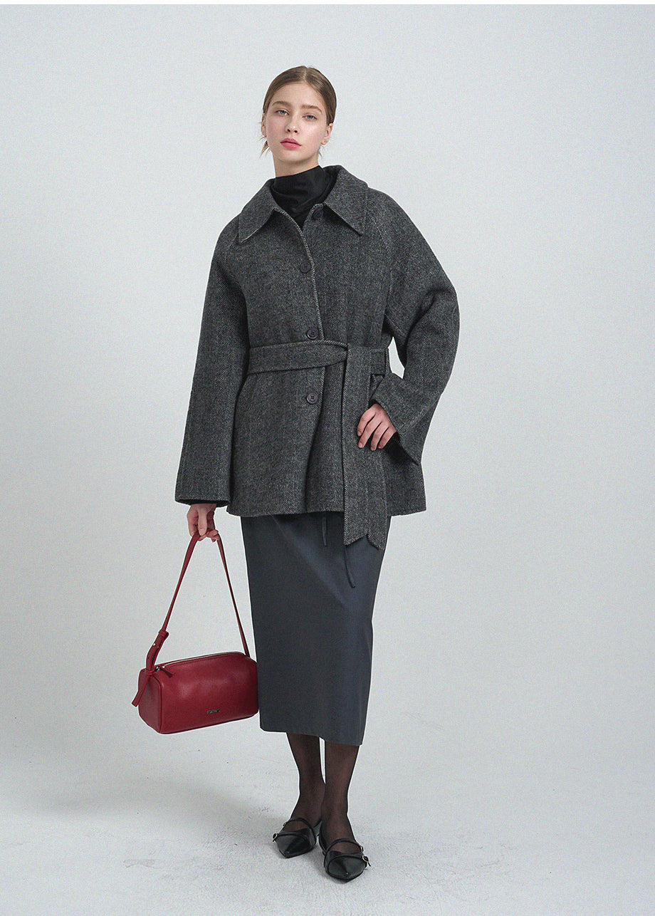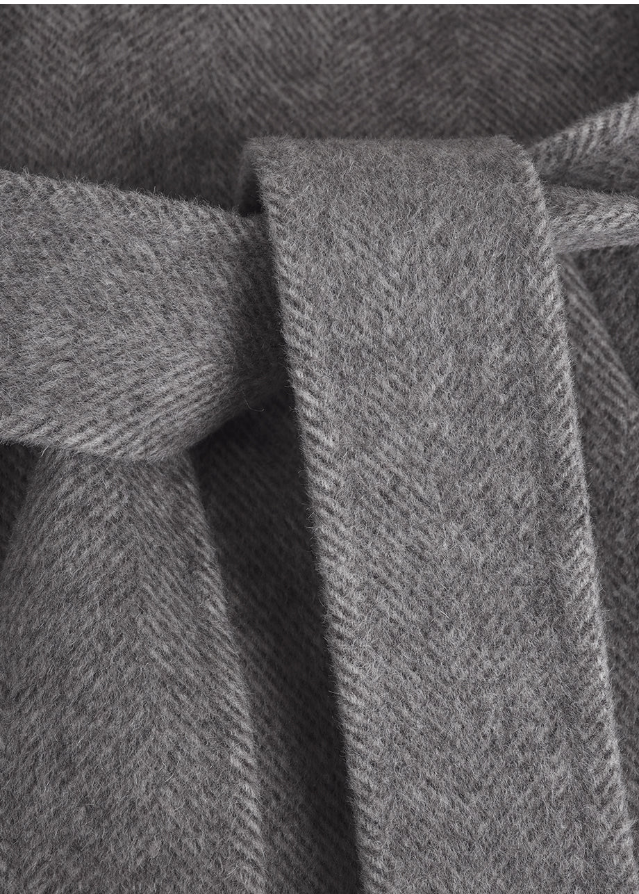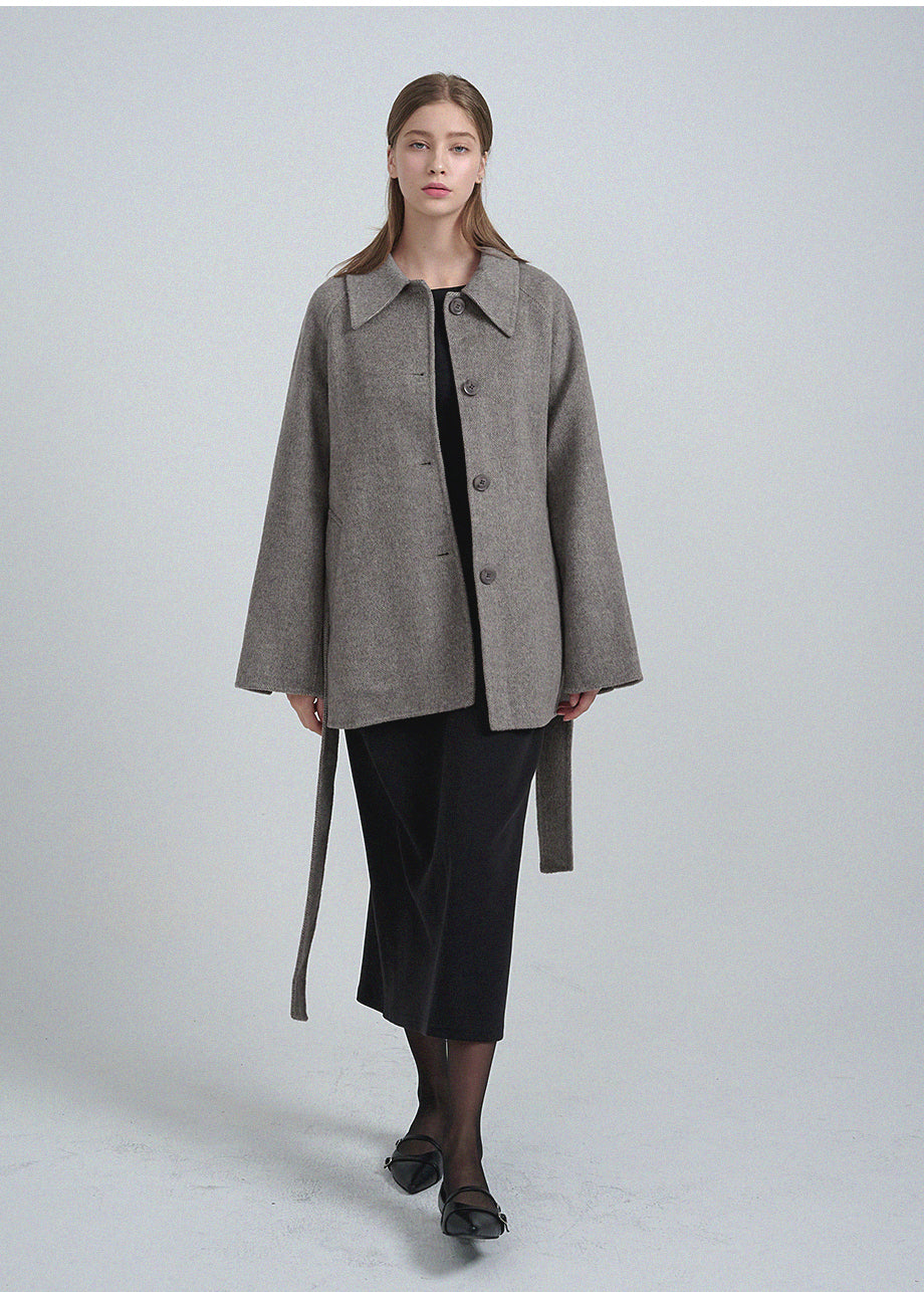 クラシックなムードが漂うハンドメイドコート。高品質な天然ウール100%のヘリンボーン生地を使用し、優れた保温性とラグジュアリーな着心地を実現しました。ハーフ丈のオーバーフィットで、リラックス感のある着こなしが楽しめます。同素材のベルトが付属しており、スタイリングの幅を広げてくれます。背中の襟中央にはミケネオリジナルの切替とスリットが施され、シンプルながらも洗練された印象に。袖口のスリットディテールと、背中心のプリーツにより、裾に向かって広がる美しいシルエットを演出します。後ろ襟の中央にはペンダントディテールをあしらい、ディテールまでこだわった上質な仕上がりに仕上げました。*装飾が施された製品のため、クリーニング専門店でのお手入れをおすすめいたします。