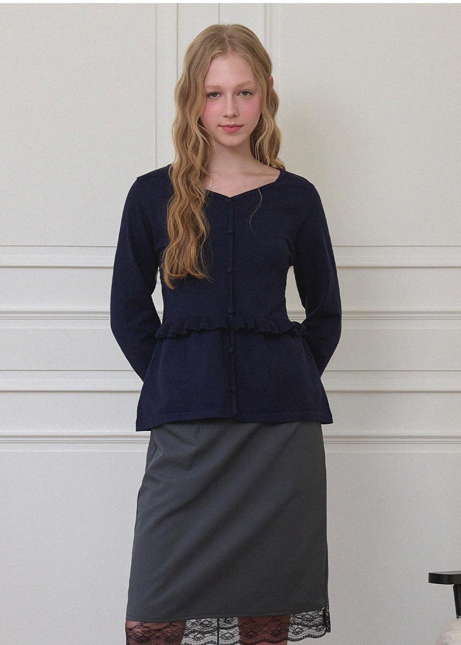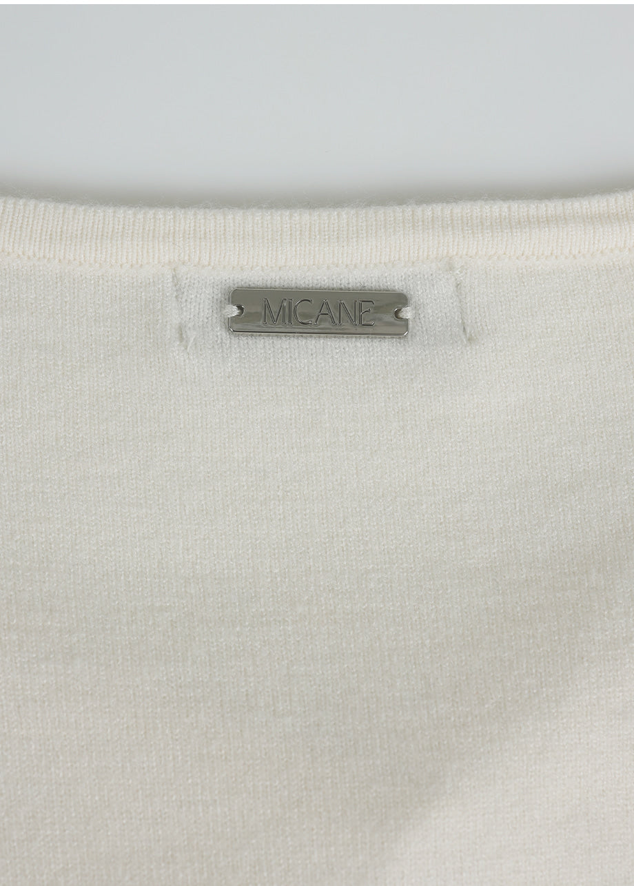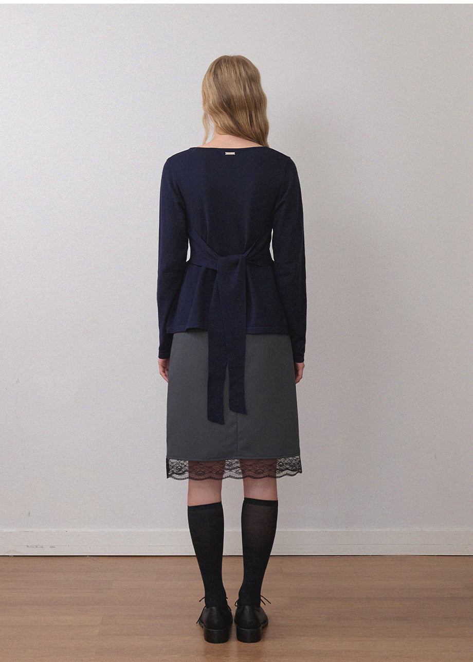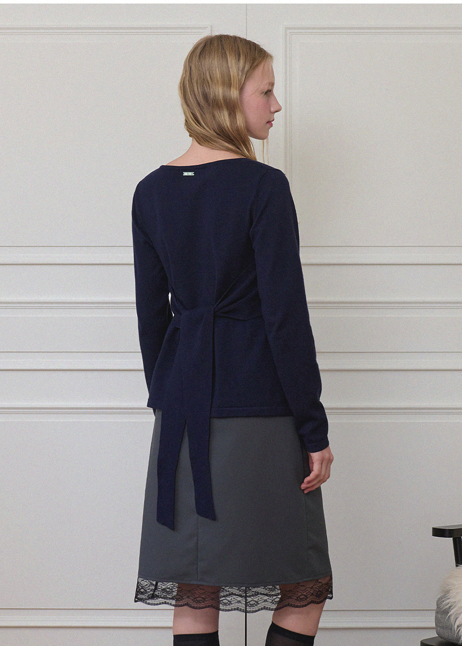 ビンテージラブリームードが際立つニットです。柔らかく、密度の高い生地で仕立てられており、快適な着心地を楽しめます。スクエアハートラインのデザインにルーズフィットなシルエットで、様々なコーディネートに活用できます。ウエストのサイドにストラップを加え、後ろで結ぶことで、よりスリムなウエストラインを演出。また、ウエストラインに施されたフリルディテールがシンプルすぎず、ラブリーな雰囲気を添えてくれます。ネック後ろ中央にはペンダントで装飾を施し、上品に仕上げました。*装飾が施された製品のため、クリーニング専門店でのお手入れをおすすめいたします。