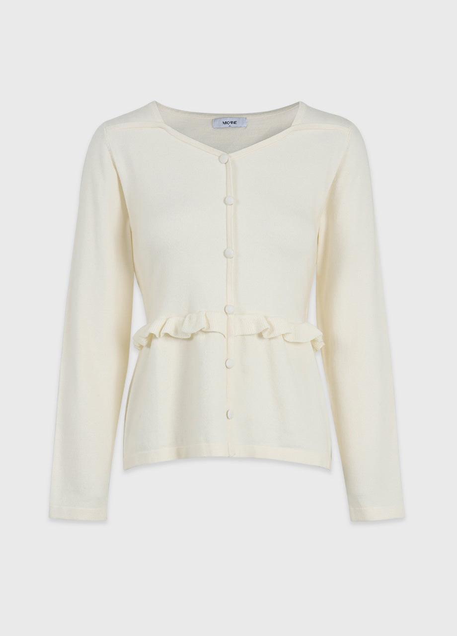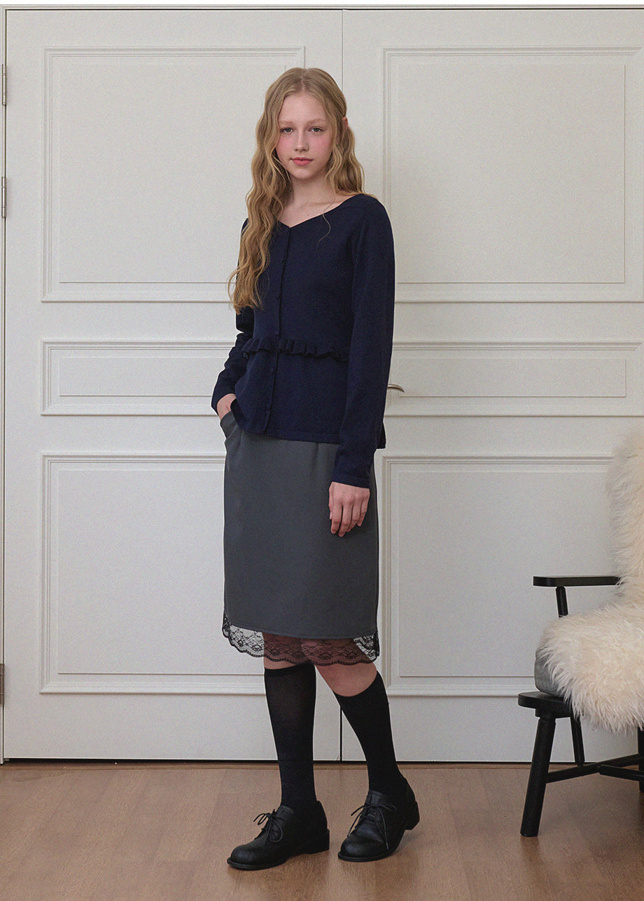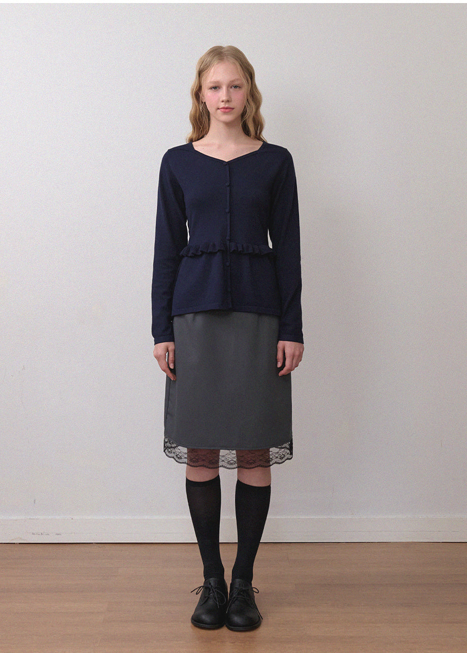 ビンテージラブリームードが際立つニットです。柔らかく、密度の高い生地で仕立てられており、快適な着心地を楽しめます。スクエアハートラインのデザインにルーズフィットなシルエットで、様々なコーディネートに活用できます。ウエストのサイドにストラップを加え、後ろで結ぶことで、よりスリムなウエストラインを演出。また、ウエストラインに施されたフリルディテールがシンプルすぎず、ラブリーな雰囲気を添えてくれます。ネック後ろ中央にはペンダントで装飾を施し、上品に仕上げました。*装飾が施された製品のため、クリーニング専門店でのお手入れをおすすめいたします。