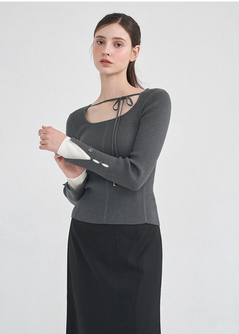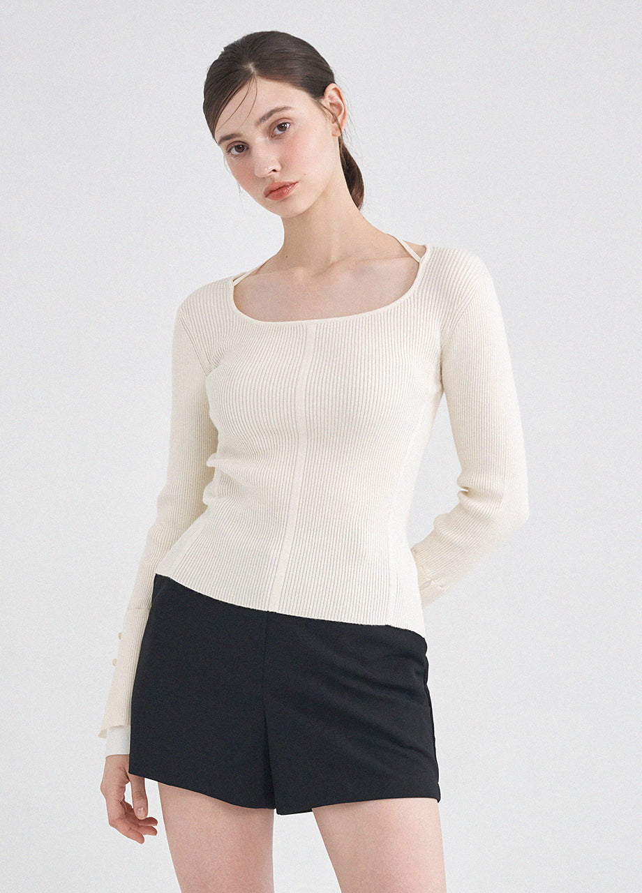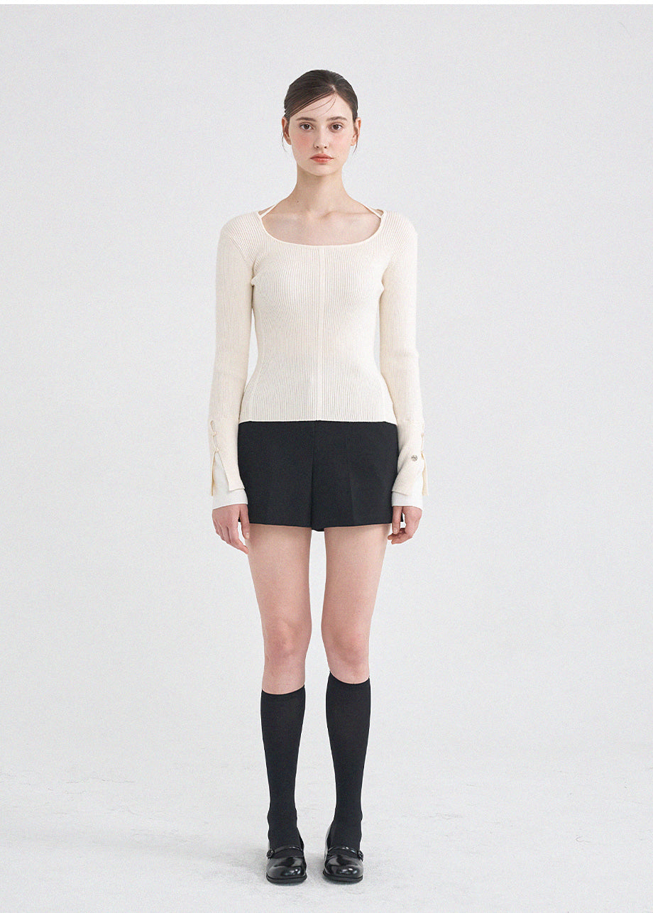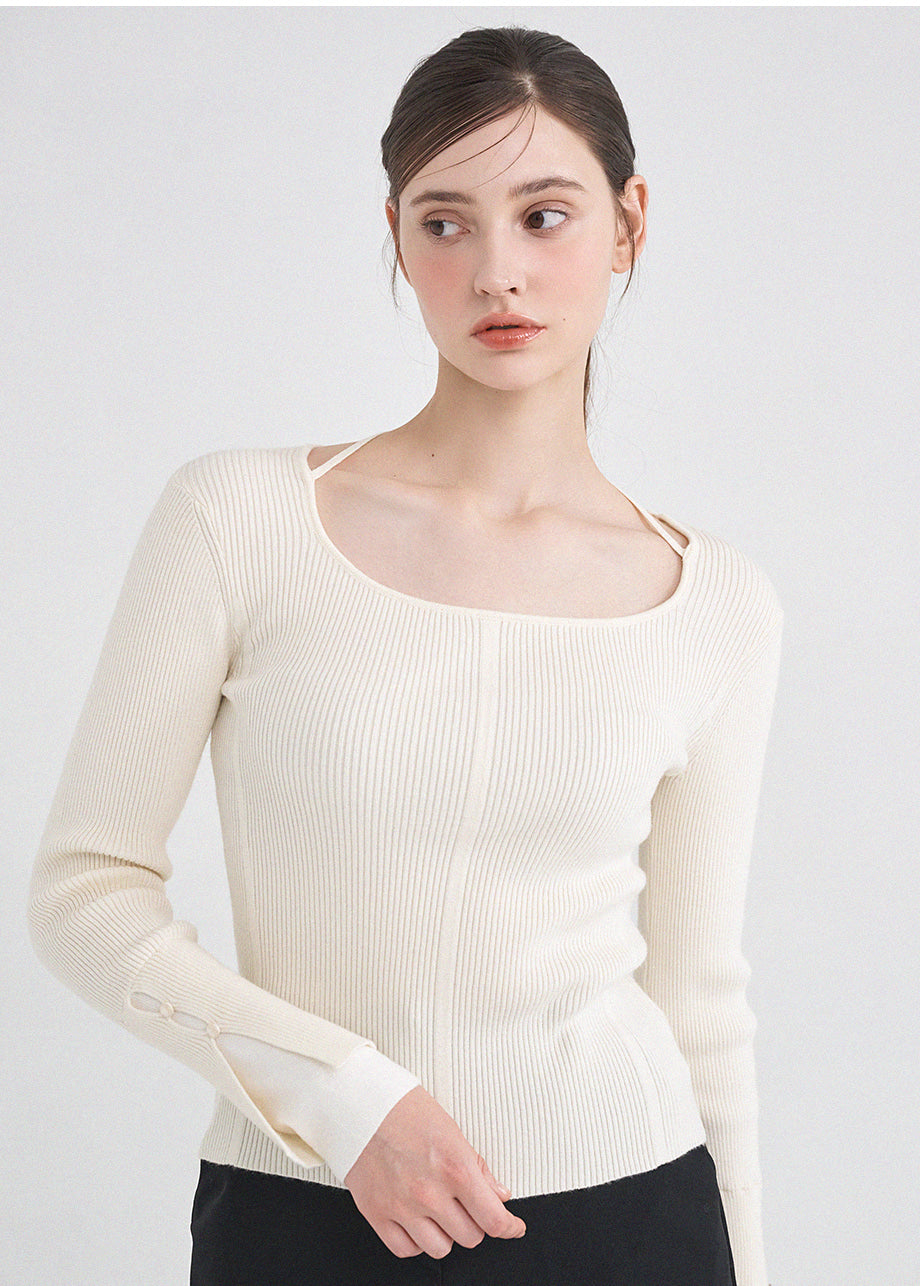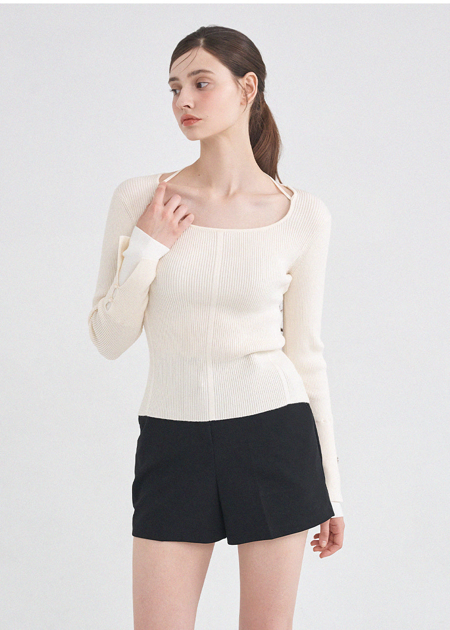 フェミニンクラシックなニットトップス。柔らかな肌触りと耐久性・保温性に優れた糸を使用し、肌に優しく暖かい着心地が特徴です。細かいリブ編みで体型を拾わず、スクエアネックに細めのストラップをあしらい、好みに合わせてアレンジできます。袖にはスリットと小さなボタン留めを加え、配色の前立てでフェミニンな印象を演出。さらにサイドのペンダントディテールで上質に仕上げました。*装飾や特殊なデザインが施された製品のため、クリーニング専門店でのお手入れをおすすめいたします。