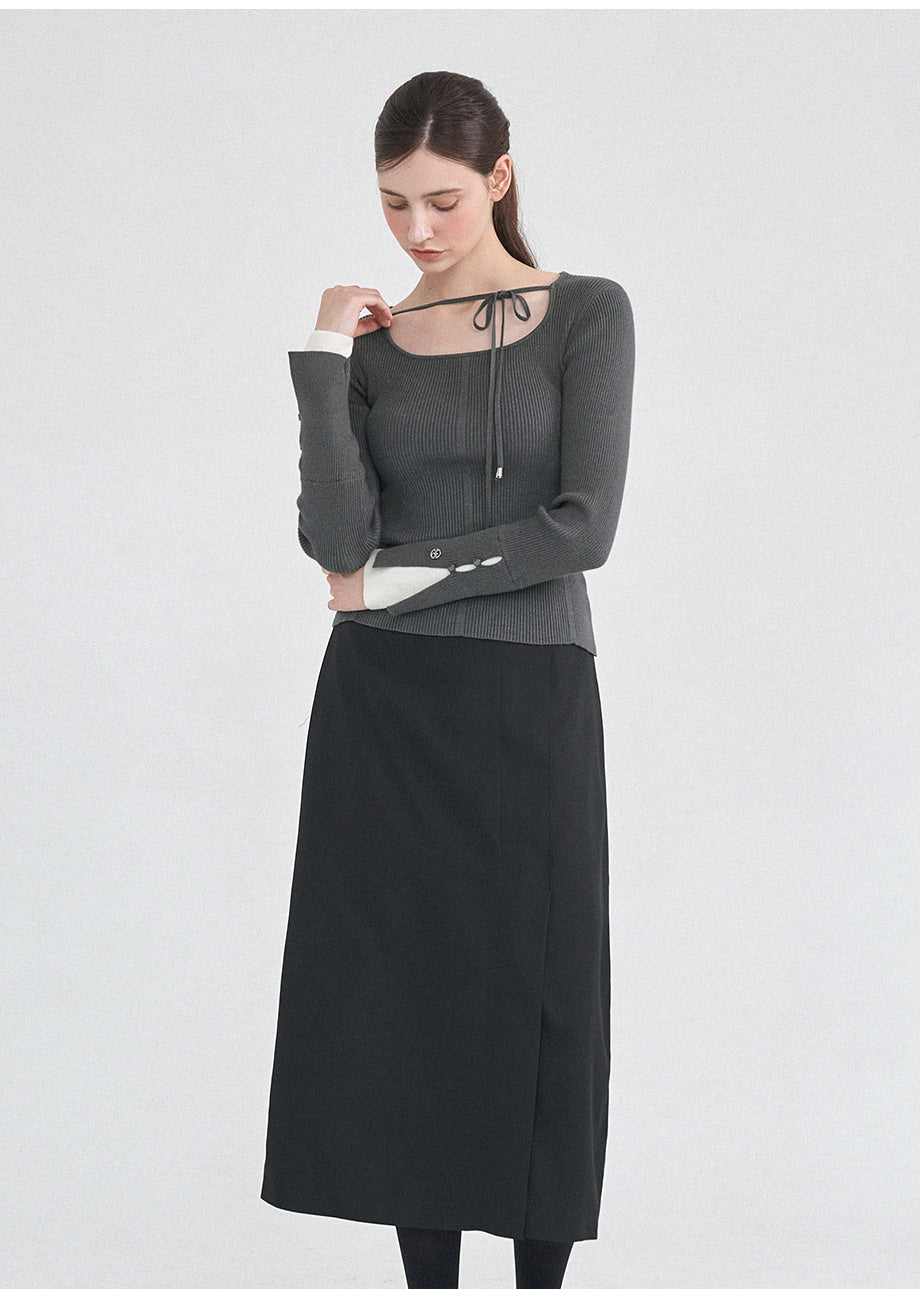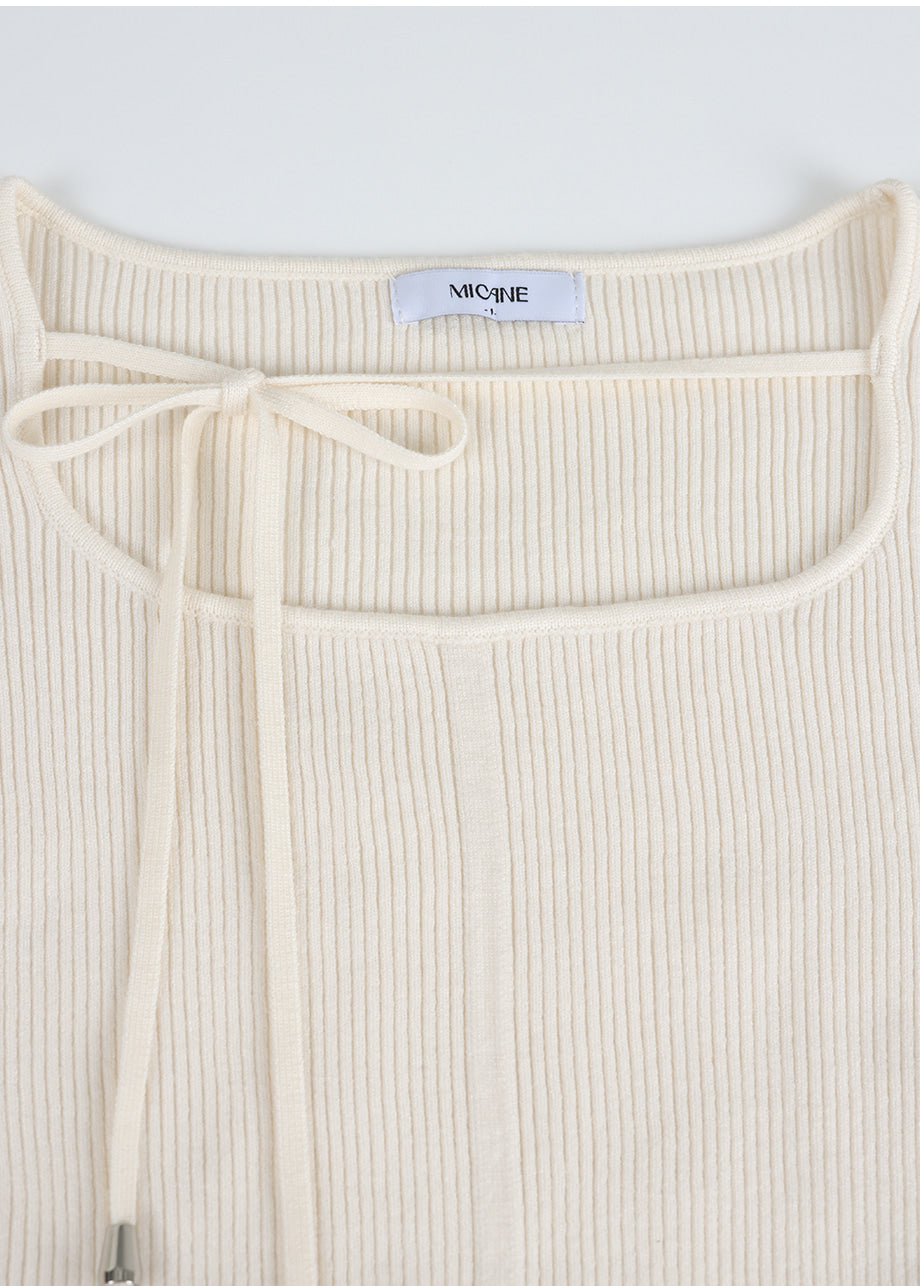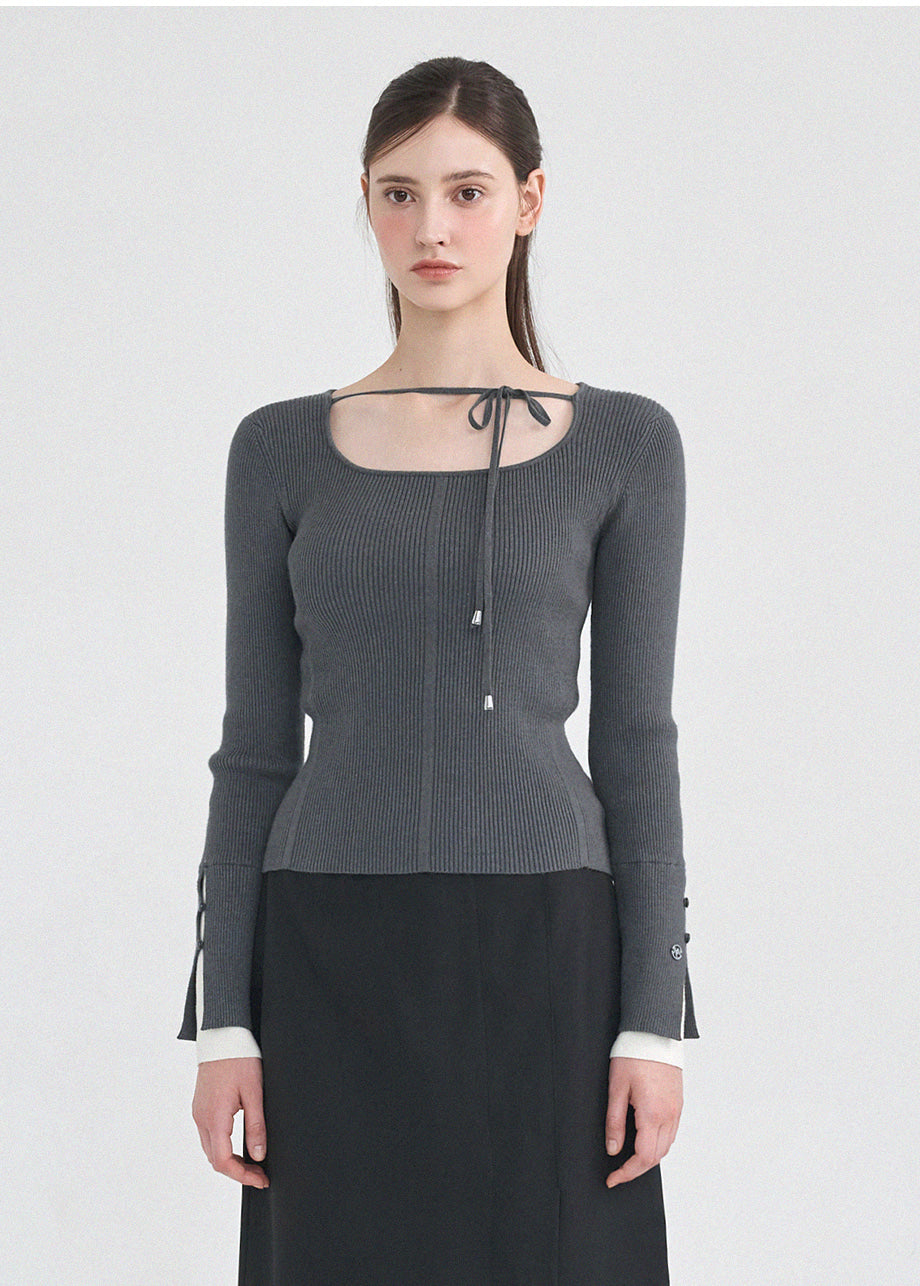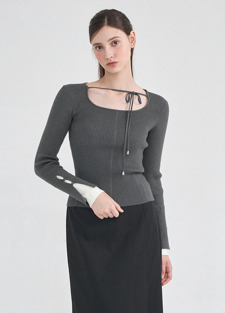 フェミニンクラシックなニットトップス。柔らかな肌触りと耐久性・保温性に優れた糸を使用し、肌に優しく暖かい着心地が特徴です。細かいリブ編みで体型を拾わず、スクエアネックに細めのストラップをあしらい、好みに合わせてアレンジできます。袖にはスリットと小さなボタン留めを加え、配色の前立てでフェミニンな印象を演出。さらにサイドのペンダントディテールで上質に仕上げました。*装飾や特殊なデザインが施された製品のため、クリーニング専門店でのお手入れをおすすめいたします。
