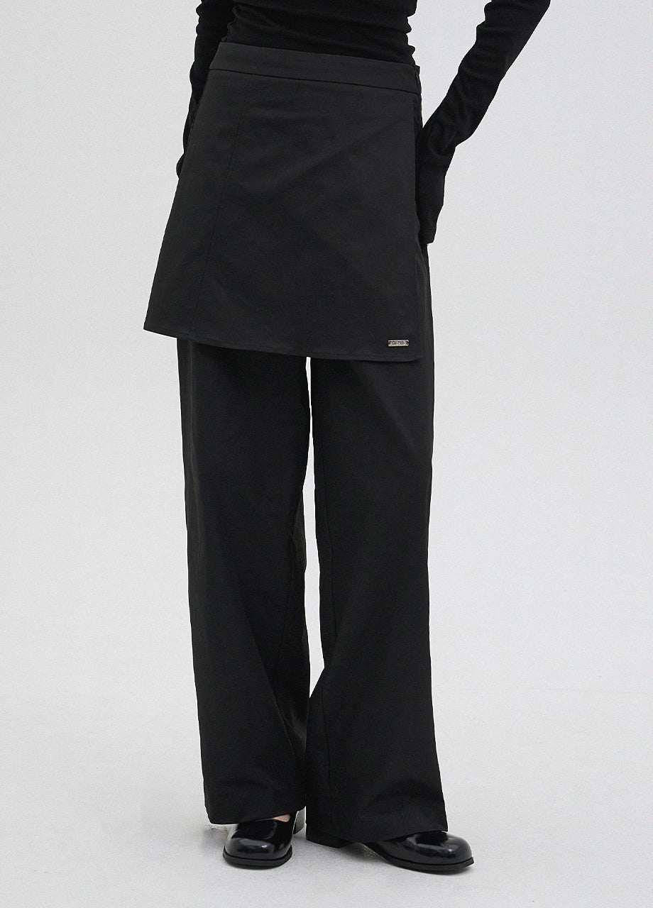クラシックムードのパンツ。ハリ感のある丈夫な生地を使用し、快適で型崩れしにくい履き心地が魅力です。ミニラップスカートをレイヤードしたデザインで、体型カバー効果がありつつ幅広いシーンで活躍します。ベストなサイズ感に合わせたローライズスタイルで、どなたでも上品に着こなせる一着です。後ろウエストのシグネチャー切り替えやスリット、さらにサイドに施したペンダントディテールで仕上げました。*装飾が施された製品のため、クリーニング専門店でのお手入れをおすすめいたします。