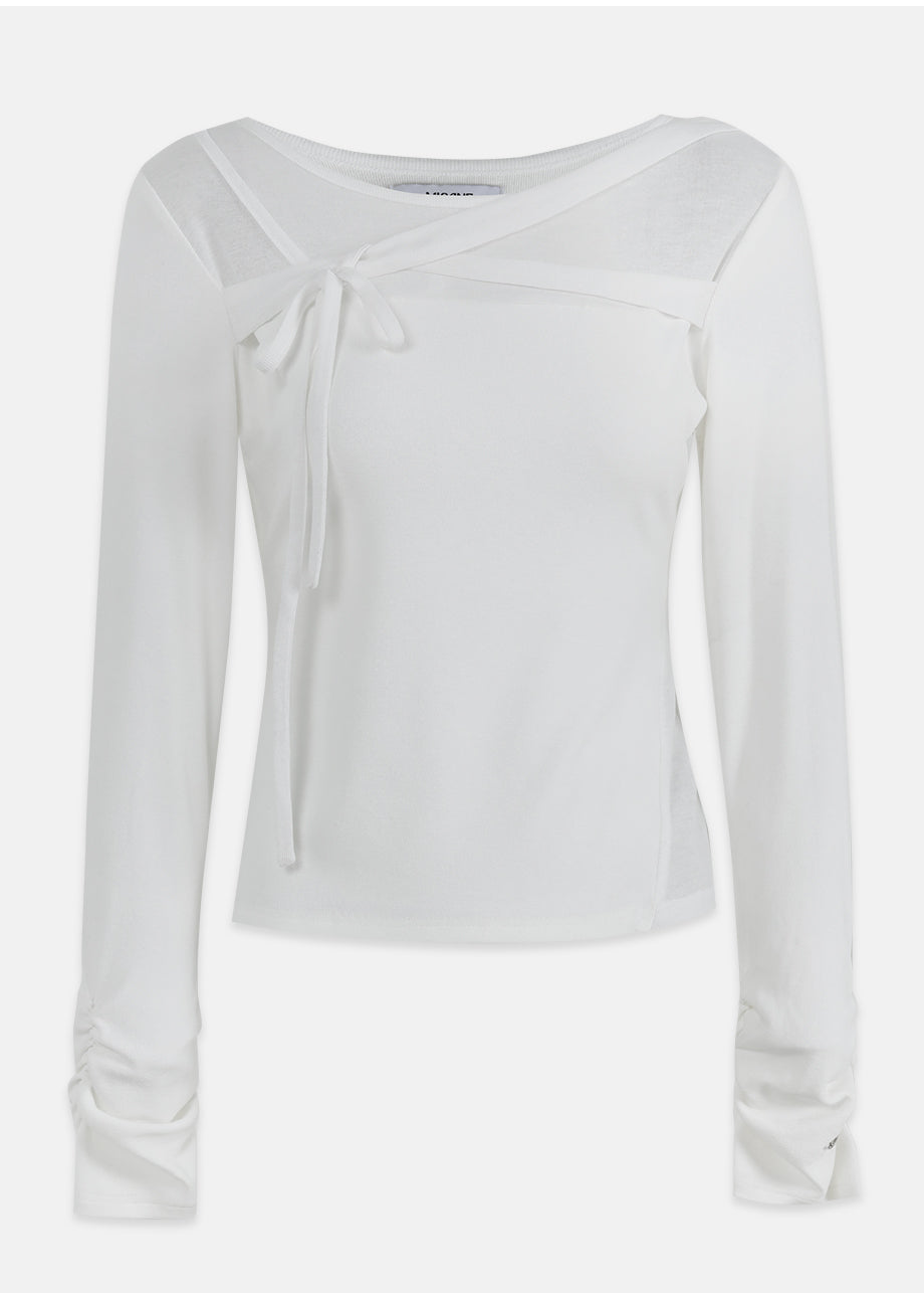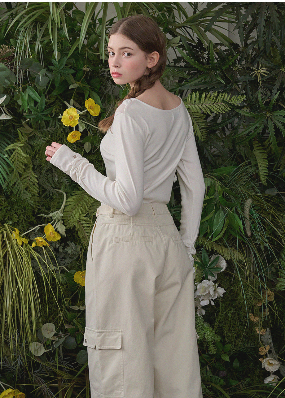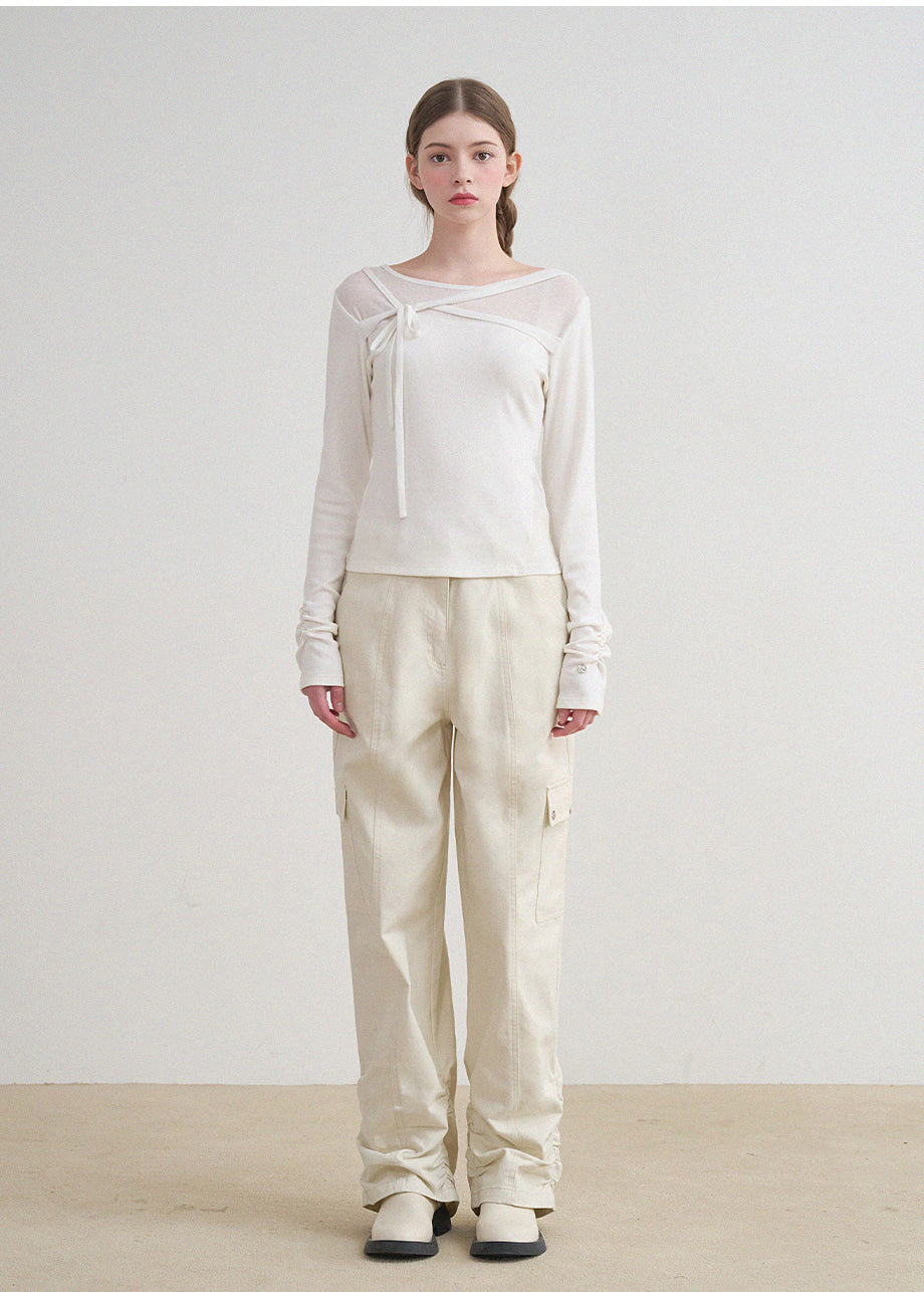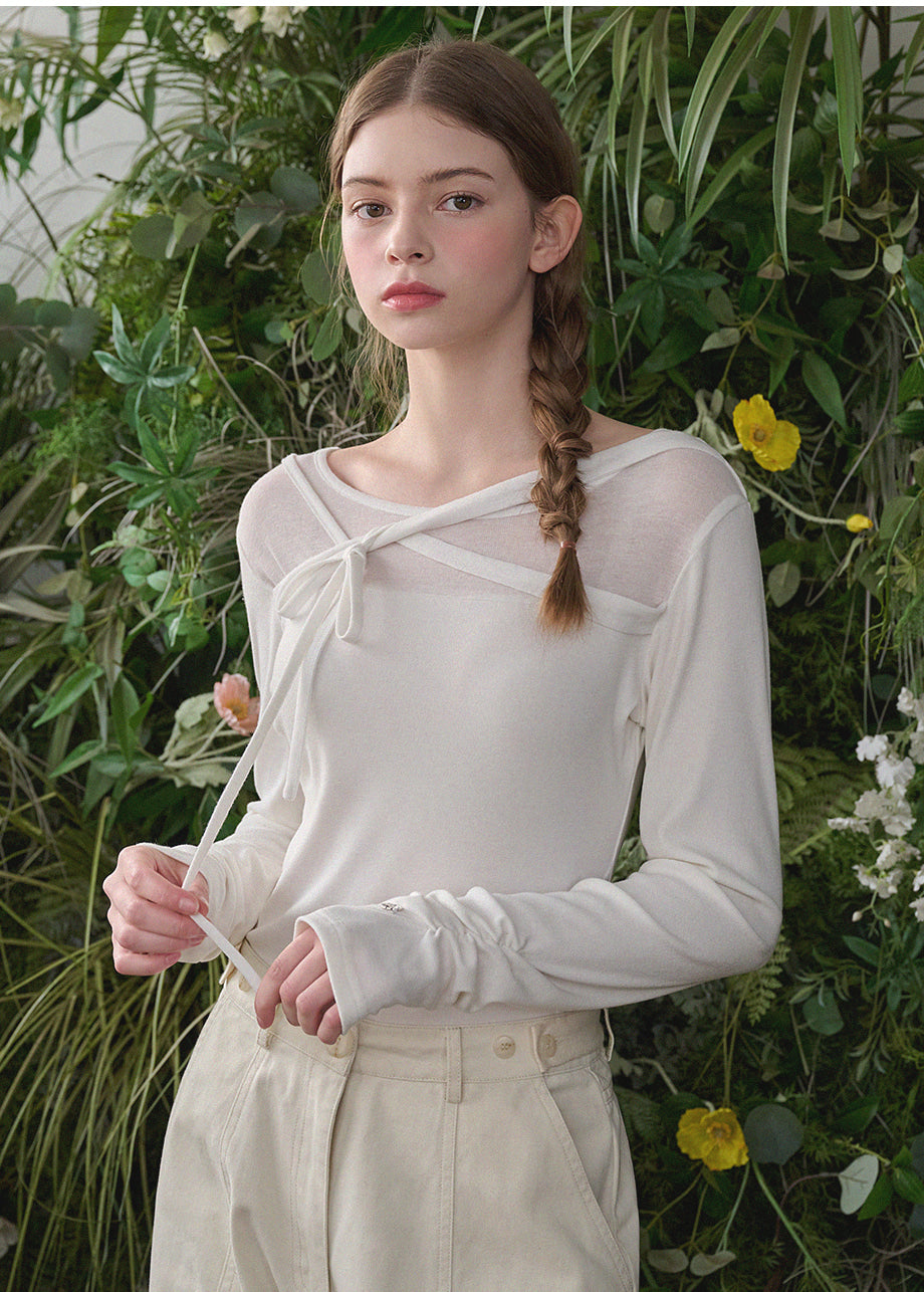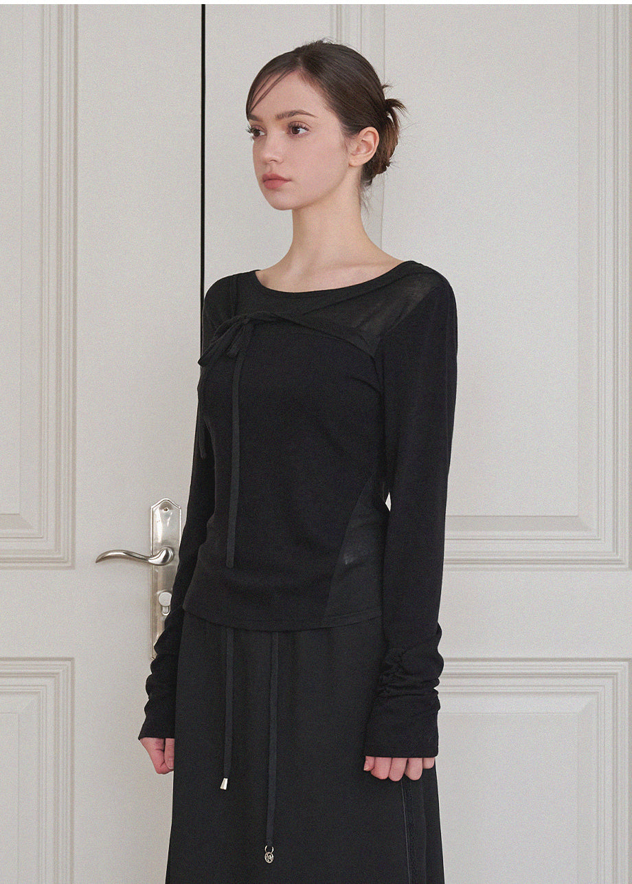 ロマンチックな感性のロングスリーブTシャツです。ネックラインから袖にかけて透け感のある異素材を配し、肩ストラップと袖のシャーリングがフェミニンな印象を引き立てます。*装飾が施された製品のため、クリーニング専門店でのお手入れをおすすめいたします。