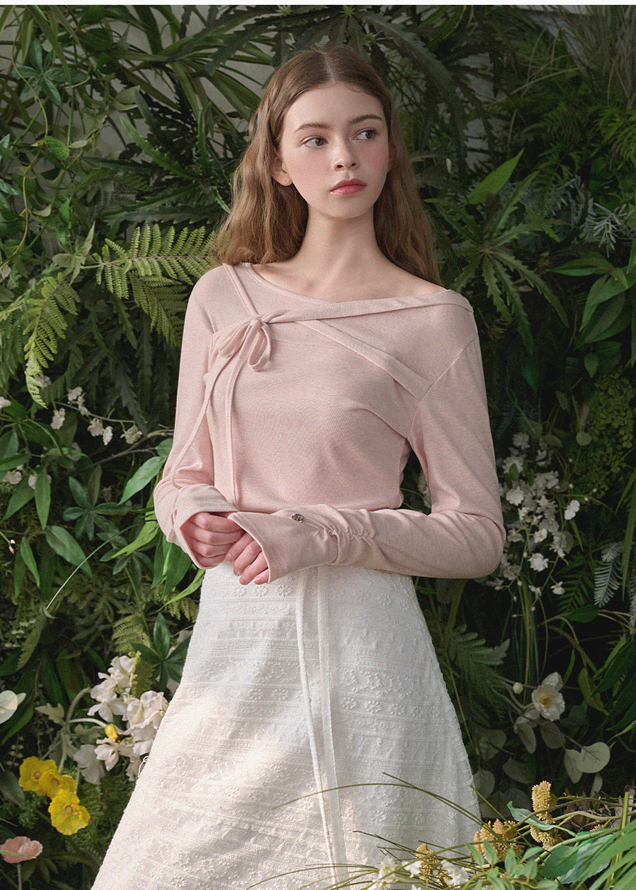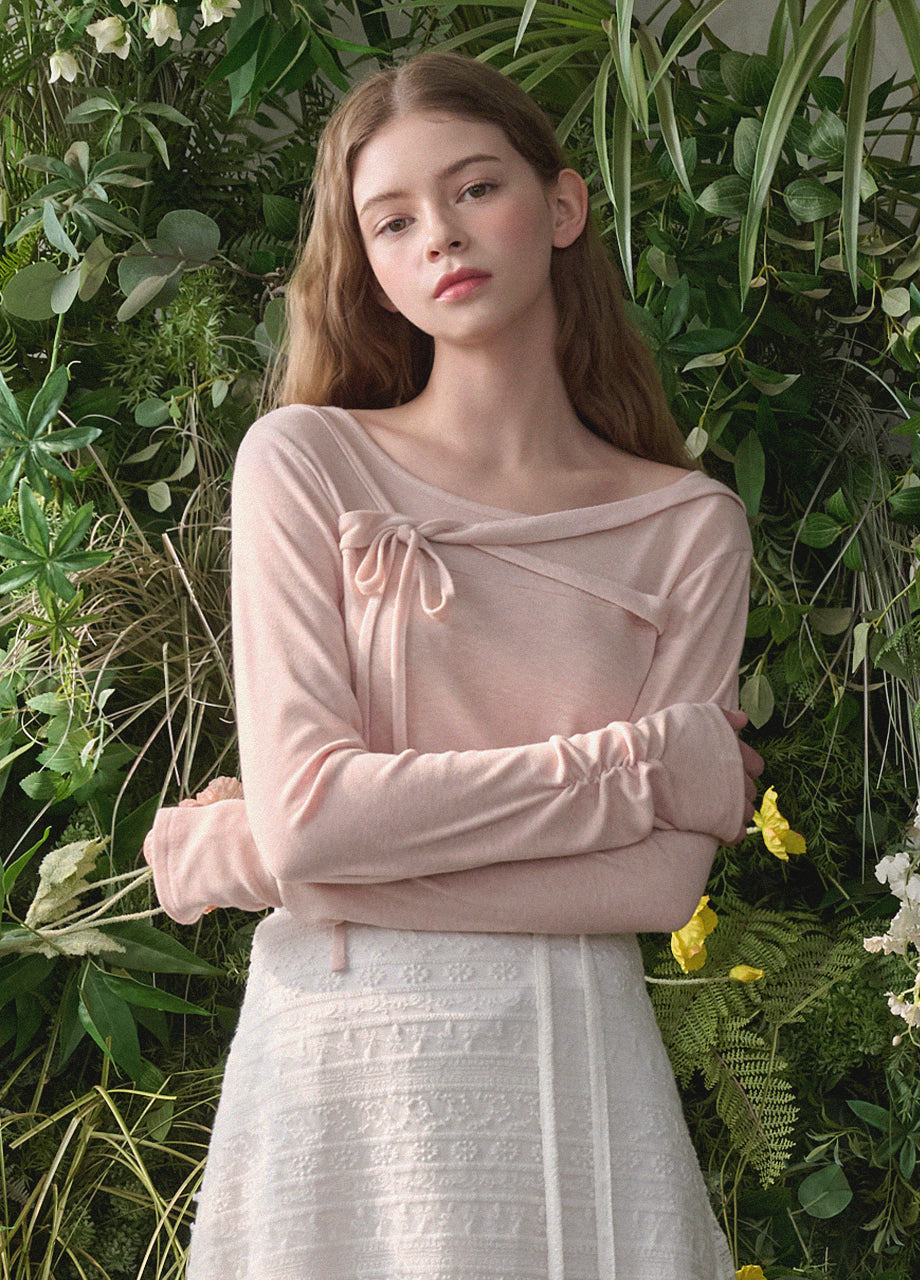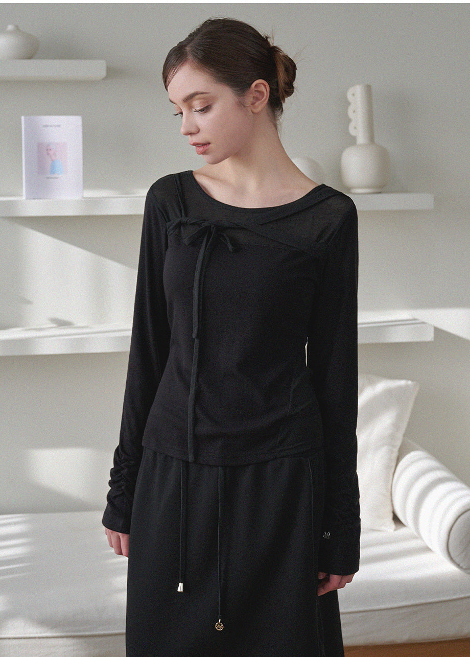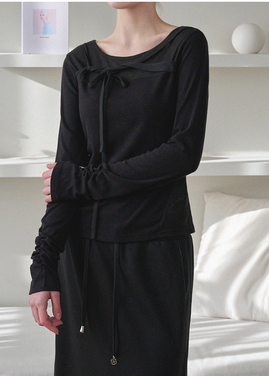 ロマンチックな感性のロングスリーブTシャツです。ネックラインから袖にかけて透け感のある異素材を配し、肩ストラップと袖のシャーリングがフェミニンな印象を引き立てます。*装飾が施された製品のため、クリーニング専門店でのお手入れをおすすめいたします。
