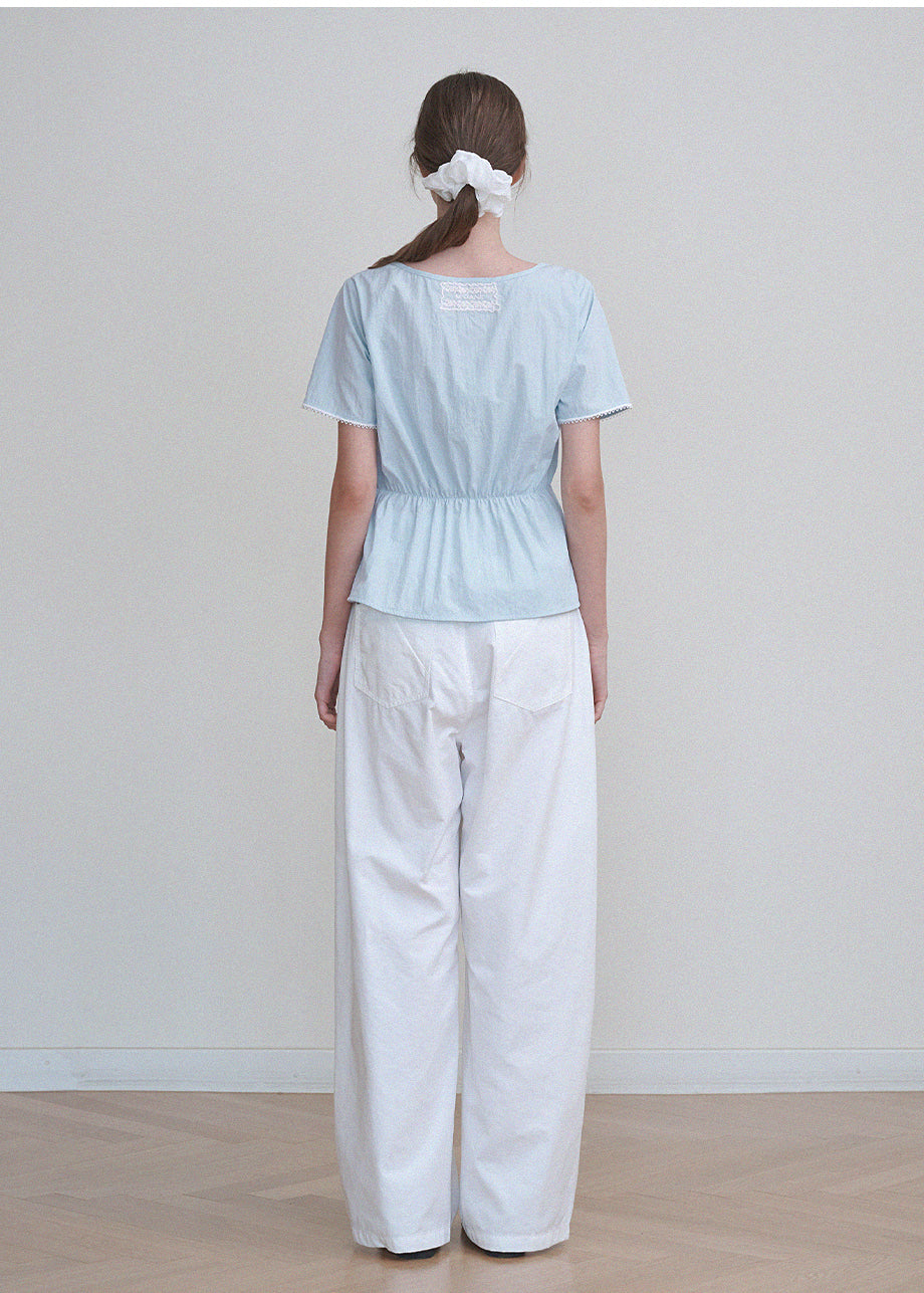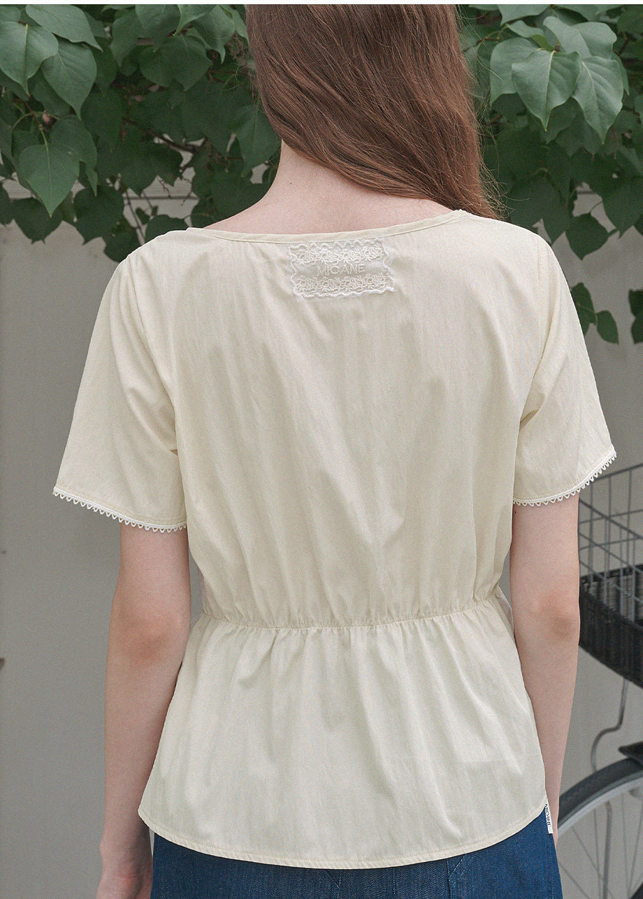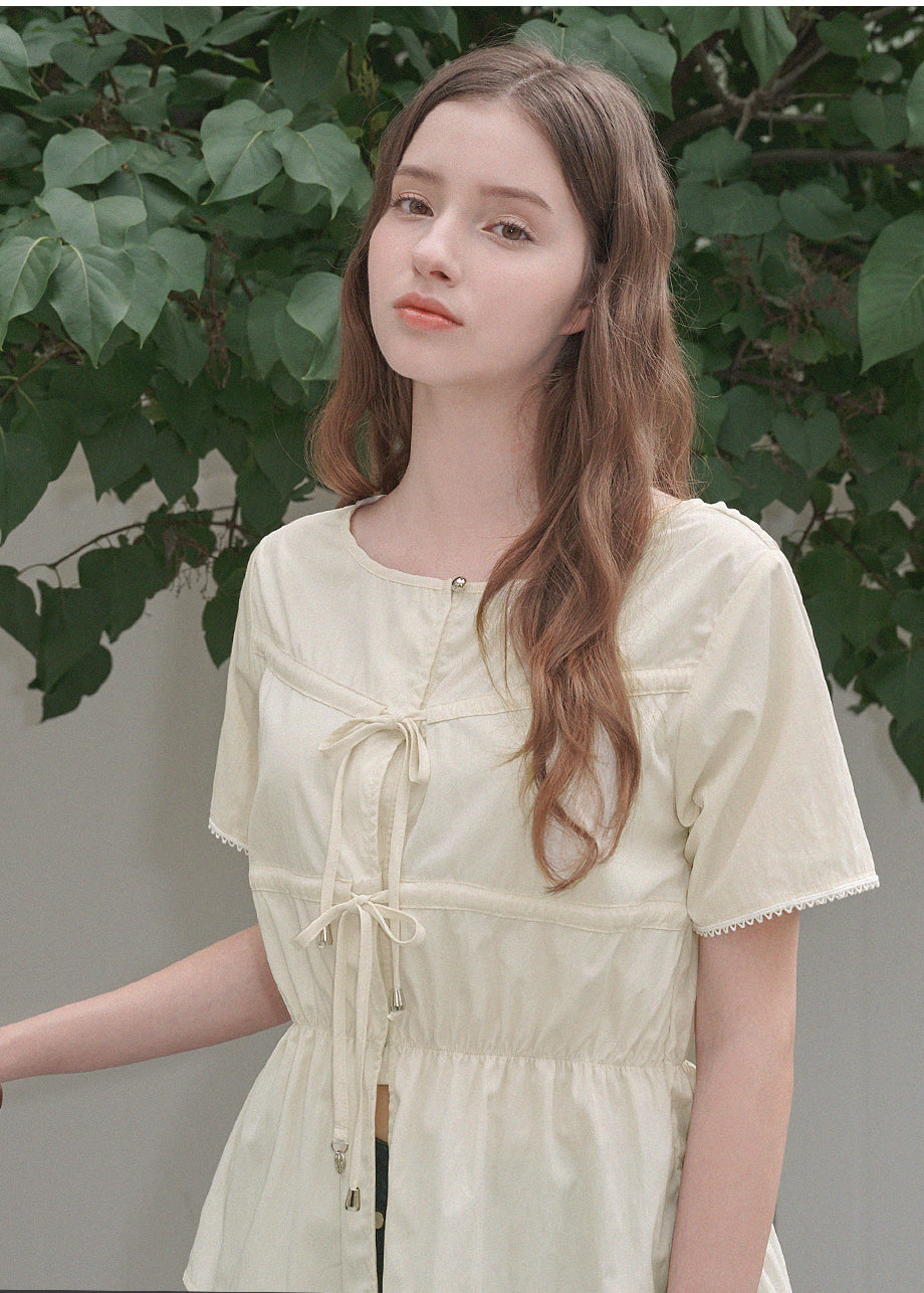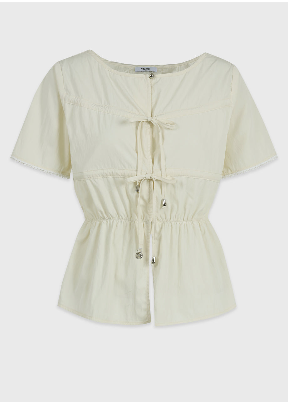 フェミニンでラブリーなムードの半袖ブラウス。フロントのハートラインとストレートストリングディテールでシャーリング調整が可能です。*装飾や特殊なデザインが施された製品のため、クリーニング専門店でのお手入れをおすすめいたします。