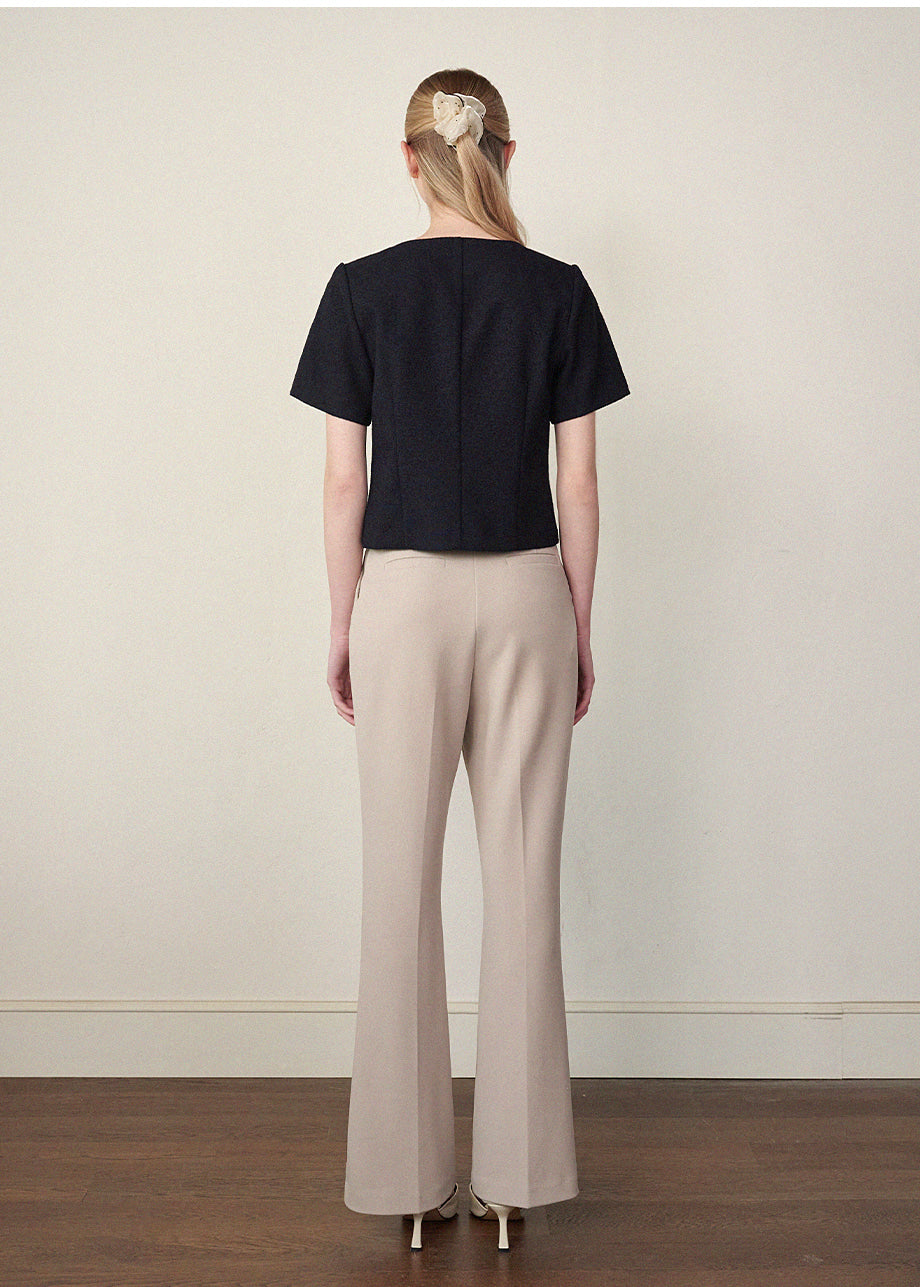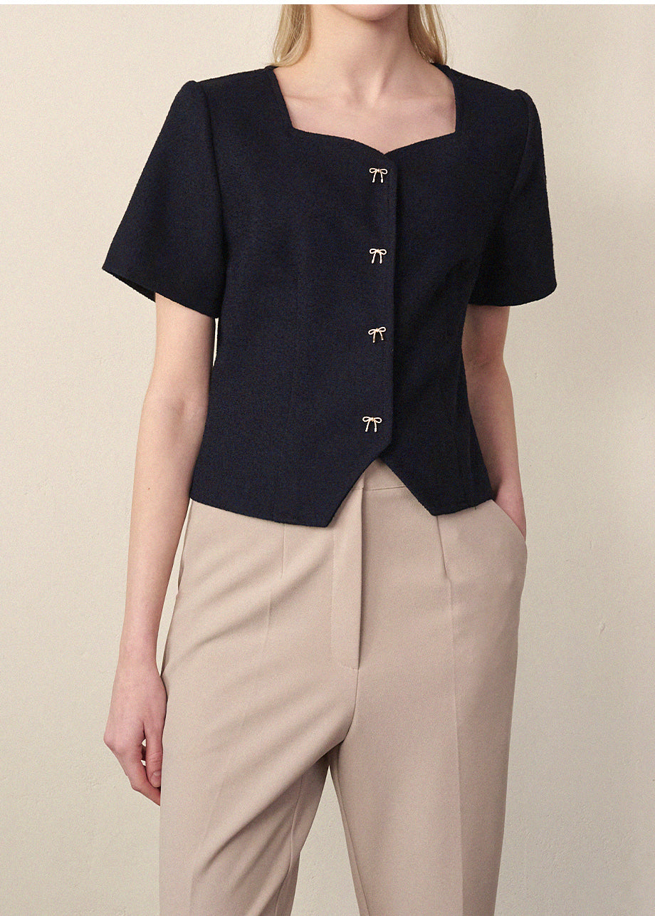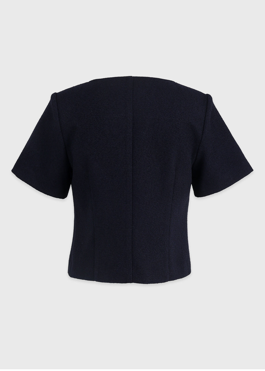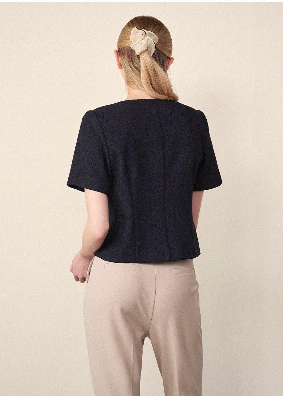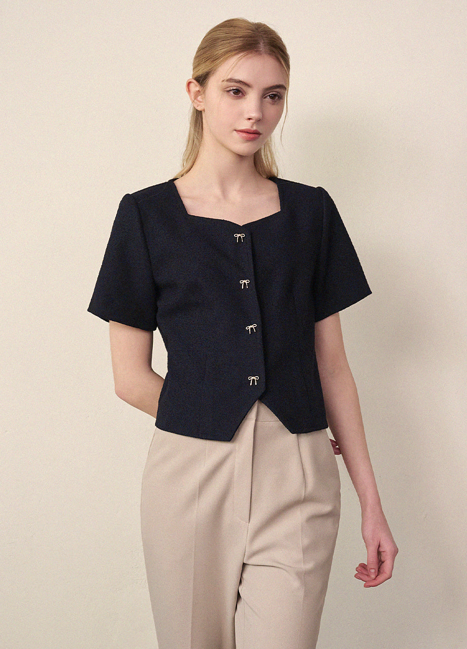 洗練されたラブリームードのジャケットです。しっかりとしたツイード素材でフィット感とクオリティを高め、セミクロップ丈のそっとゆったりしたシルエットで様々なコーデに活用できます。