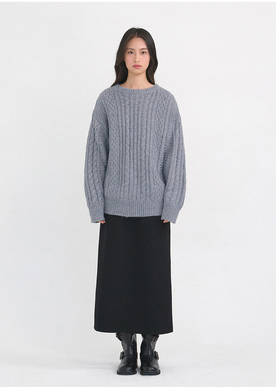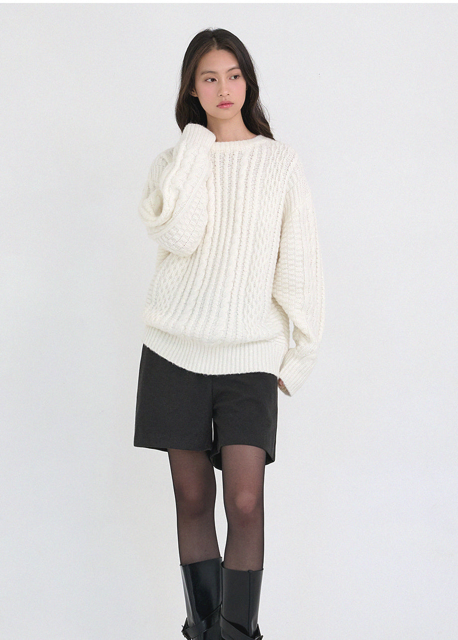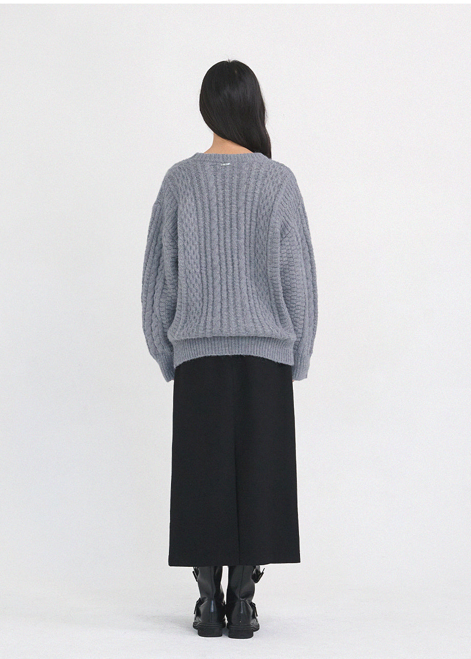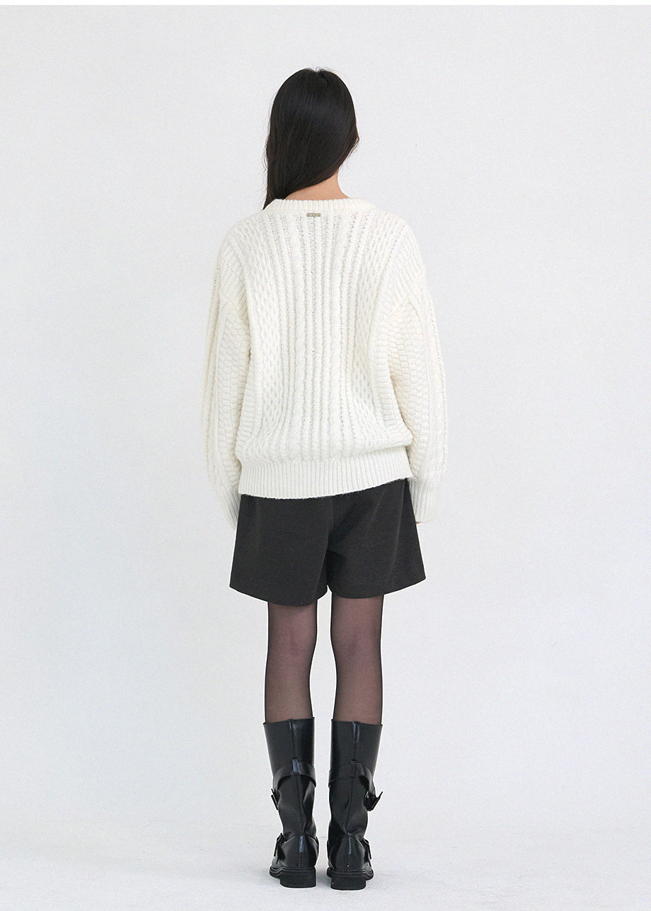 クラシックカジュアルムードのニットです。柔らかく密度の高い高品質なウール混糸を使用し、優れた保温性と快適な着心地が特徴です。コージーな雰囲気のツイスト編みでオーバーフィットに仕上げ、シーズンムードを感じられるスタイリングが楽しめます。しっかりとした編み地で耐久性を高め、長くご愛用いただけます。カジュアルなデザインで単独でもインナーニットとしても多様に活用可能です。バックネック中央にはペンダント風の装飾を加え、上品に仕上げました。*装飾や特殊な素材の製品のため、クリーニング専門店でのお手入れをおすすめいたします。