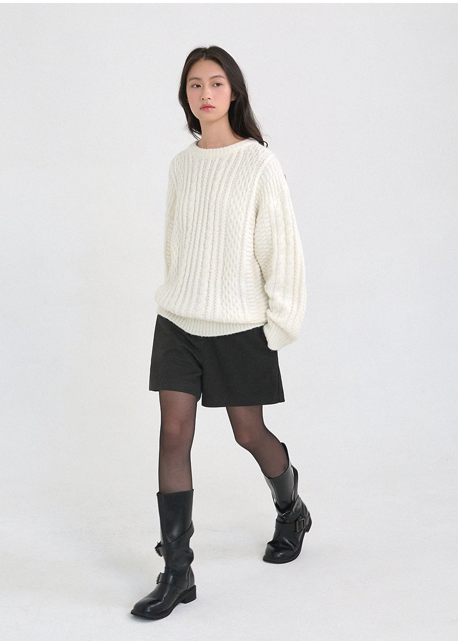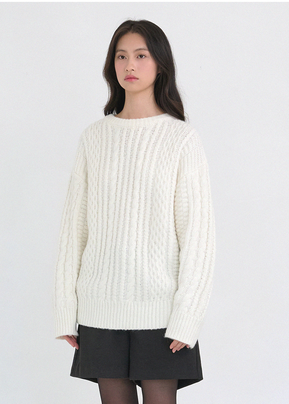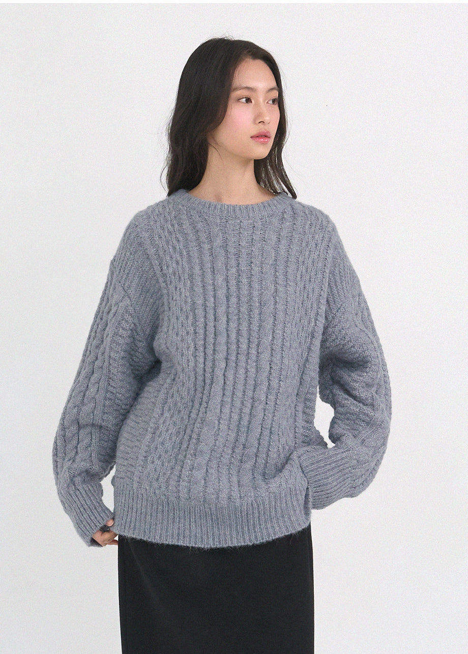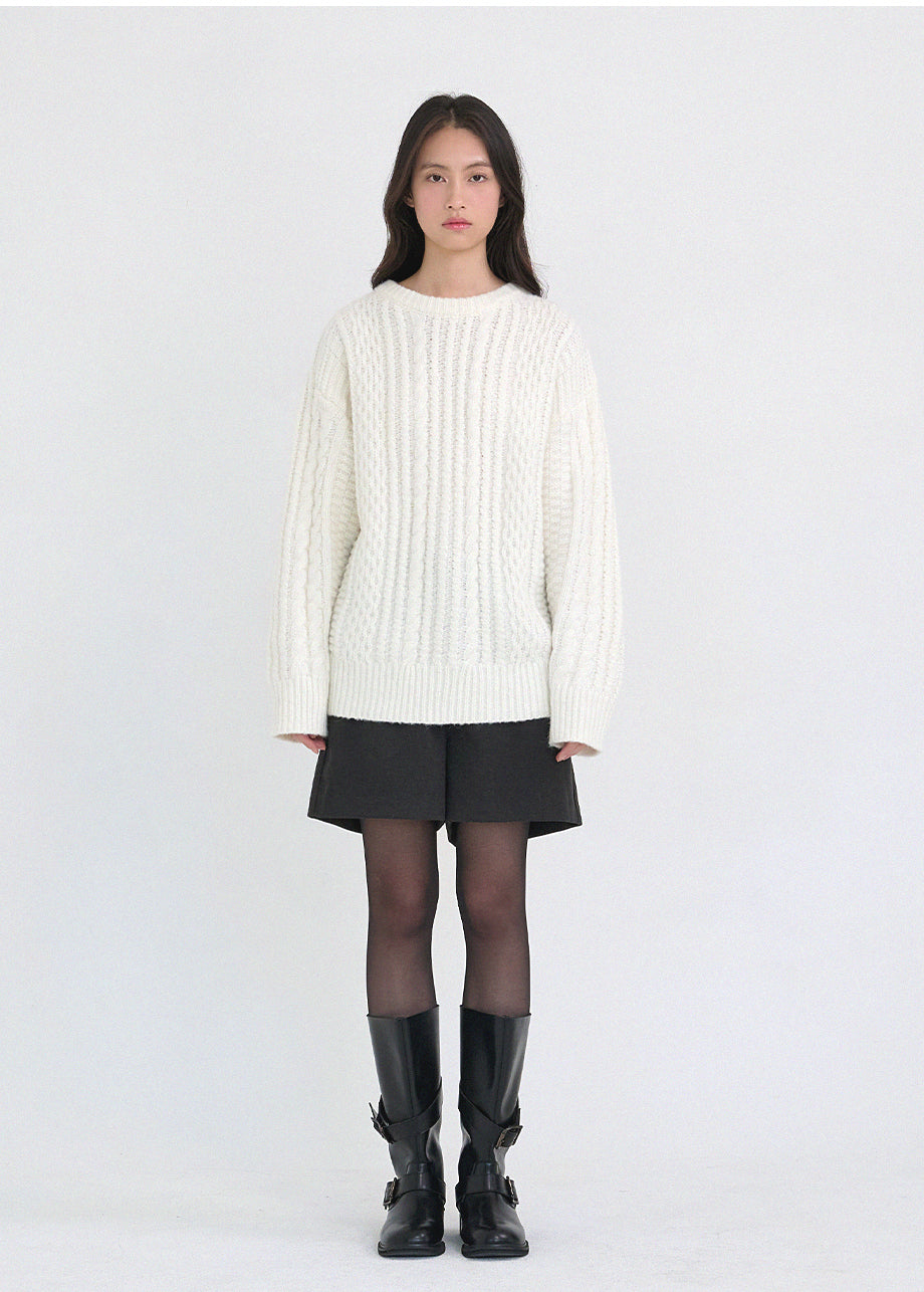 クラシックカジュアルムードのニットです。柔らかく密度の高い高品質なウール混糸を使用し、優れた保温性と快適な着心地が特徴です。コージーな雰囲気のツイスト編みでオーバーフィットに仕上げ、シーズンムードを感じられるスタイリングが楽しめます。しっかりとした編み地で耐久性を高め、長くご愛用いただけます。カジュアルなデザインで単独でもインナーニットとしても多様に活用可能です。バックネック中央にはペンダント風の装飾を加え、上品に仕上げました。*装飾や特殊な素材の製品のため、クリーニング専門店でのお手入れをおすすめいたします。
