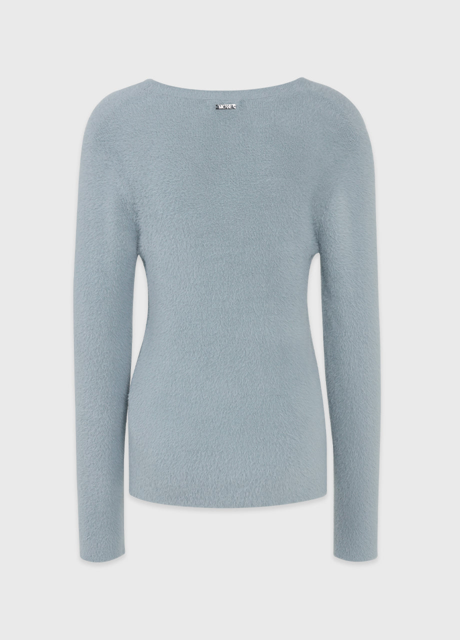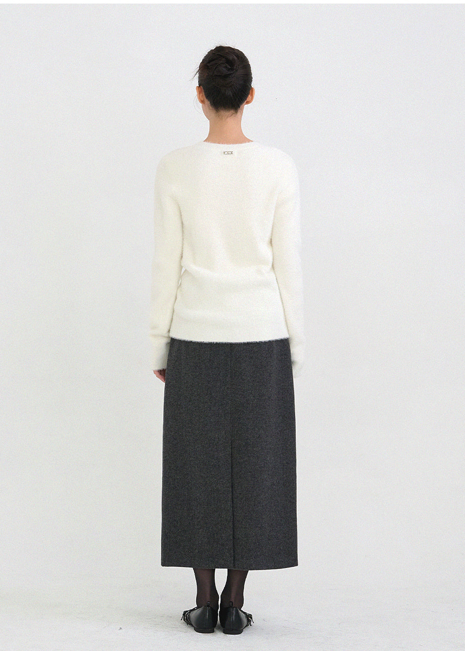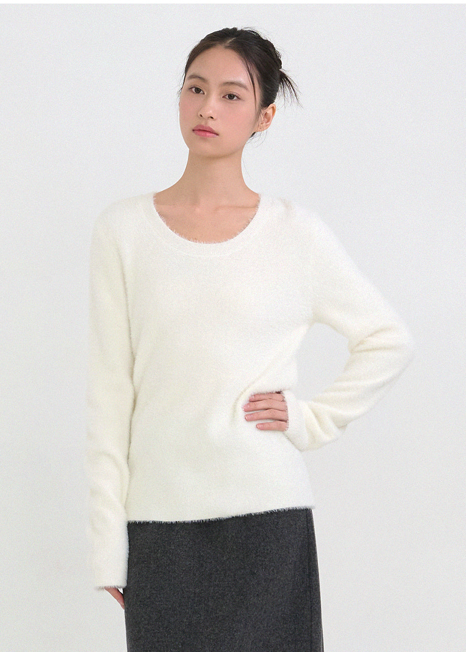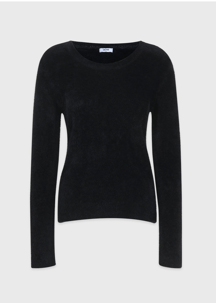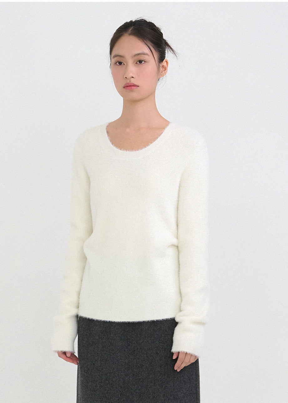 クラシックフェミニンムードのニットです。高級感のあるヘアリー糸を使用し、刺激のない柔らかく温かな着心地が特徴です。ヘアリー糸特有の毛抜けがほとんどなく、お手入れも簡単です。ボディラインを拾わないスリムルーズフィットに、控えめなUネックデザインで、さまざまなアウターのインナーとしてポイント使いにおすすめです。細やかな編み仕上げで長くご愛用いただけます。ベーシックなデザインで幅広いコーディネートが可能です。バックネック中央にはペンダント風の装飾を加え、上品に仕上げました。*装飾や特殊なデザインが施された製品のため、クリーニング専門店でのお手入れをおすすめいたします。