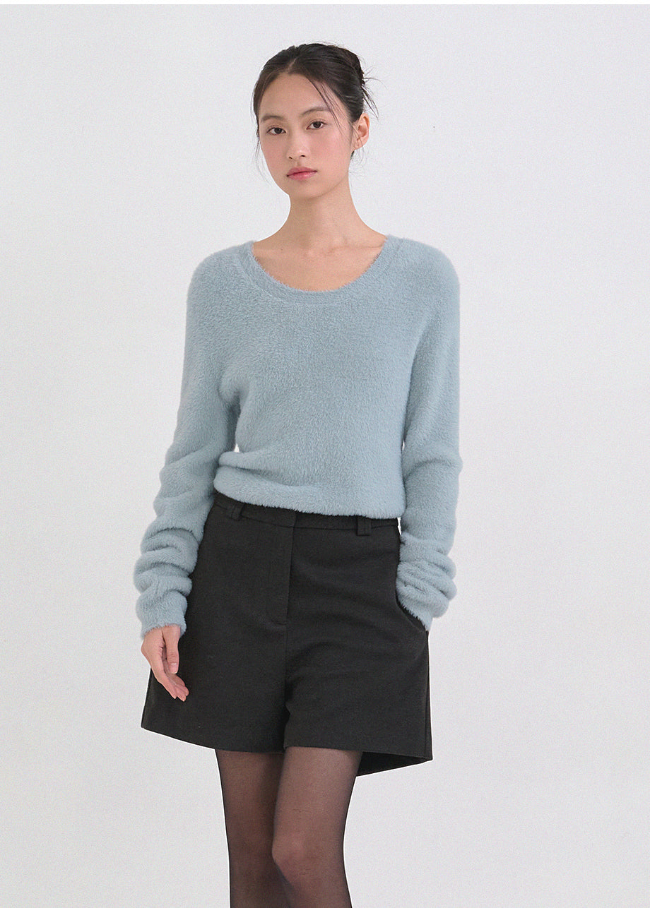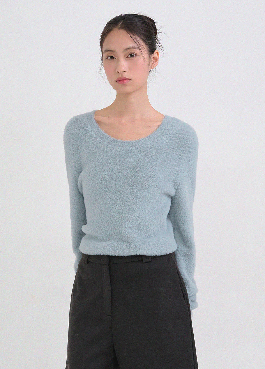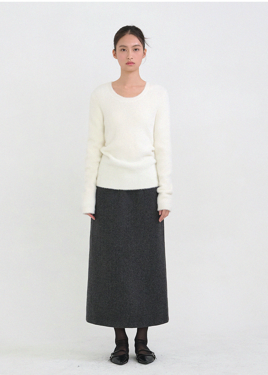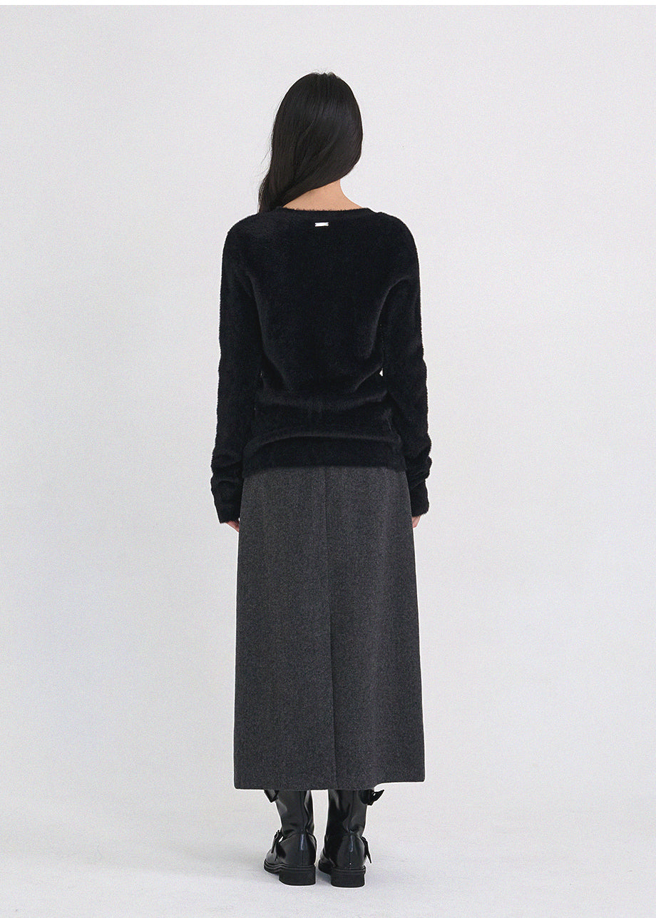 クラシックフェミニンムードのニットです。高級感のあるヘアリー糸を使用し、刺激のない柔らかく温かな着心地が特徴です。ヘアリー糸特有の毛抜けがほとんどなく、お手入れも簡単です。ボディラインを拾わないスリムルーズフィットに、控えめなUネックデザインで、さまざまなアウターのインナーとしてポイント使いにおすすめです。細やかな編み仕上げで長くご愛用いただけます。ベーシックなデザインで幅広いコーディネートが可能です。バックネック中央にはペンダント風の装飾を加え、上品に仕上げました。*装飾や特殊なデザインが施された製品のため、クリーニング専門店でのお手入れをおすすめいたします。