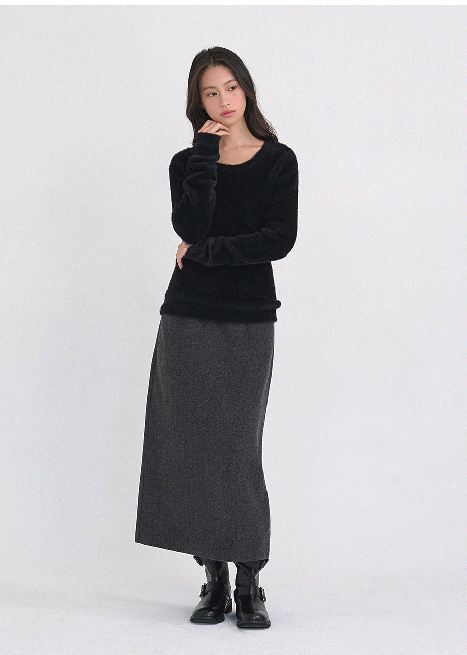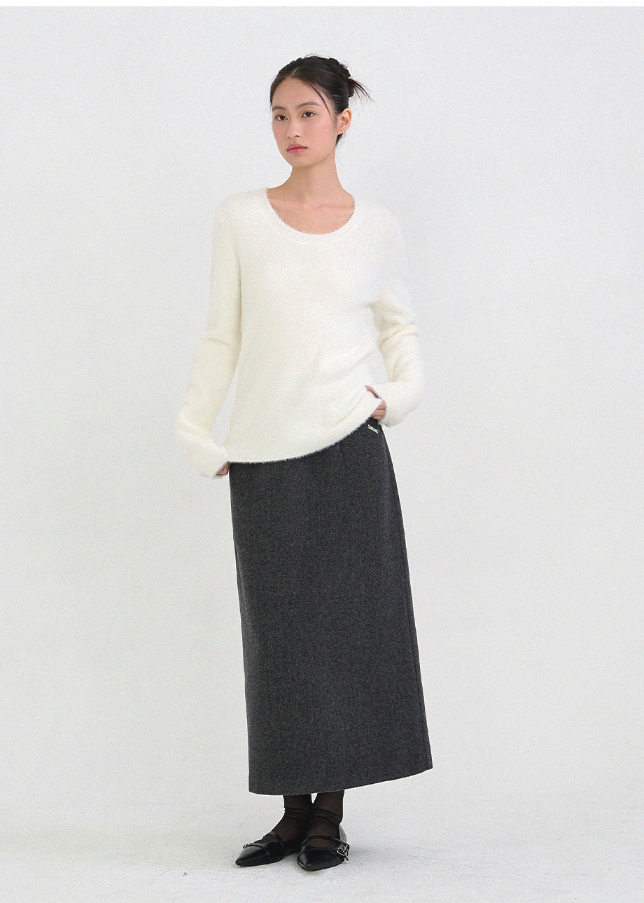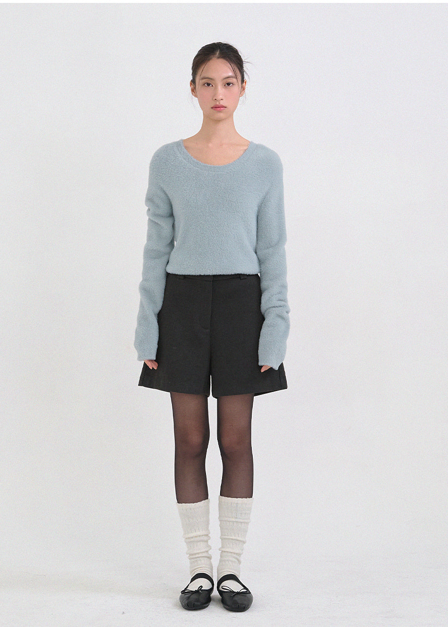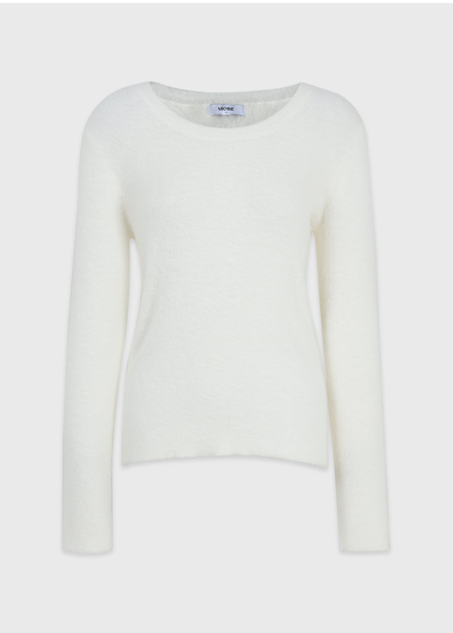 クラシックフェミニンムードのニットです。高級感のあるヘアリー糸を使用し、刺激のない柔らかく温かな着心地が特徴です。ヘアリー糸特有の毛抜けがほとんどなく、お手入れも簡単です。ボディラインを拾わないスリムルーズフィットに、控えめなUネックデザインで、さまざまなアウターのインナーとしてポイント使いにおすすめです。細やかな編み仕上げで長くご愛用いただけます。ベーシックなデザインで幅広いコーディネートが可能です。バックネック中央にはペンダント風の装飾を加え、上品に仕上げました。*装飾や特殊なデザインが施された製品のため、クリーニング専門店でのお手入れをおすすめいたします。