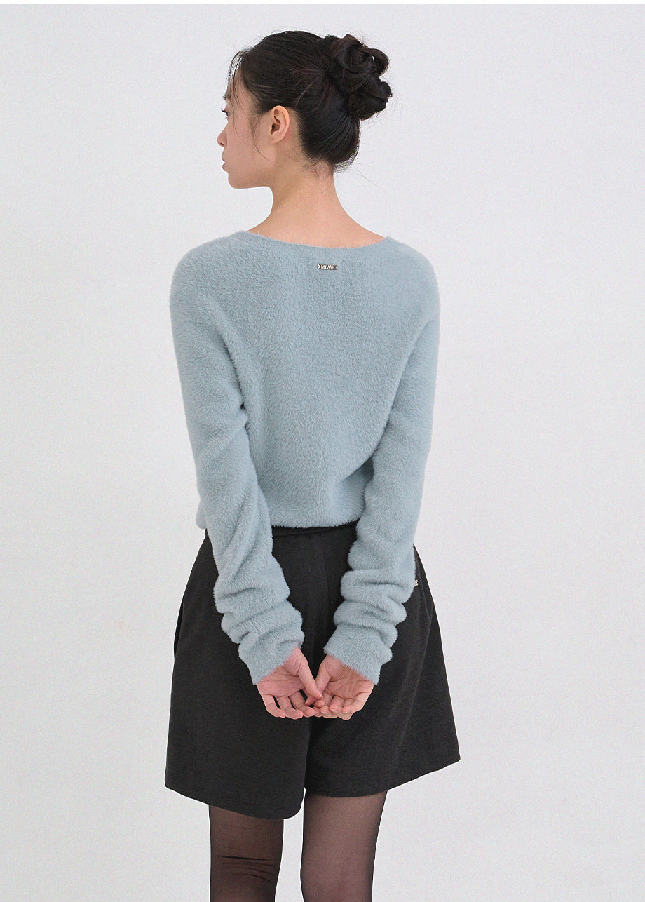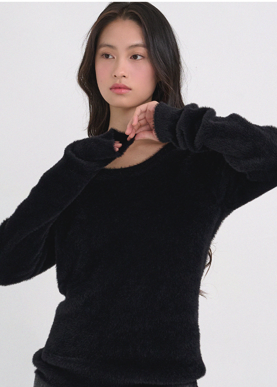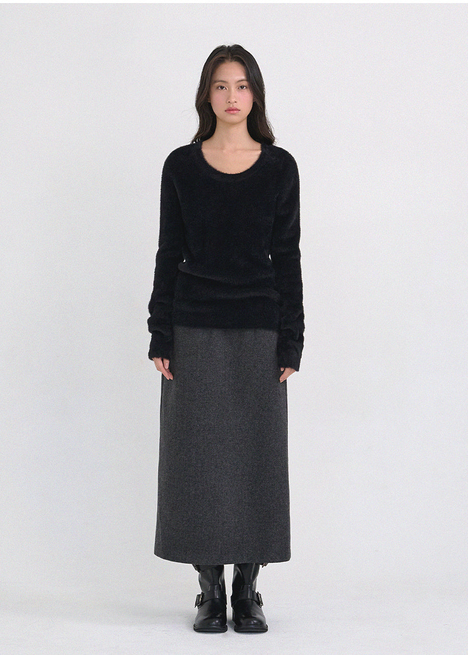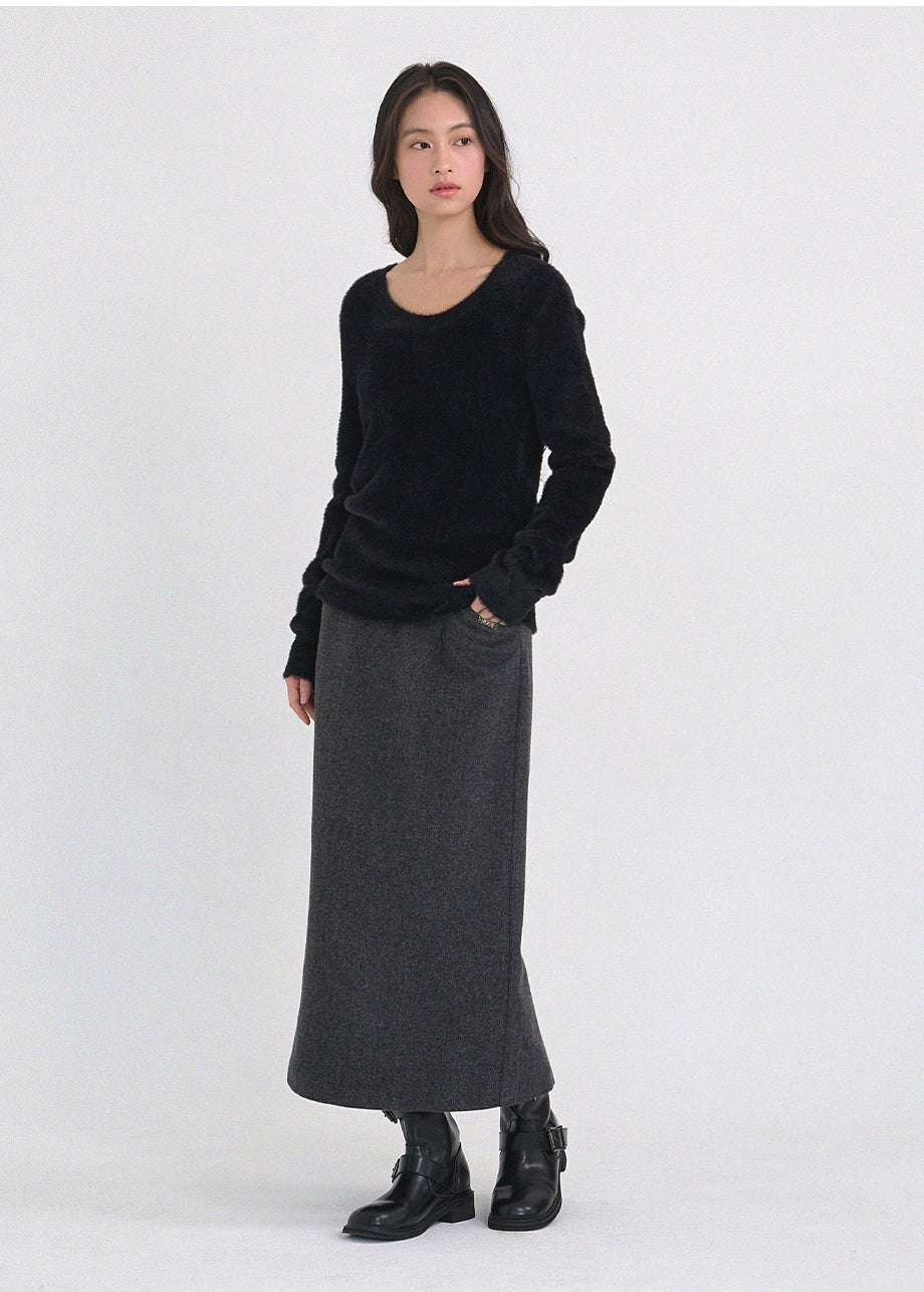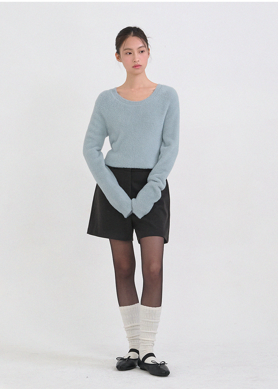 クラシックフェミニンムードのニットです。高級感のあるヘアリー糸を使用し、刺激のない柔らかく温かな着心地が特徴です。ヘアリー糸特有の毛抜けがほとんどなく、お手入れも簡単です。ボディラインを拾わないスリムルーズフィットに、控えめなUネックデザインで、さまざまなアウターのインナーとしてポイント使いにおすすめです。細やかな編み仕上げで長くご愛用いただけます。ベーシックなデザインで幅広いコーディネートが可能です。バックネック中央にはペンダント風の装飾を加え、上品に仕上げました。*装飾や特殊なデザインが施された製品のため、クリーニング専門店でのお手入れをおすすめいたします。