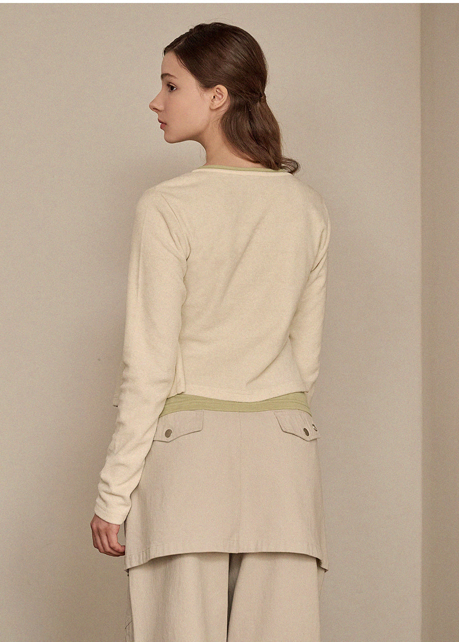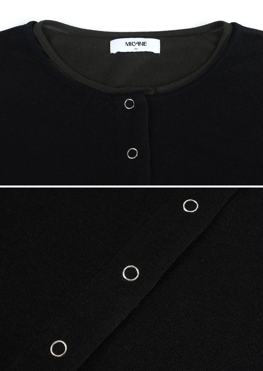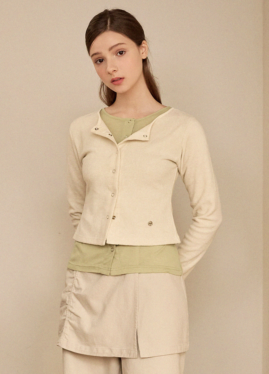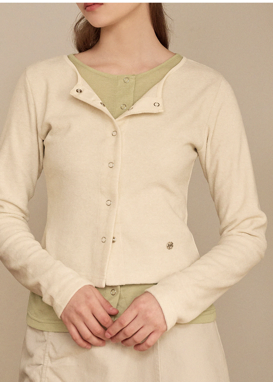 デイリーユニークムードのレイヤードカーディガンです。裏地には透け感のある柔らかい素材を、表地には適度な厚みのテリー素材を使用し、ムードと保温性を兼ね備えました。