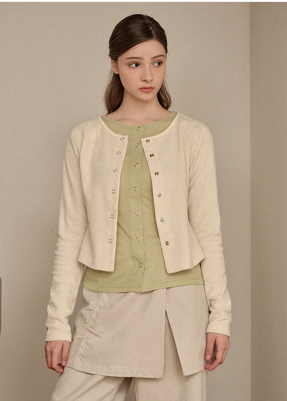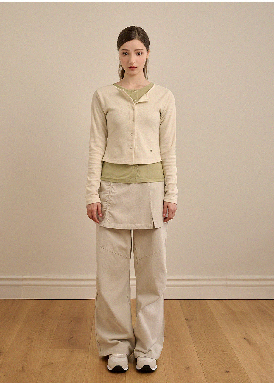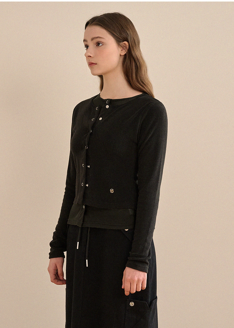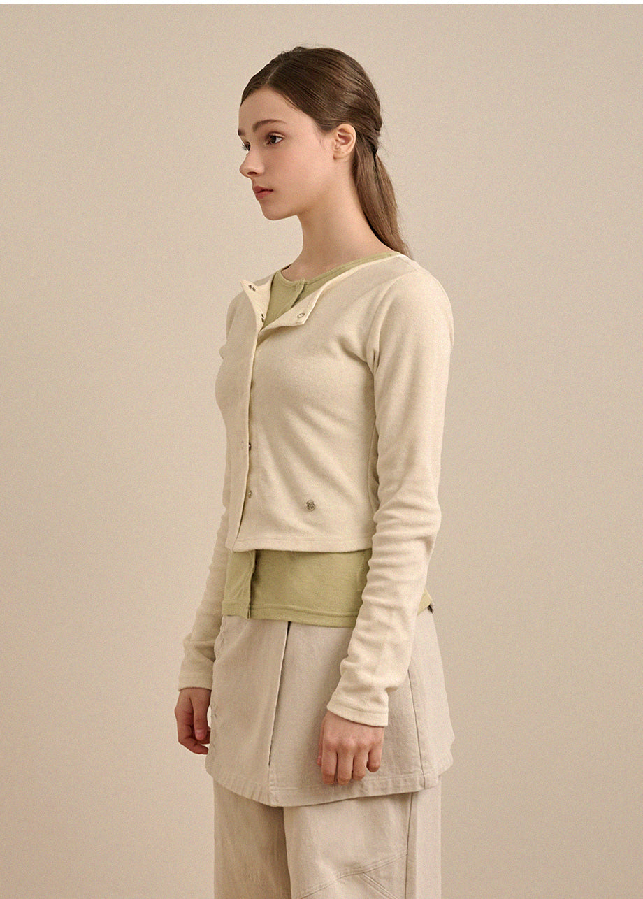 デイリーユニークムードのレイヤードカーディガンです。裏地には透け感のある柔らかい素材を、表地には適度な厚みのテリー素材を使用し、ムードと保温性を兼ね備えました。
