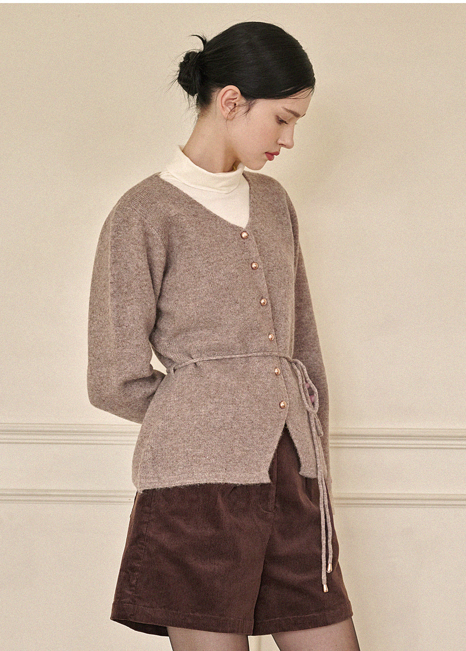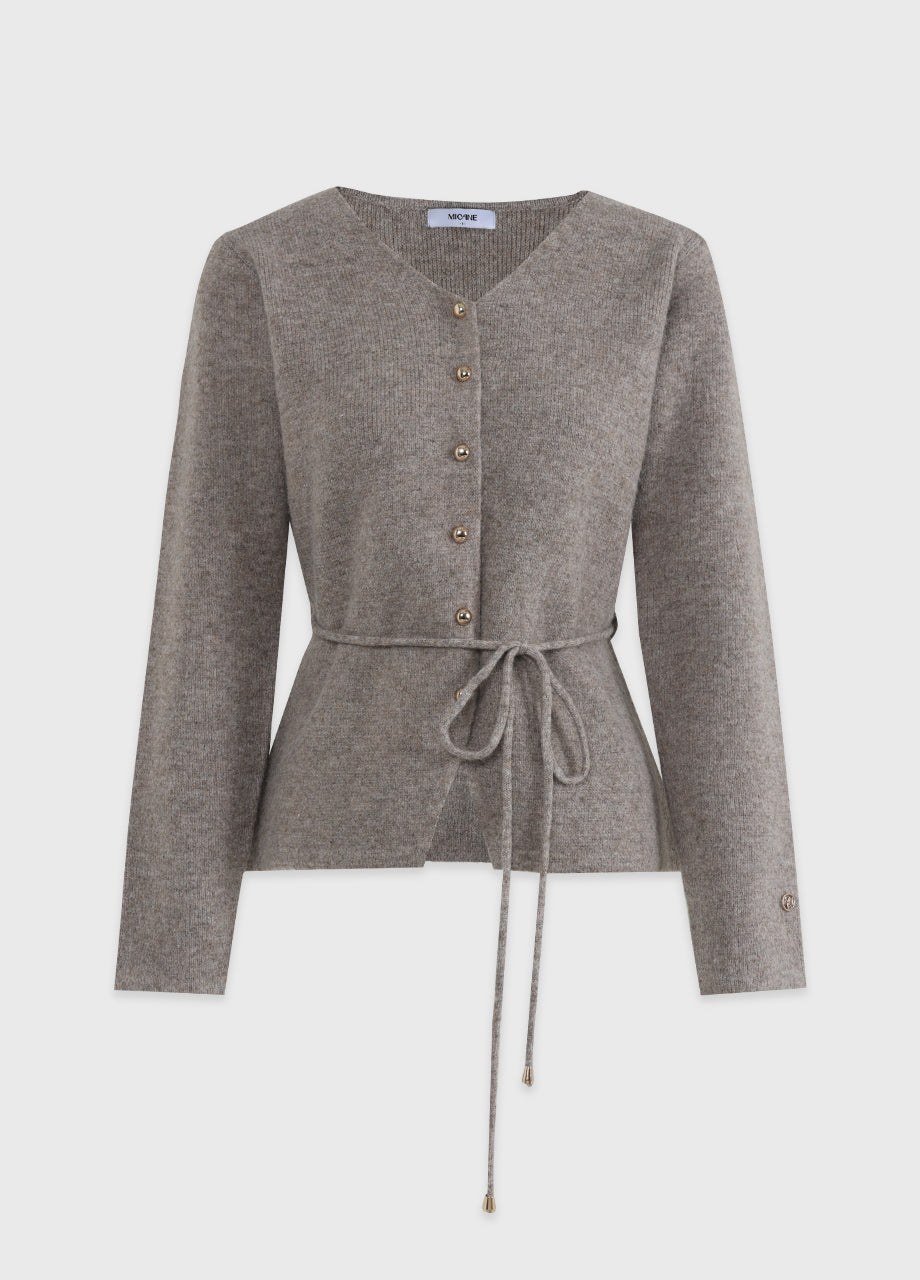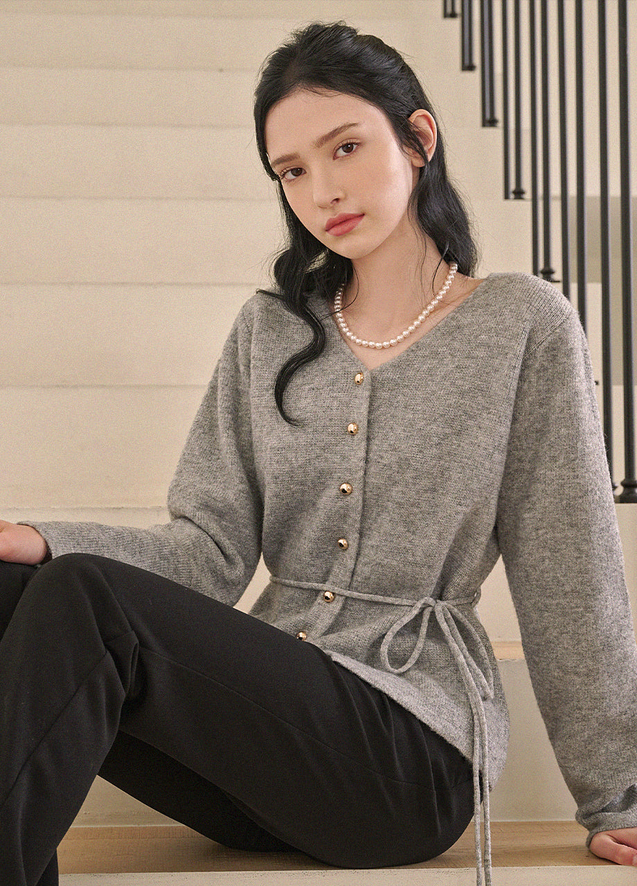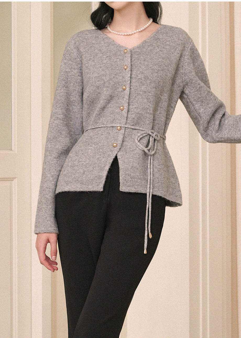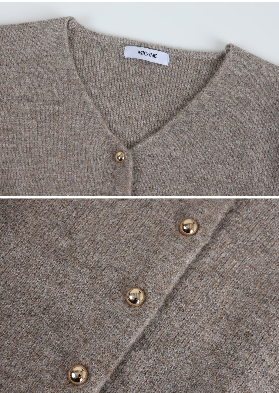 高級感のあるムードで着用できるカーディガンです。ウール混の高密度な編み糸を使い、クォリティーを高めました。ヒップまで覆う丈とVネックでフェミニンな印象をプラス。