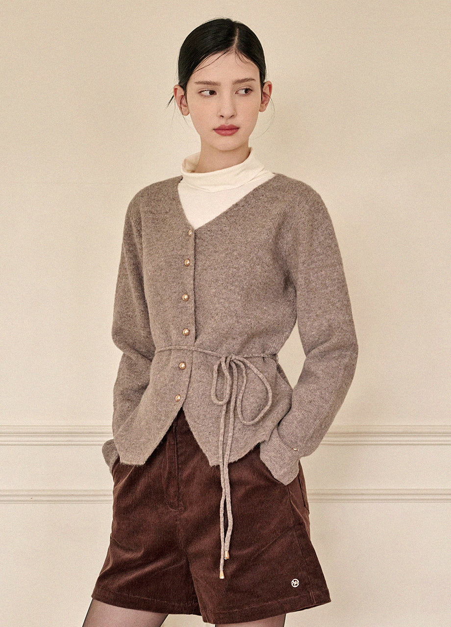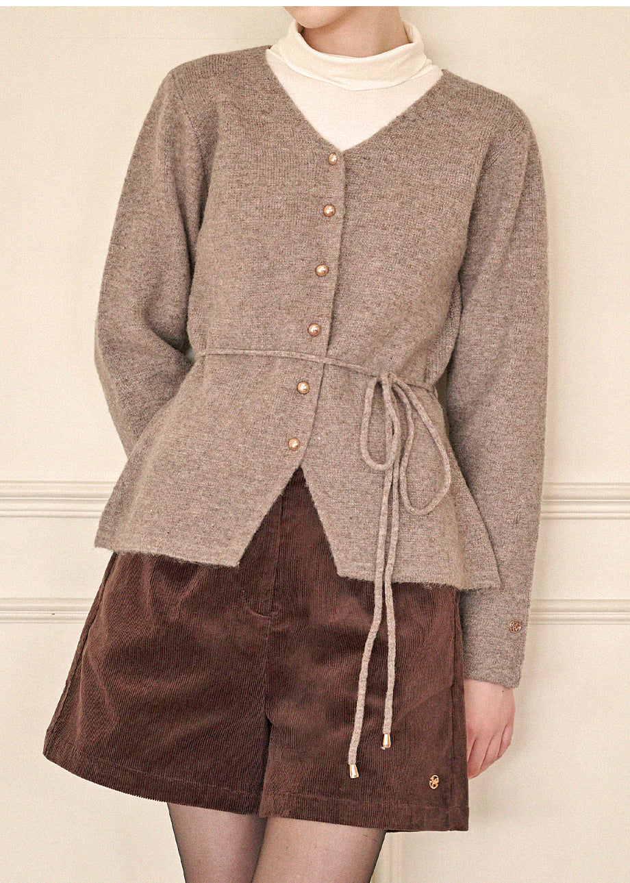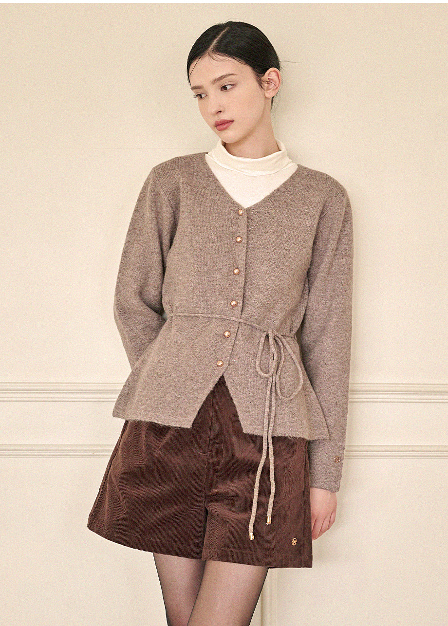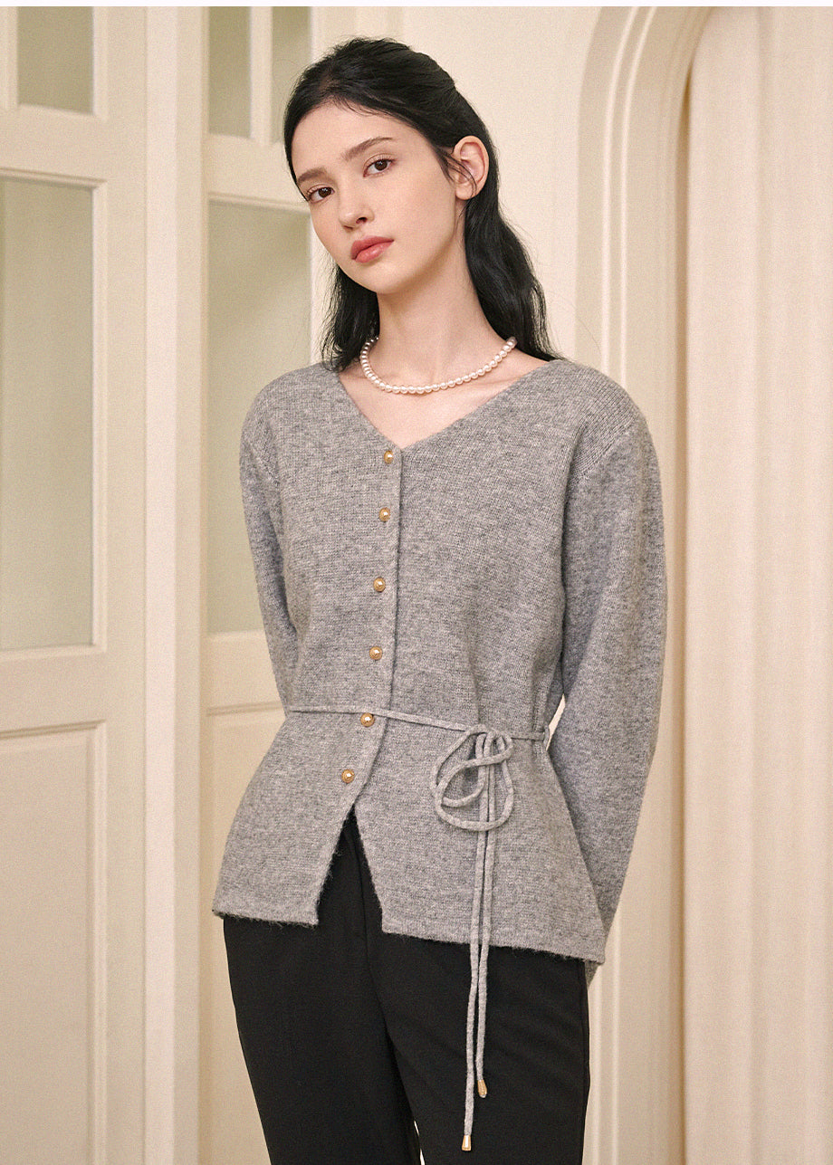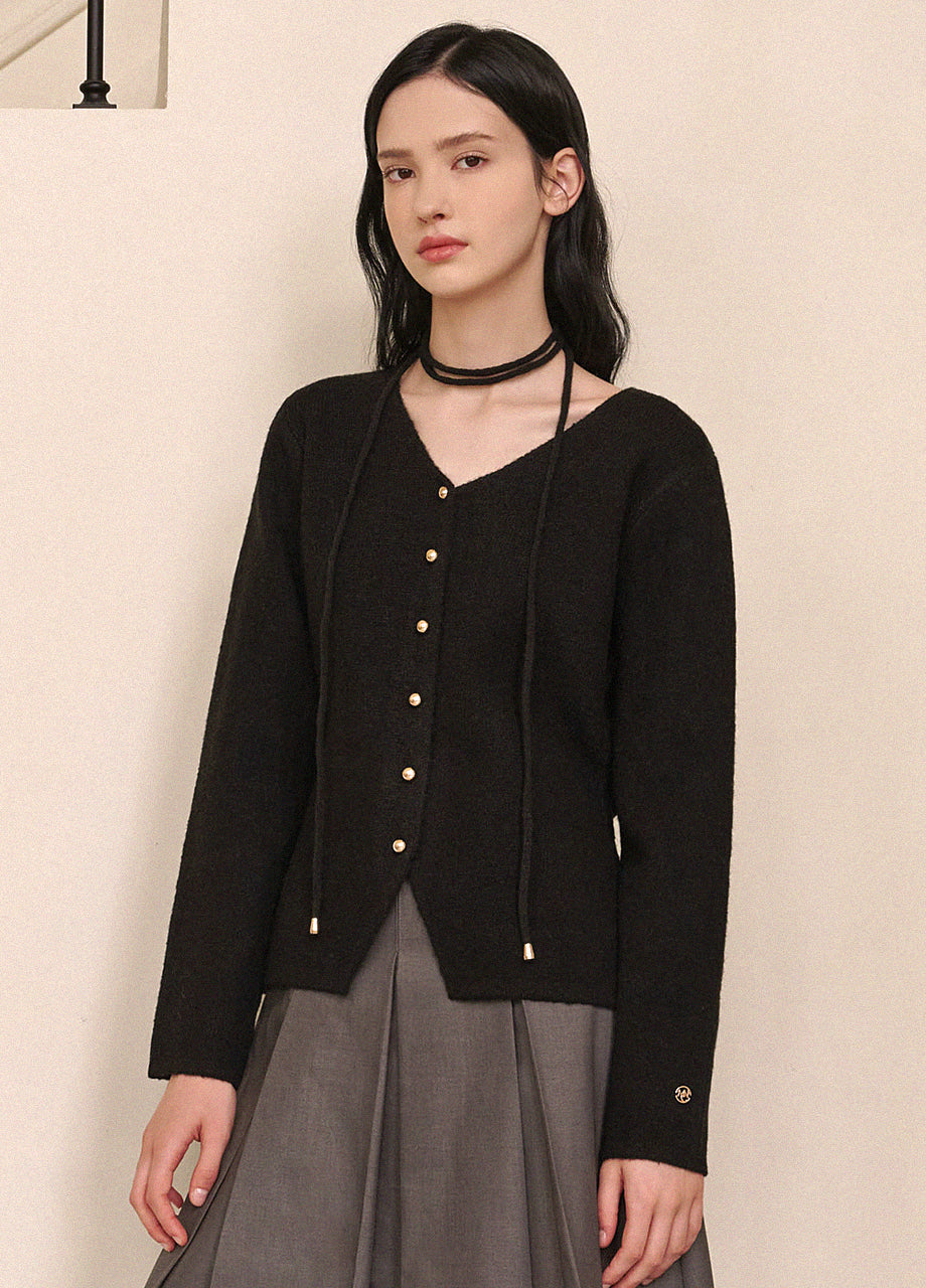 高級感のあるムードで着用できるカーディガンです。ウール混の高密度な編み糸を使い、クォリティーを高めました。ヒップまで覆う丈とVネックでフェミニンな印象をプラス。