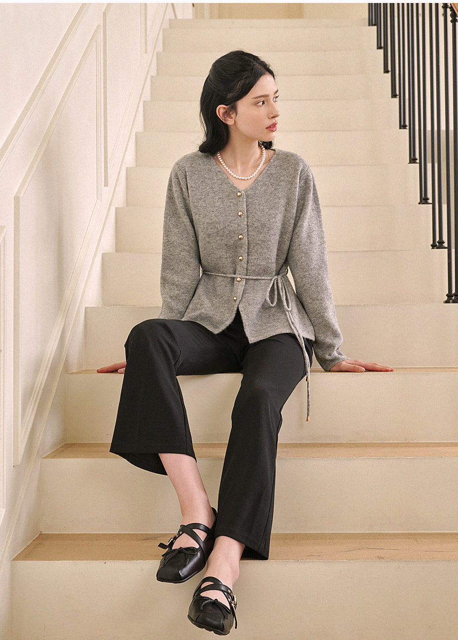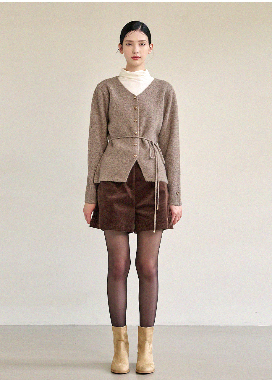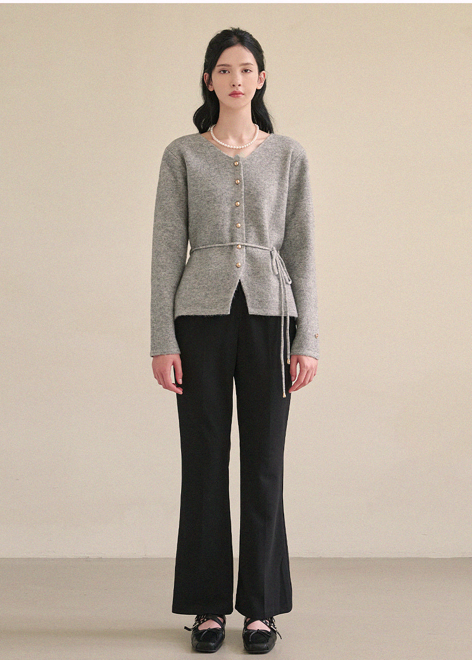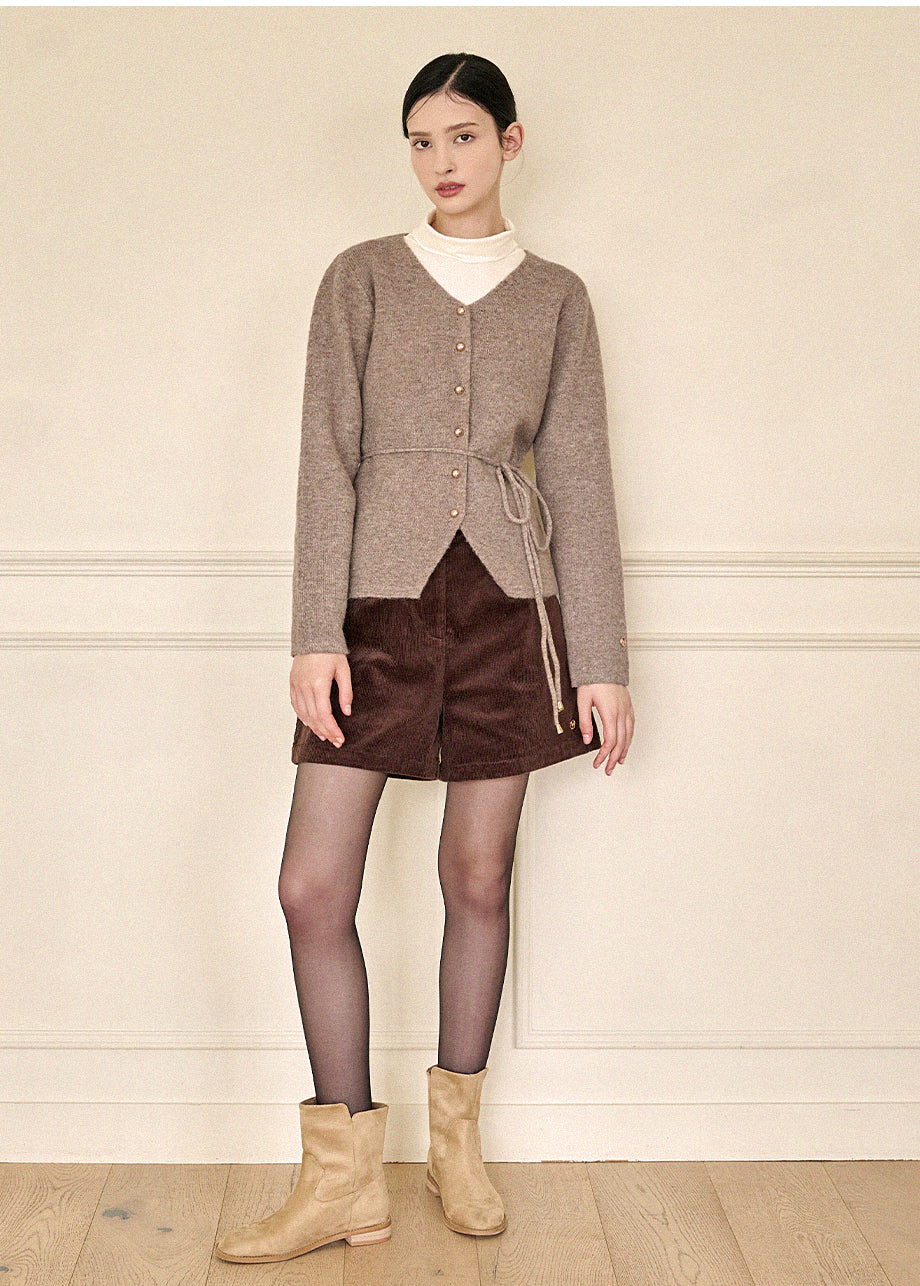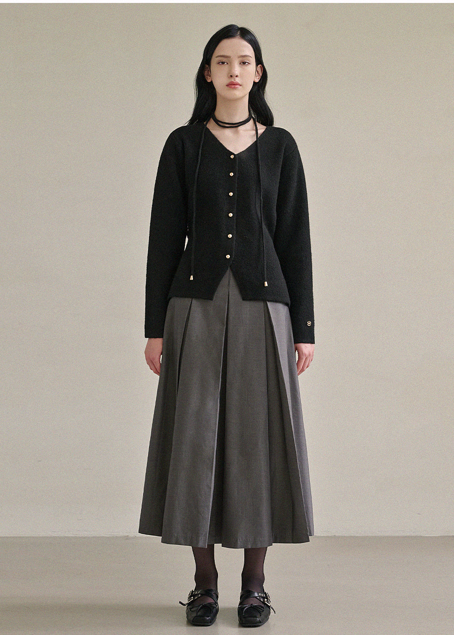 高級感のあるムードで着用できるカーディガンです。ウール混の高密度な編み糸を使い、クォリティーを高めました。ヒップまで覆う丈とVネックでフェミニンな印象をプラス。
