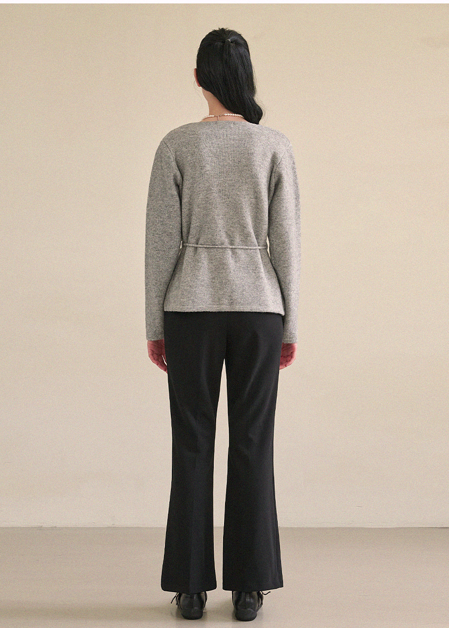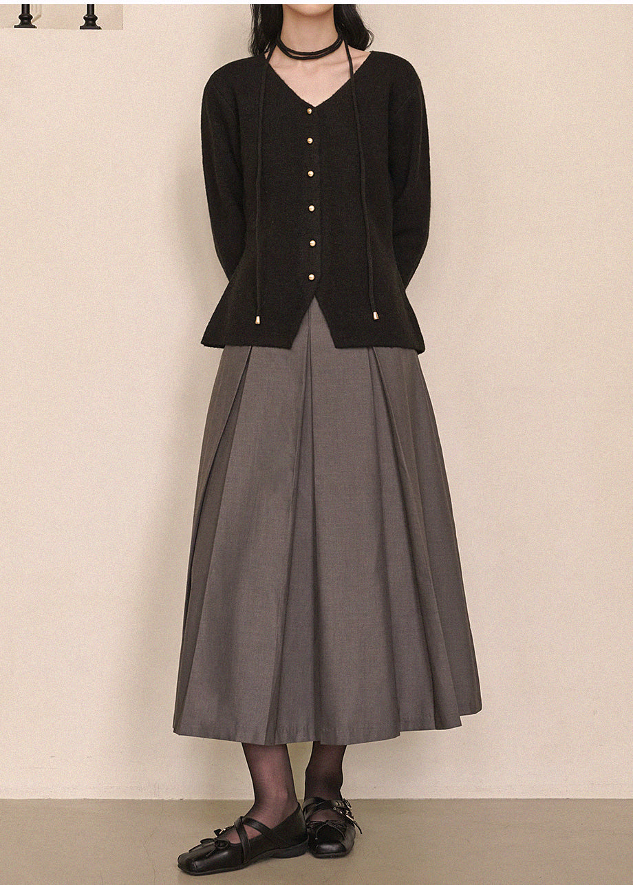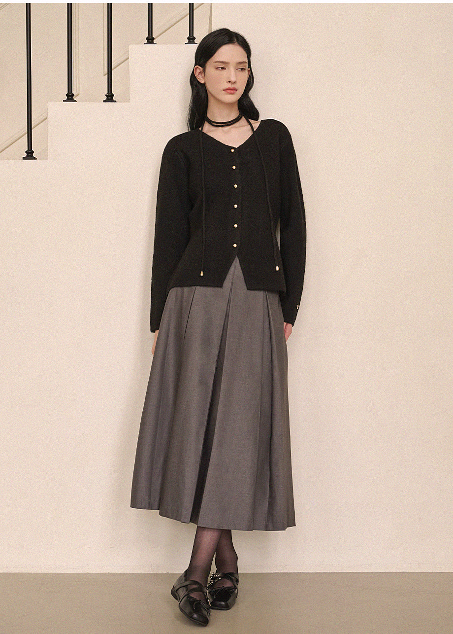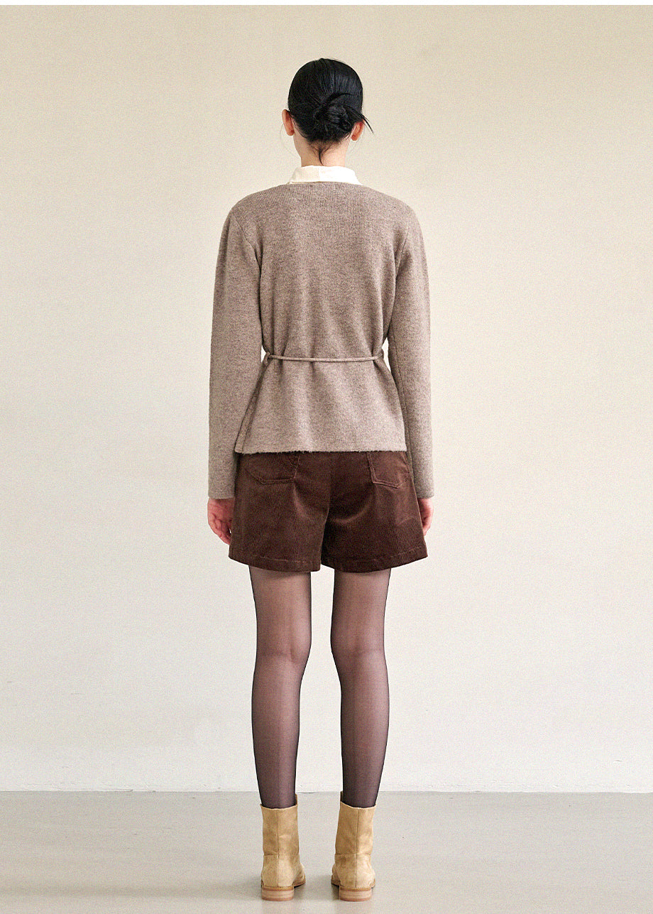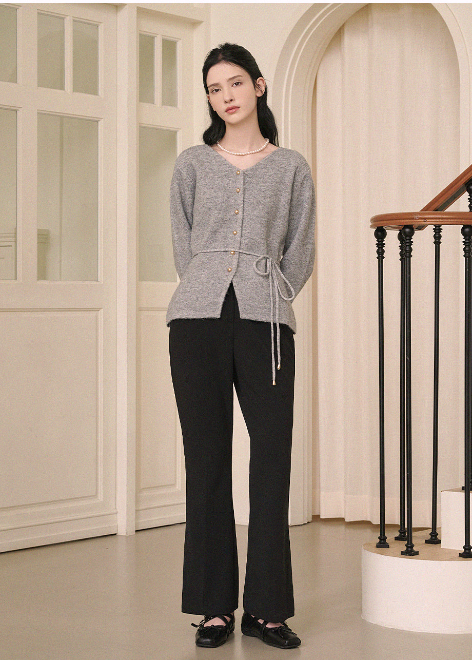 高級感のあるムードで着用できるカーディガンです。ウール混の高密度な編み糸を使い、クォリティーを高めました。ヒップまで覆う丈とVネックでフェミニンな印象をプラス。
