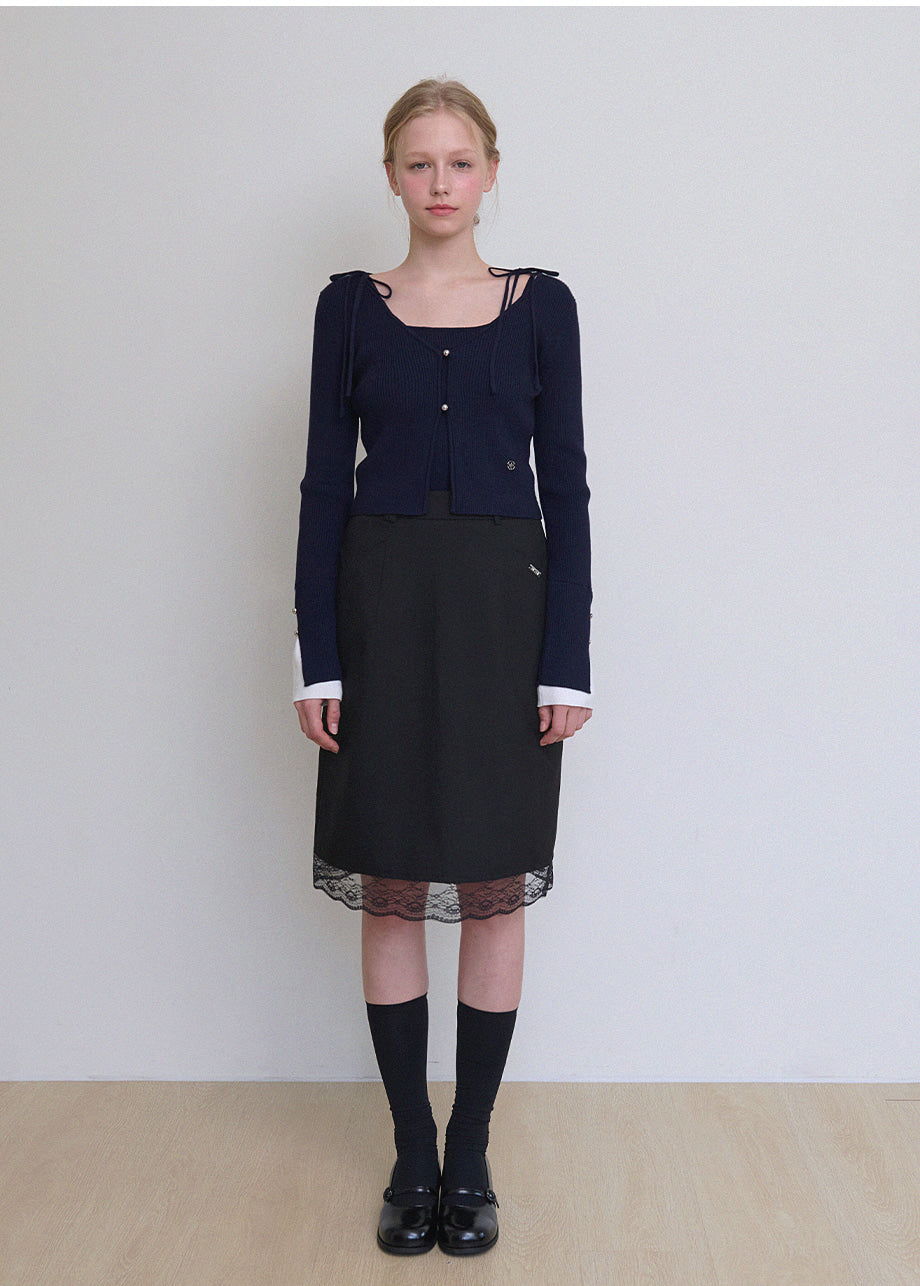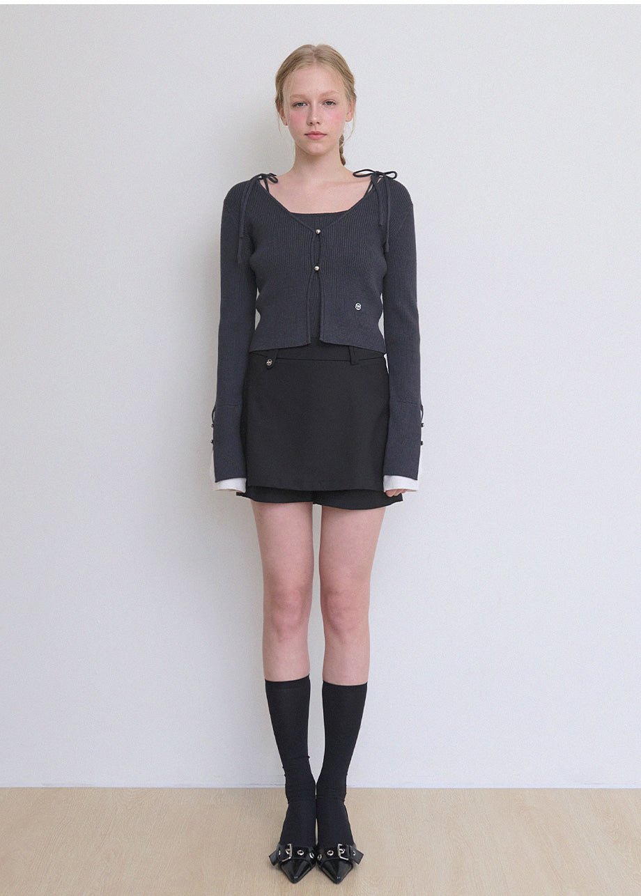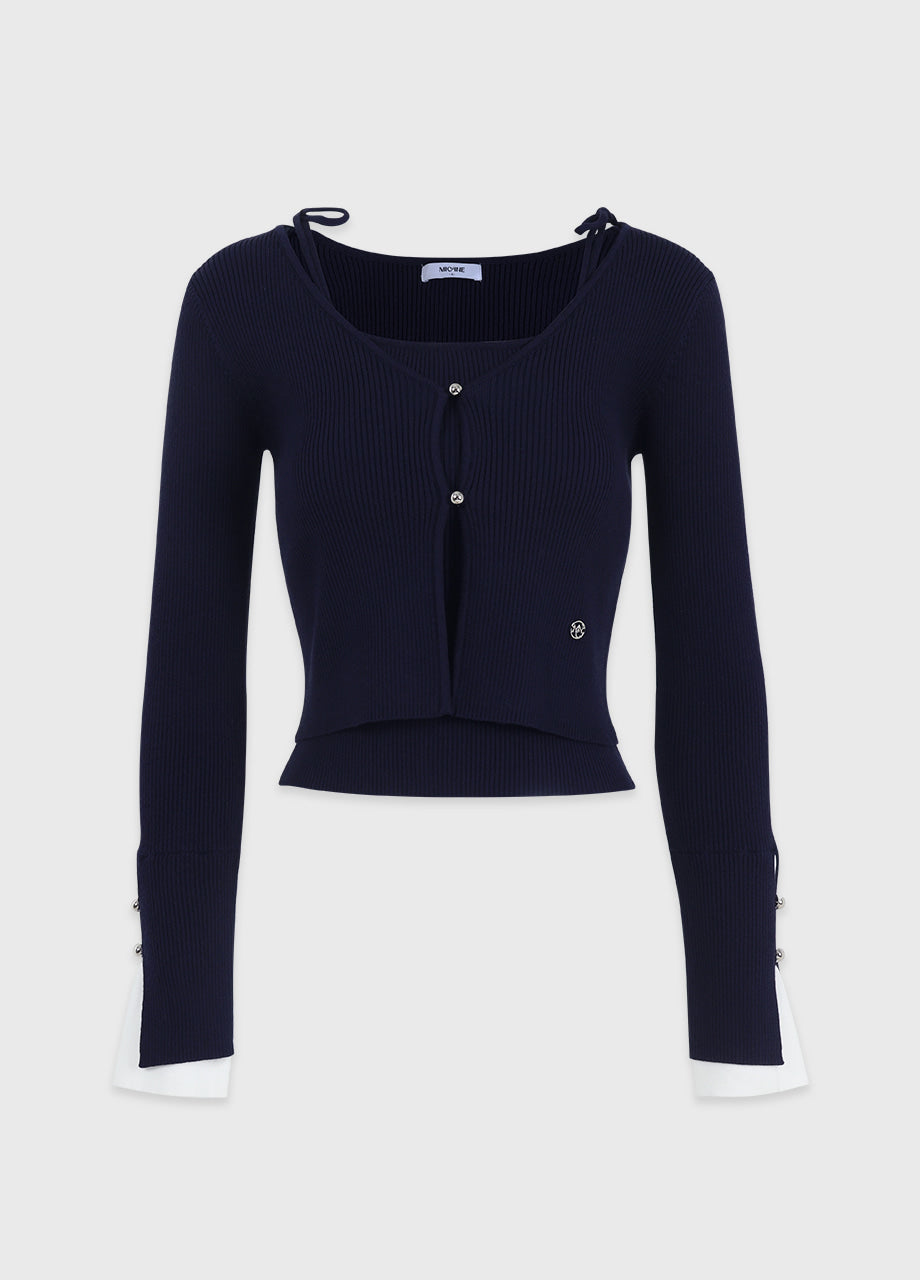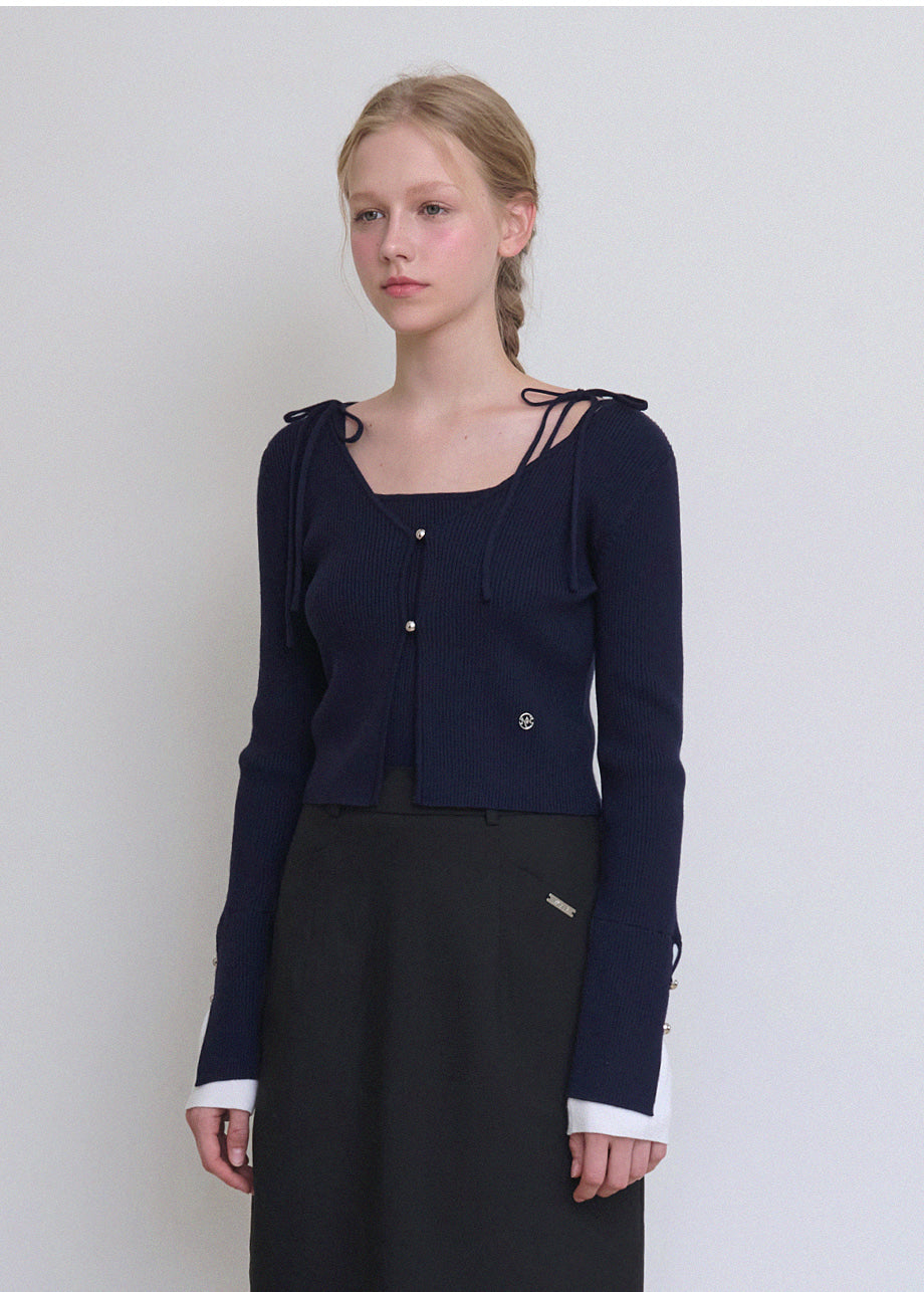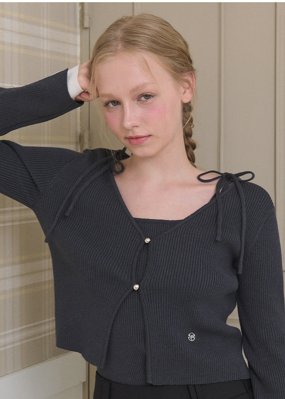 フェミニンムードのカーディガンとスリーブレスのセットアップです。柔らかい肌触りと耐久性と保温性に優れた生地で制作され、暖かくてラクチンな着心地が楽しめます。細かく作られたリブ編みで体型カバーの効果もあります。カーディガンはVネックデザインとセミクロップドの丈感にスリーブレスセットアップで気軽に着やすいアイテムです。袖にはスリットとボタン留めのデザインに配色の前立てをプラスして、女性らしさを際立たせました。スリーブレスの肩ストラップがポイントになり、ネックラインにシンプルすぎずにポイントを与えました。裾のサイドにペンダントを加えてクォリティーを高め、仕上げました。*装飾や特殊なデザインが施された製品のため、クリーニング専門店でのお手入れをおすすめいたします。