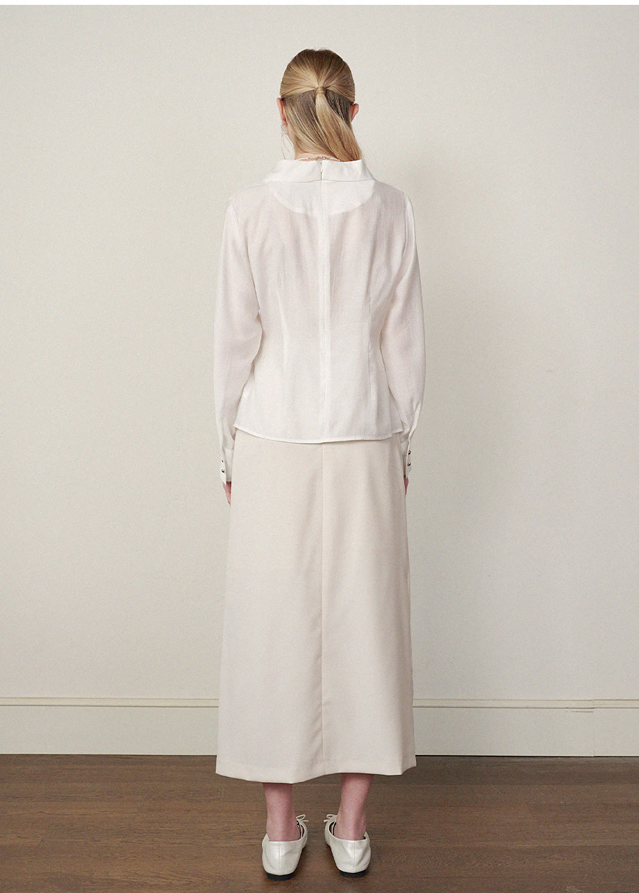 フェミニンムードで着用できるブラウスです。耐久性のあるポリエステルと肌触りの良いアセテートを混紡した生地で、肌への刺激を抑え快適に着用いただけます。