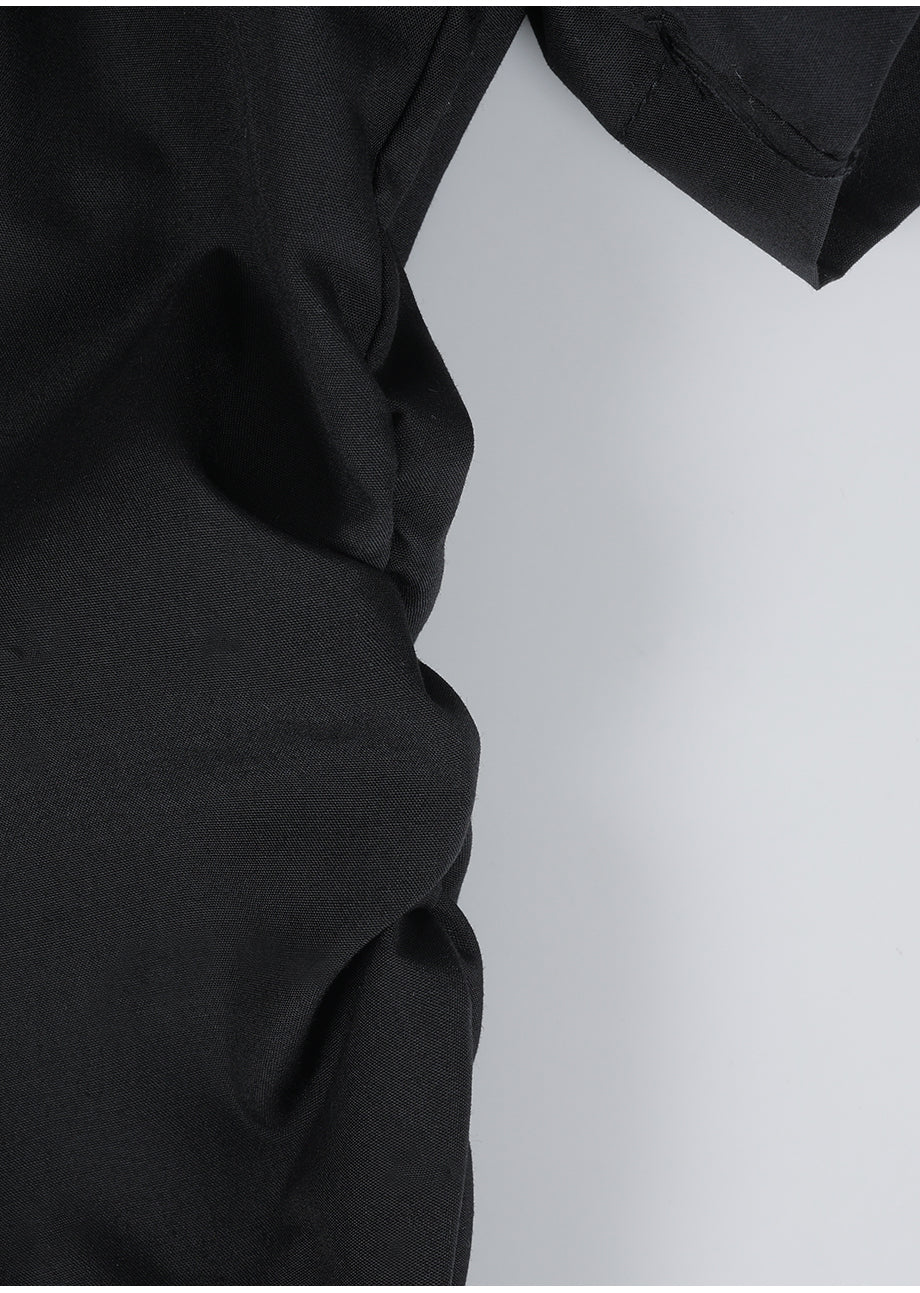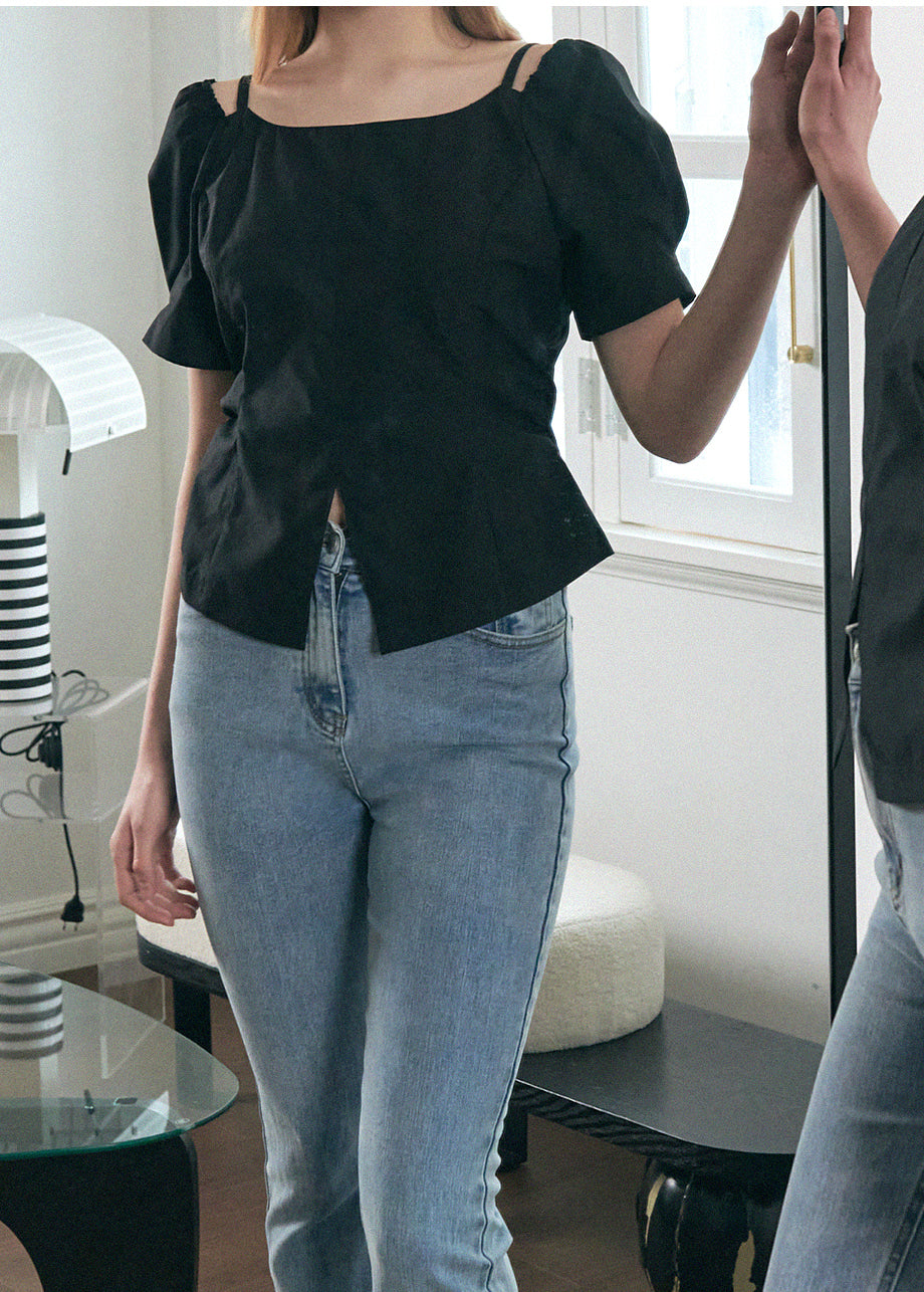 ユニークなフェミニンムードのブラウスです。シワになりにくくしっかりした素材で、快適に着用できます。