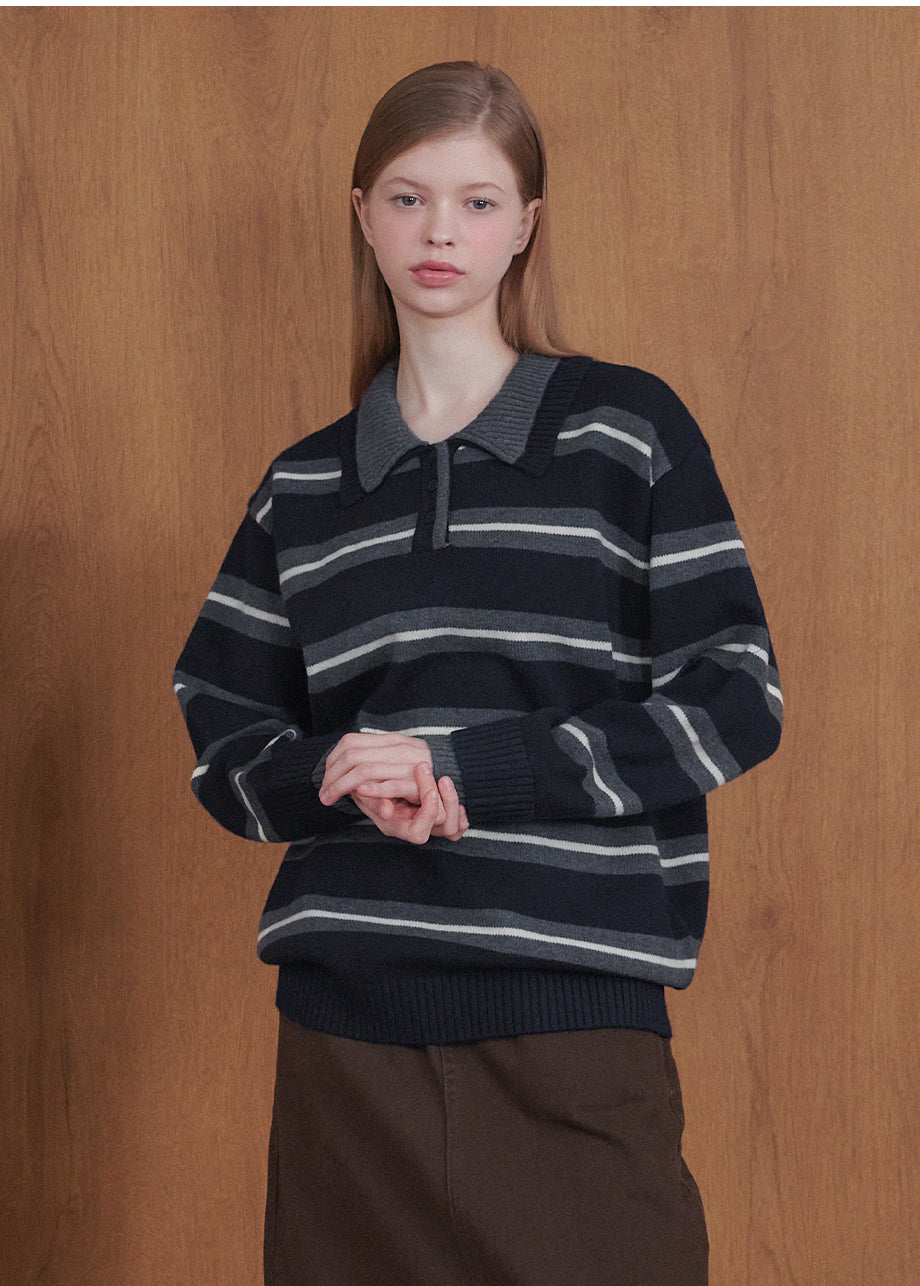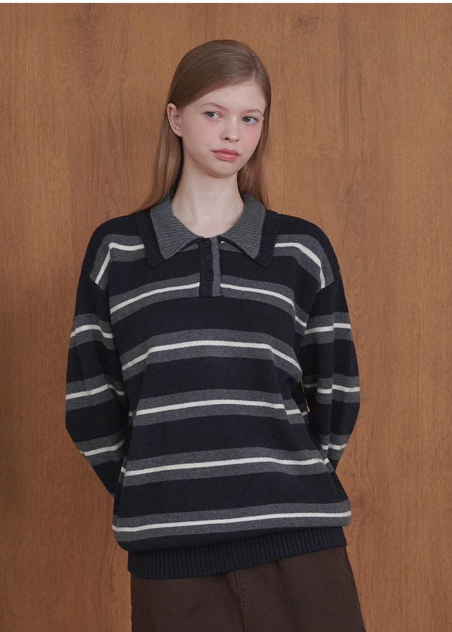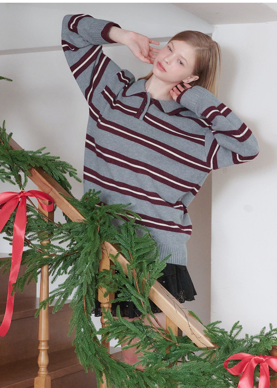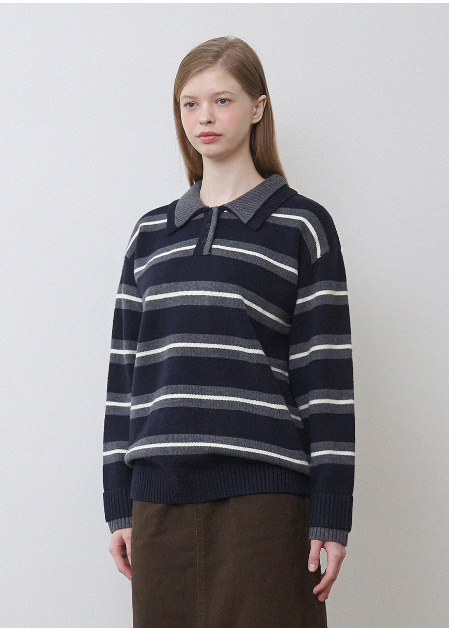 ビンテージカジュアルムードのストライプニットです。柔らかく密度の高いしっかりとした糸を使用しており、刺激のない暖かく快適な着心地が魅力です。ほどよくルーズなフィットでさまざまなアイテムと気軽にコーディネートでき、襟元と袖に配色ディテールを加えてレイヤードしたようなヴィンテージ感のあるスタイルを楽しめます。後ろネック中央にペンダント装飾を施し、よりクオリティの高い仕上がりにしました.*装飾や特殊な素材を使用した製品のため、クリーニング専門店でのお手入れをおすすめいたします。
