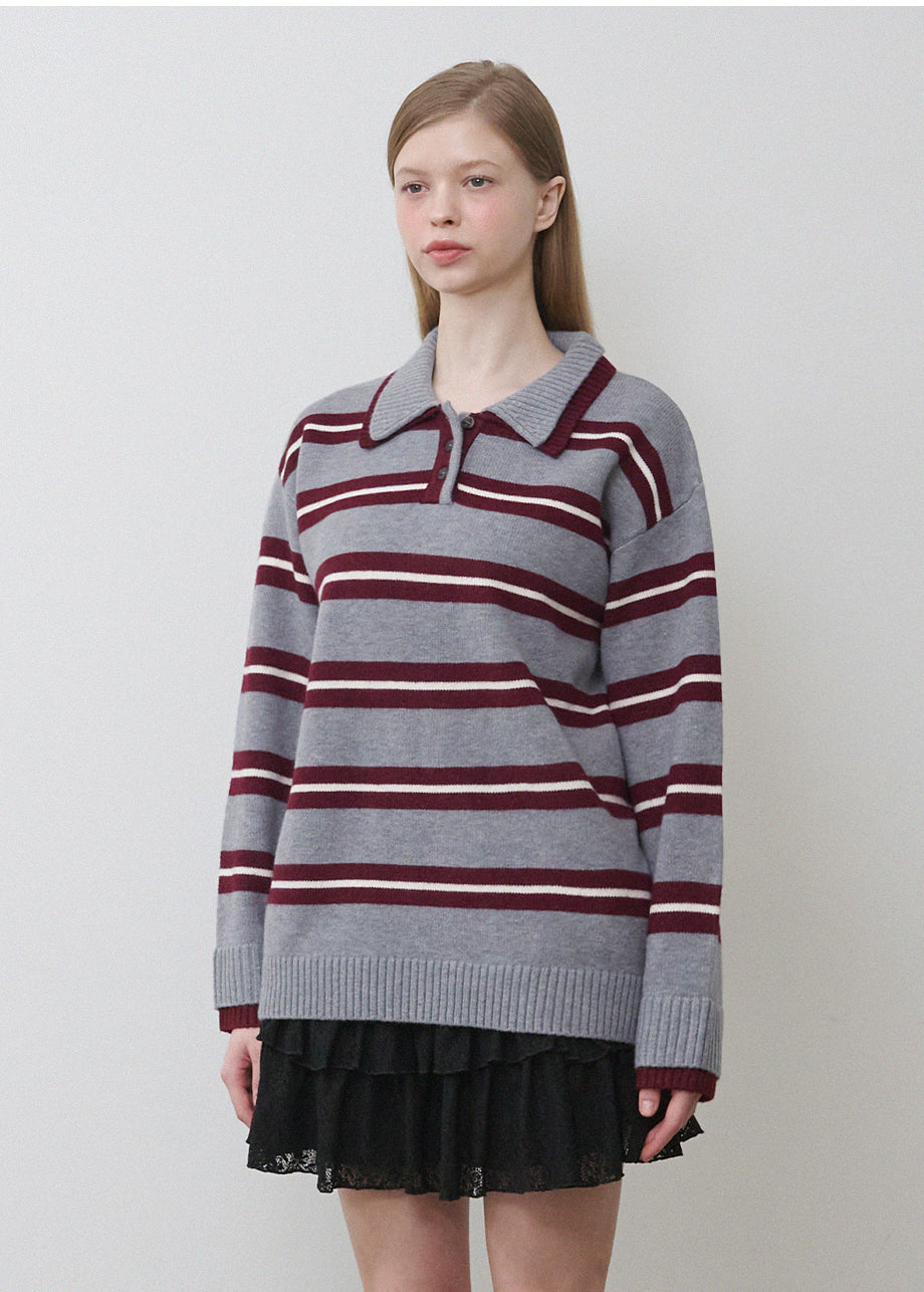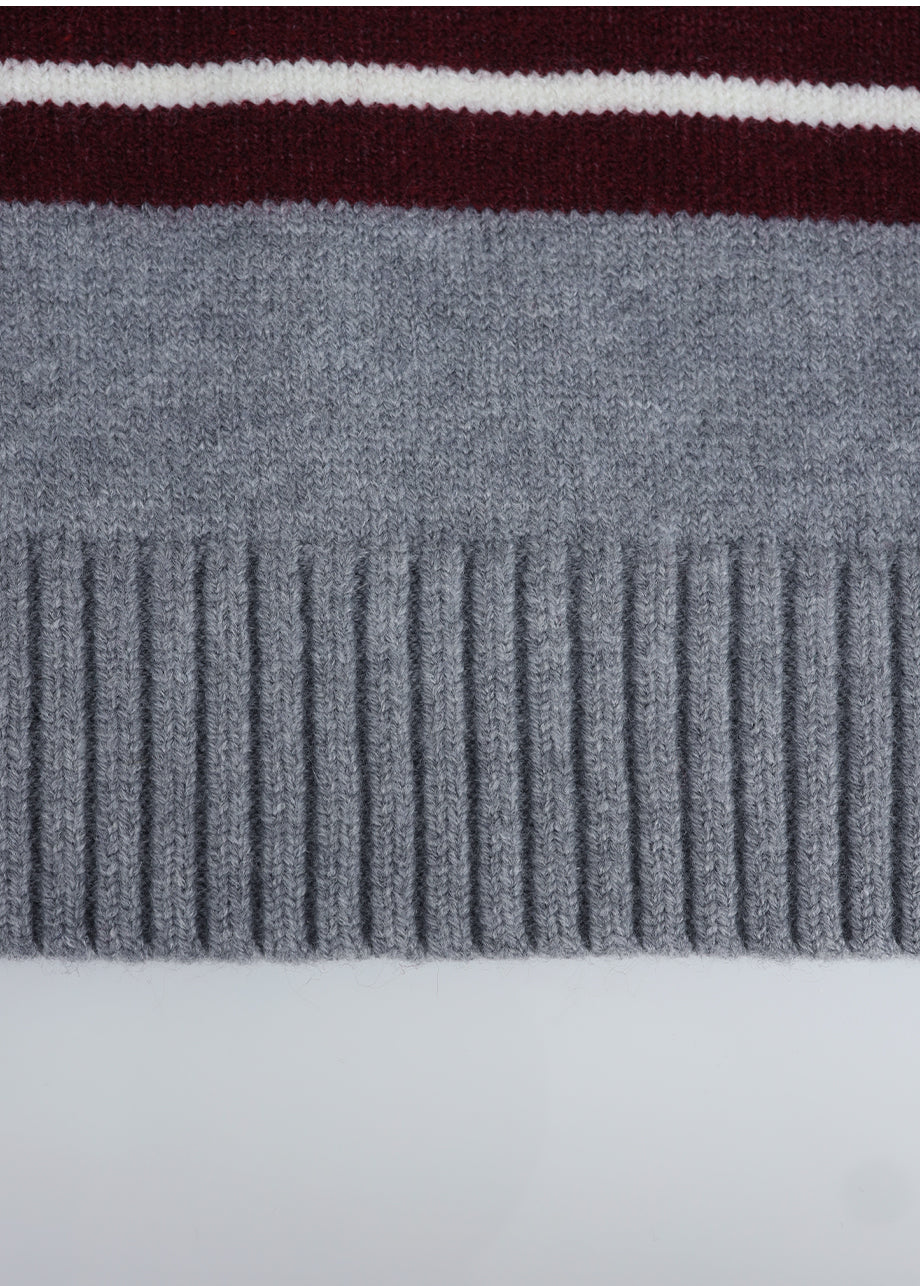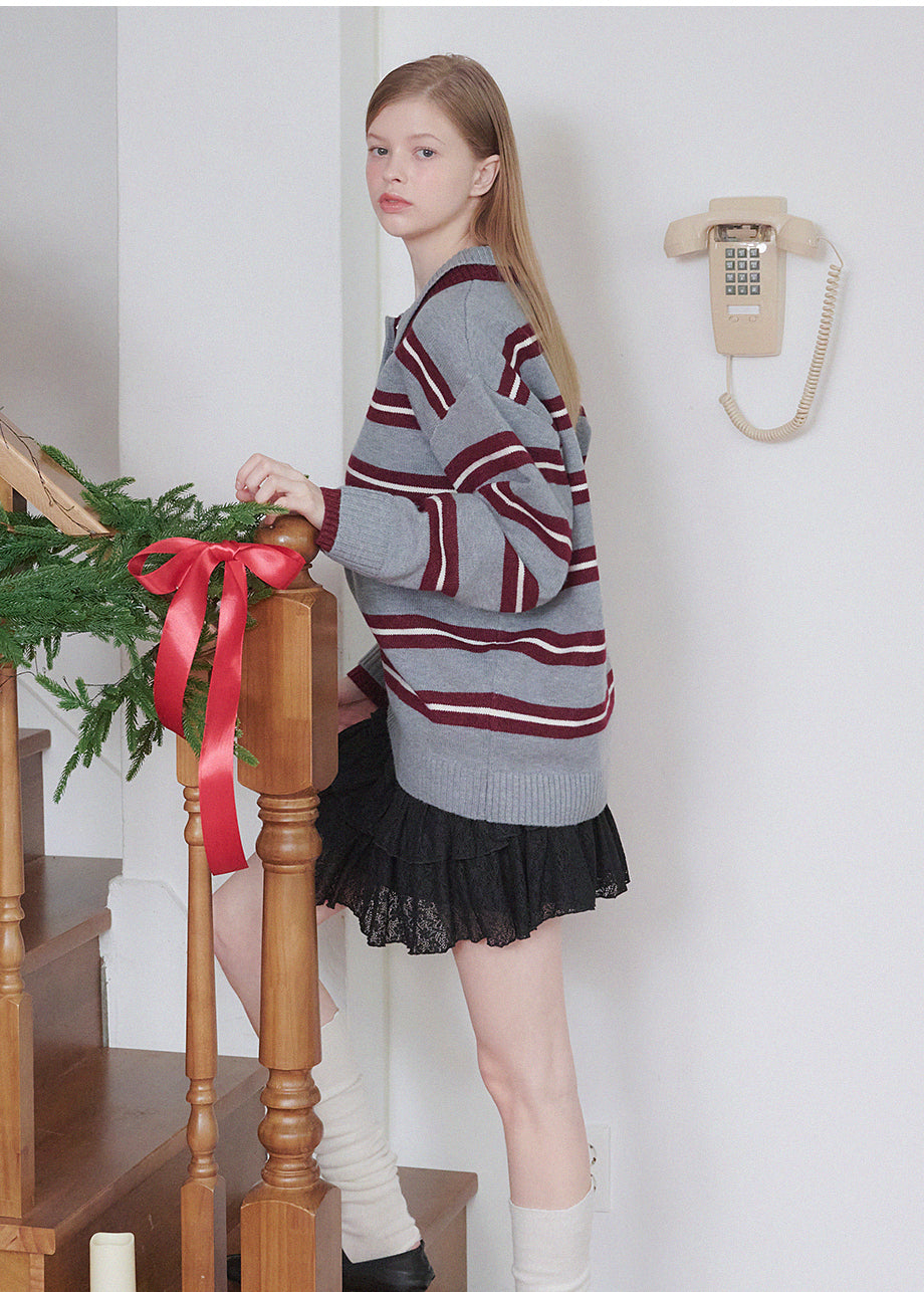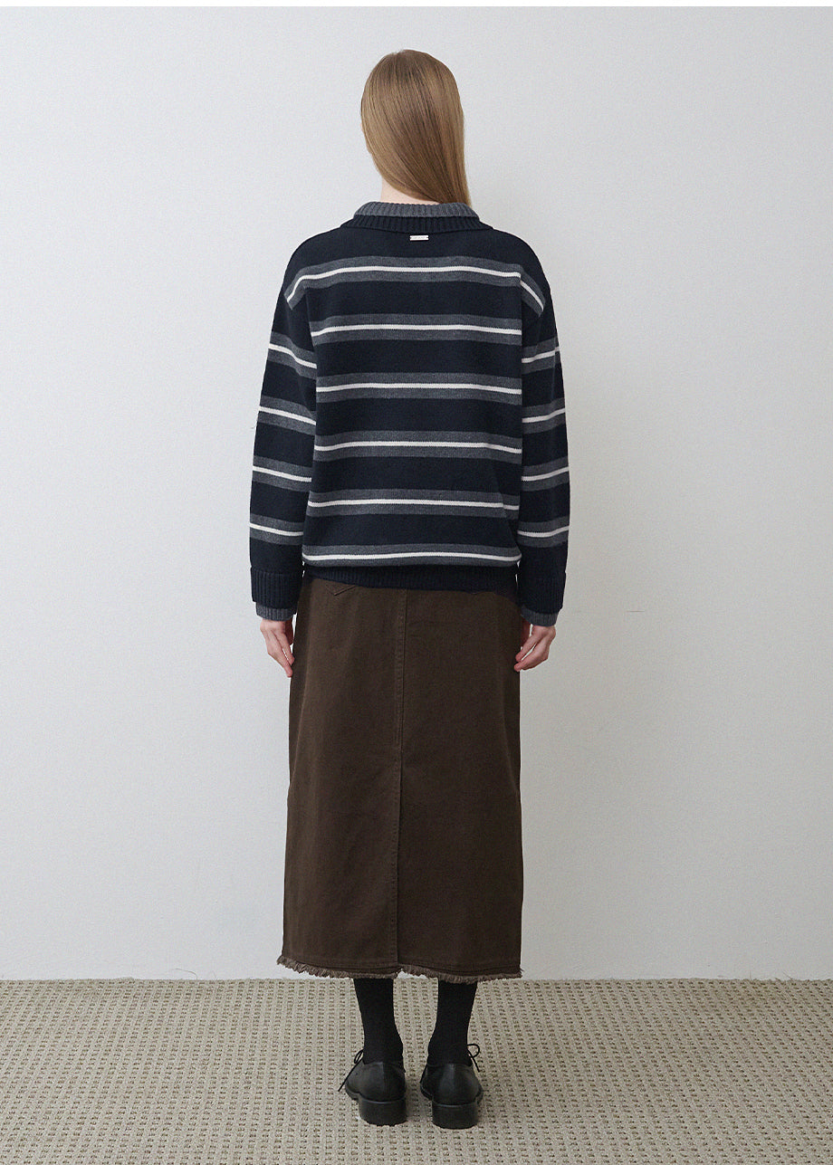 ビンテージカジュアルムードのストライプニットです。柔らかく密度の高いしっかりとした糸を使用しており、刺激のない暖かく快適な着心地が魅力です。ほどよくルーズなフィットでさまざまなアイテムと気軽にコーディネートでき、襟元と袖に配色ディテールを加えてレイヤードしたようなヴィンテージ感のあるスタイルを楽しめます。後ろネック中央にペンダント装飾を施し、よりクオリティの高い仕上がりにしました.*装飾や特殊な素材を使用した製品のため、クリーニング専門店でのお手入れをおすすめいたします。