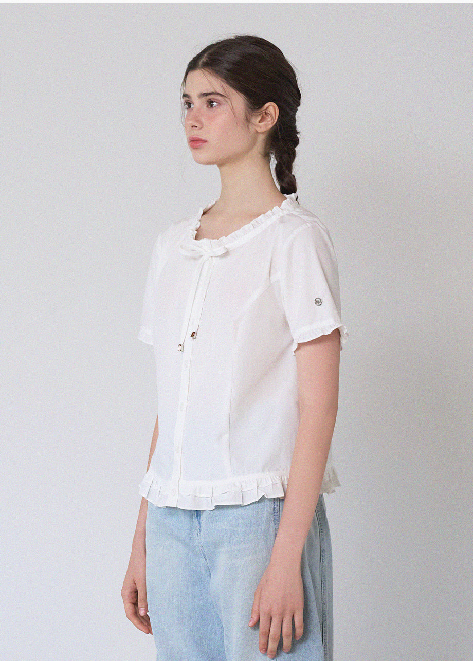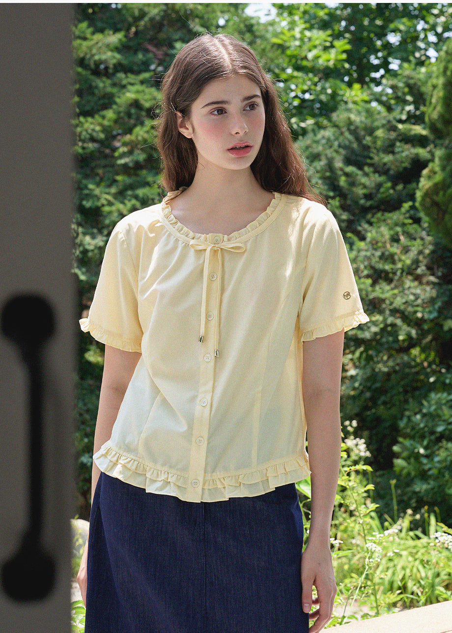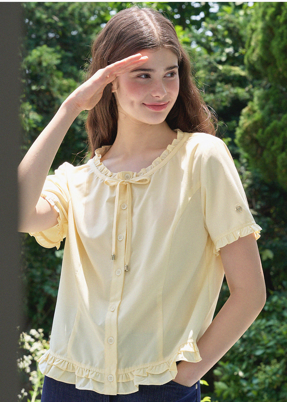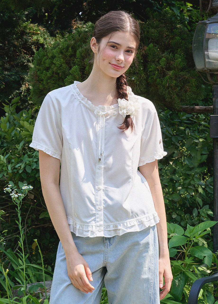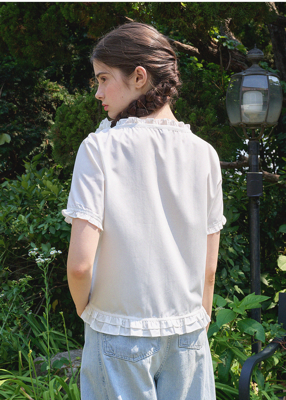 This lovely blouse features a loose silhouette and a semi-short length for a casual look. The ruffle detailing throughout creates a vintage and lovely atmosphere. *As this item features decorative details, we recommend having it professionally cleaned.