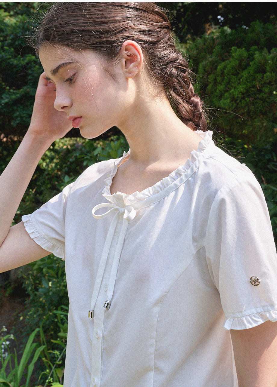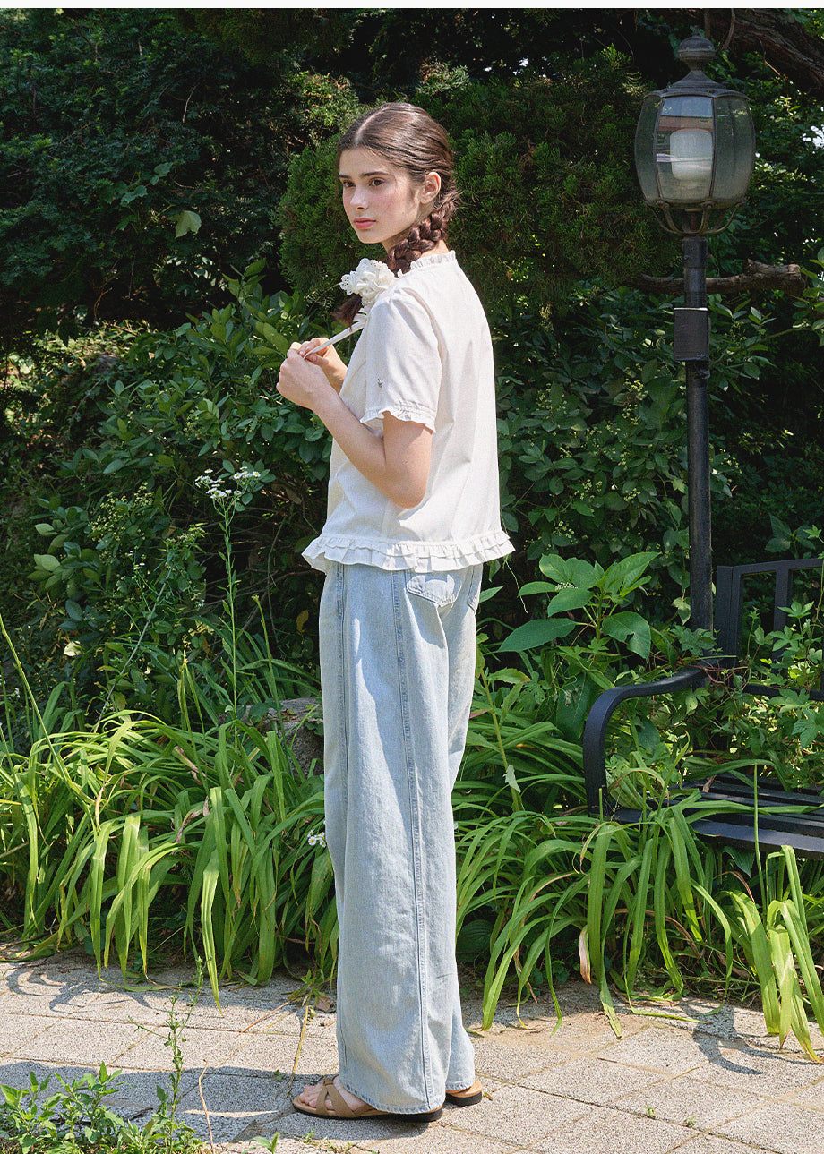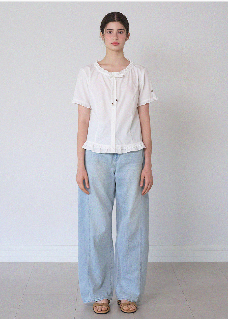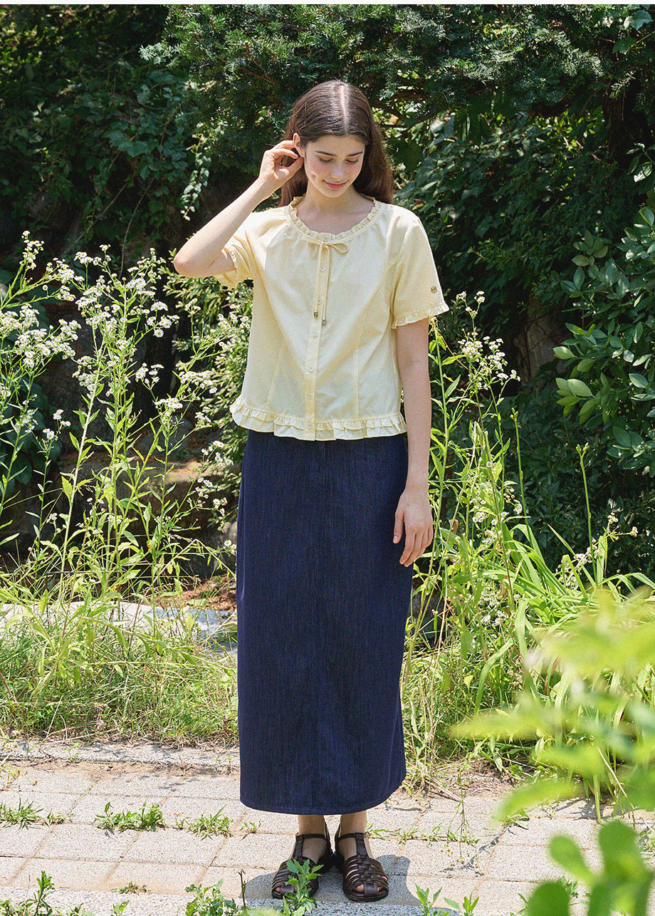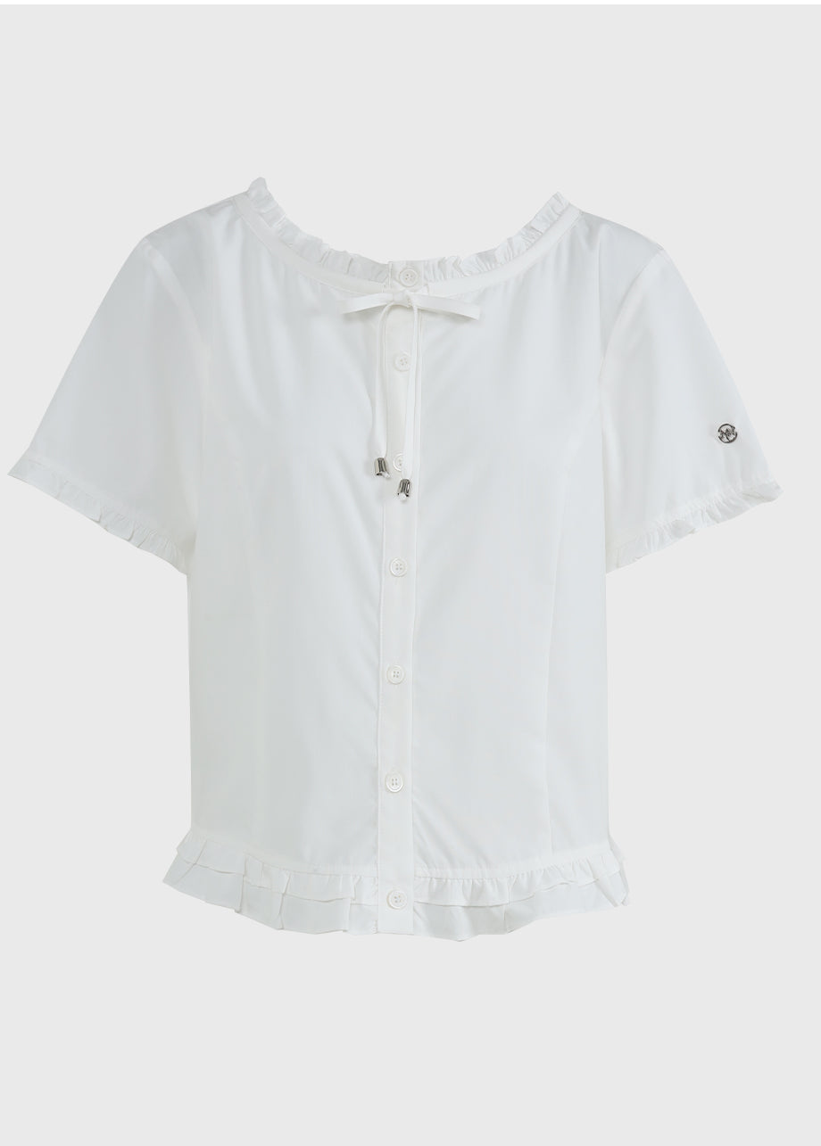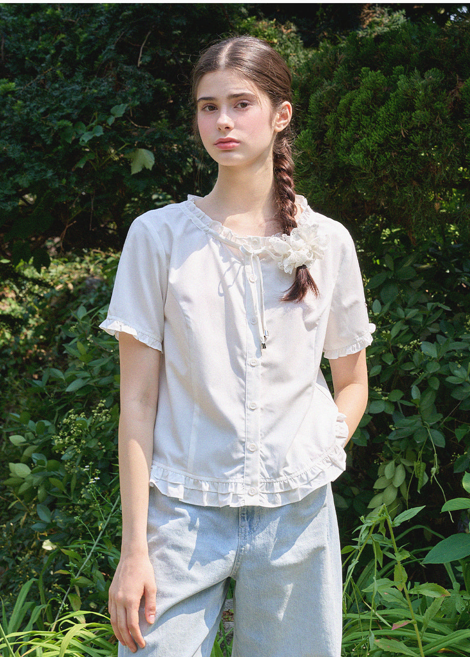 This lovely blouse features a loose silhouette and a semi-short length for a casual look. The ruffle detailing throughout creates a vintage and lovely atmosphere. *As this item features decorative details, we recommend having it professionally cleaned.