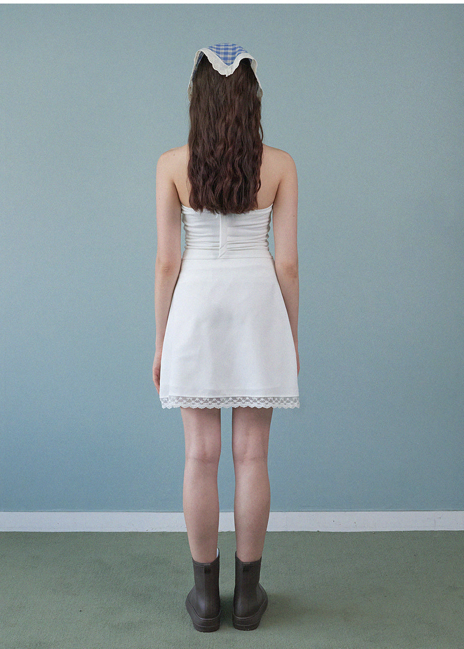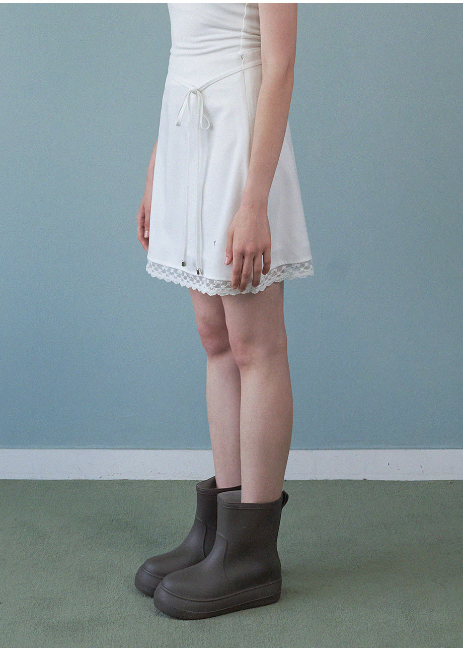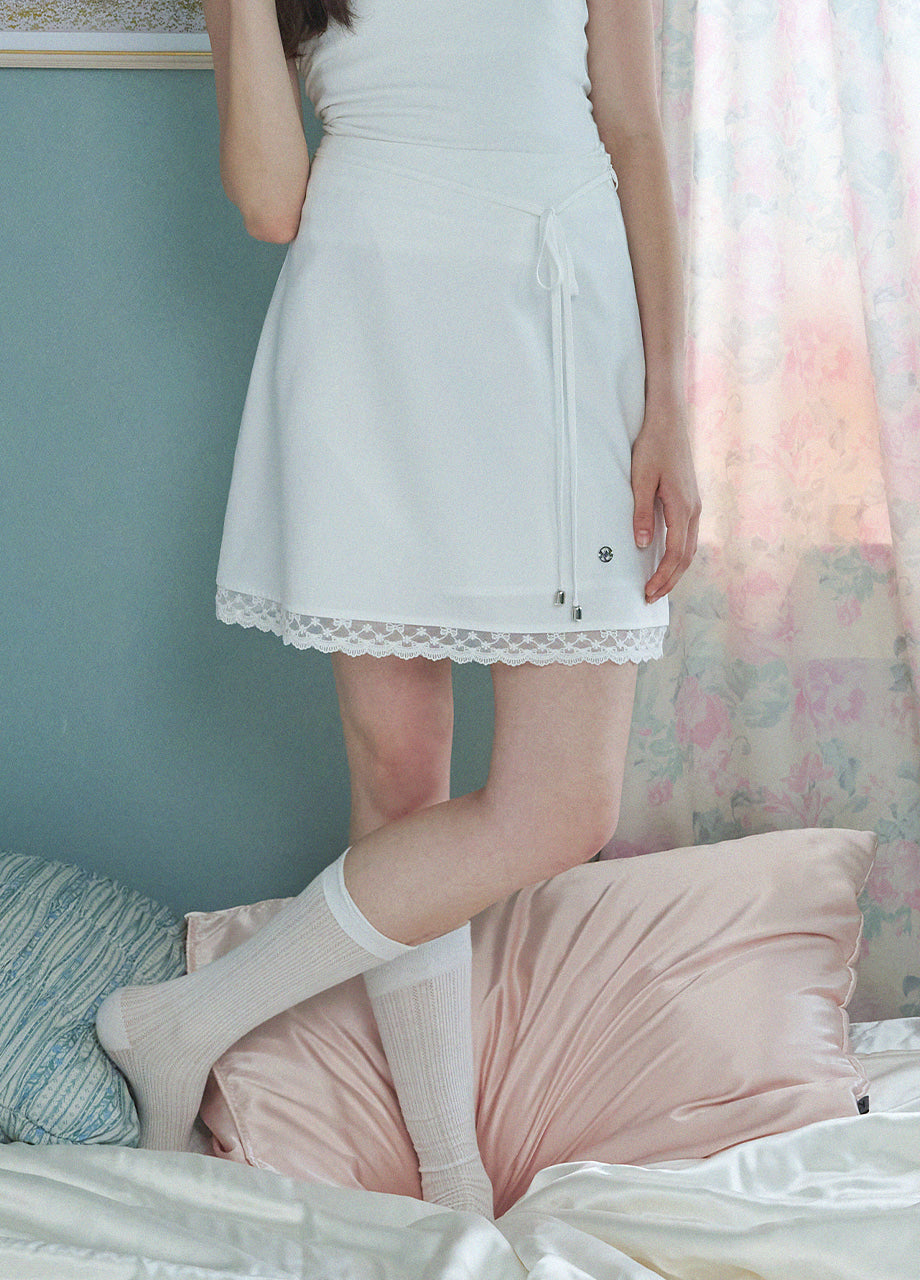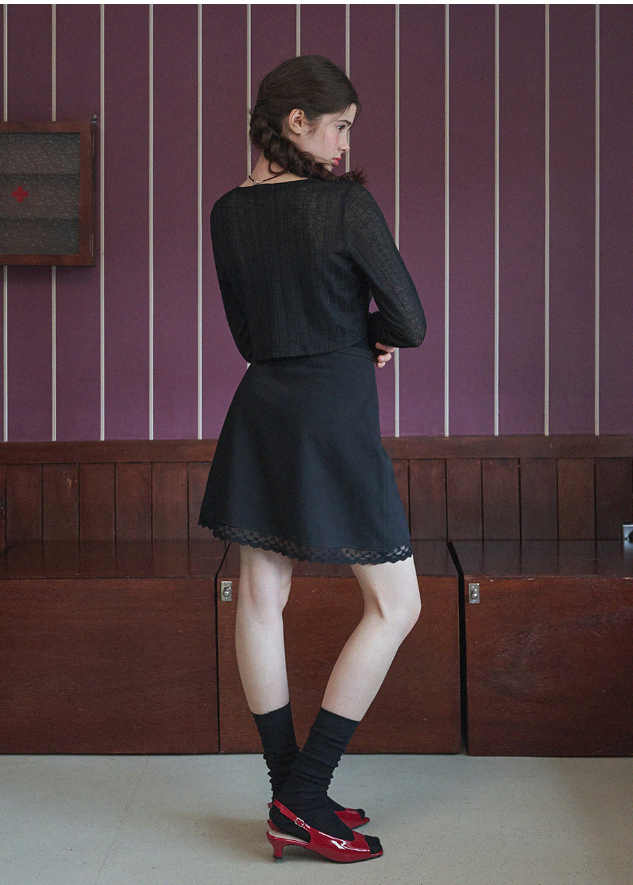 A mini skirt with a lovely sensibility. The lace at the hem is the focal point of the whole piece, adding a lovely mood. The slightly shorter length and semi-A-line silhouette make it easy to wear. *As this is a product with decorations, we recommend cleaning at a professional dry cleaning shop.