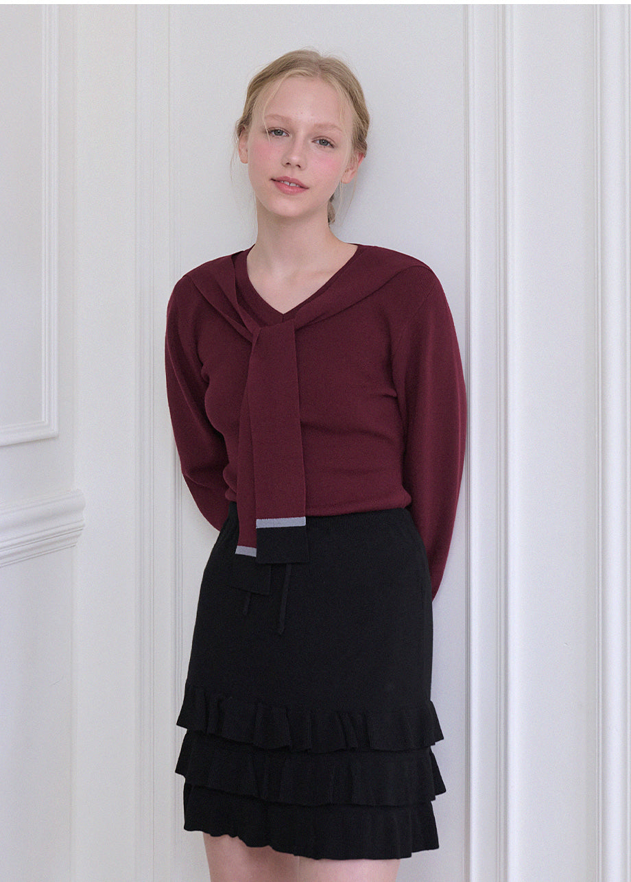 ビンテージシックムードのニットです。柔らかくて密度の高い生地で制作され、自然に体のラインを整えながらも滑らかな着心地が魅力。Vネックデザインにショールストラップでポイントを加えてシンプルすぎず、センス良く着こなせるアイテムとして活用できます。袖はバルーンフィットで整えて二の腕カバーに効果もあり、気軽に単独でもアウターの中のインナーとしても着やすいアイテムです。ネック後ろ中央にはペンダントで装飾を施し、上品に仕上げました。*装飾が施された製品のため、クリーニング専門店でのお手入れをおすすめいたします。