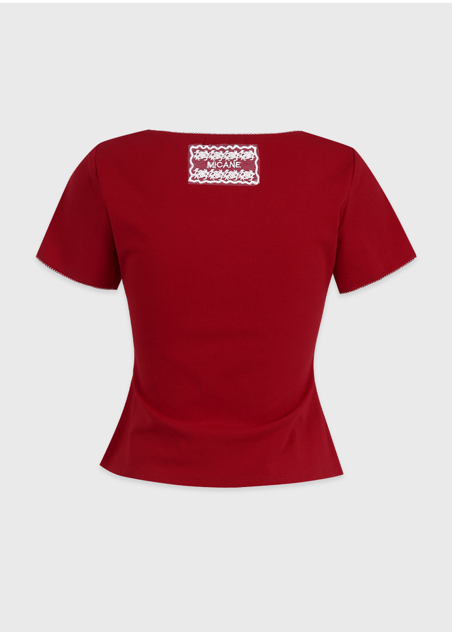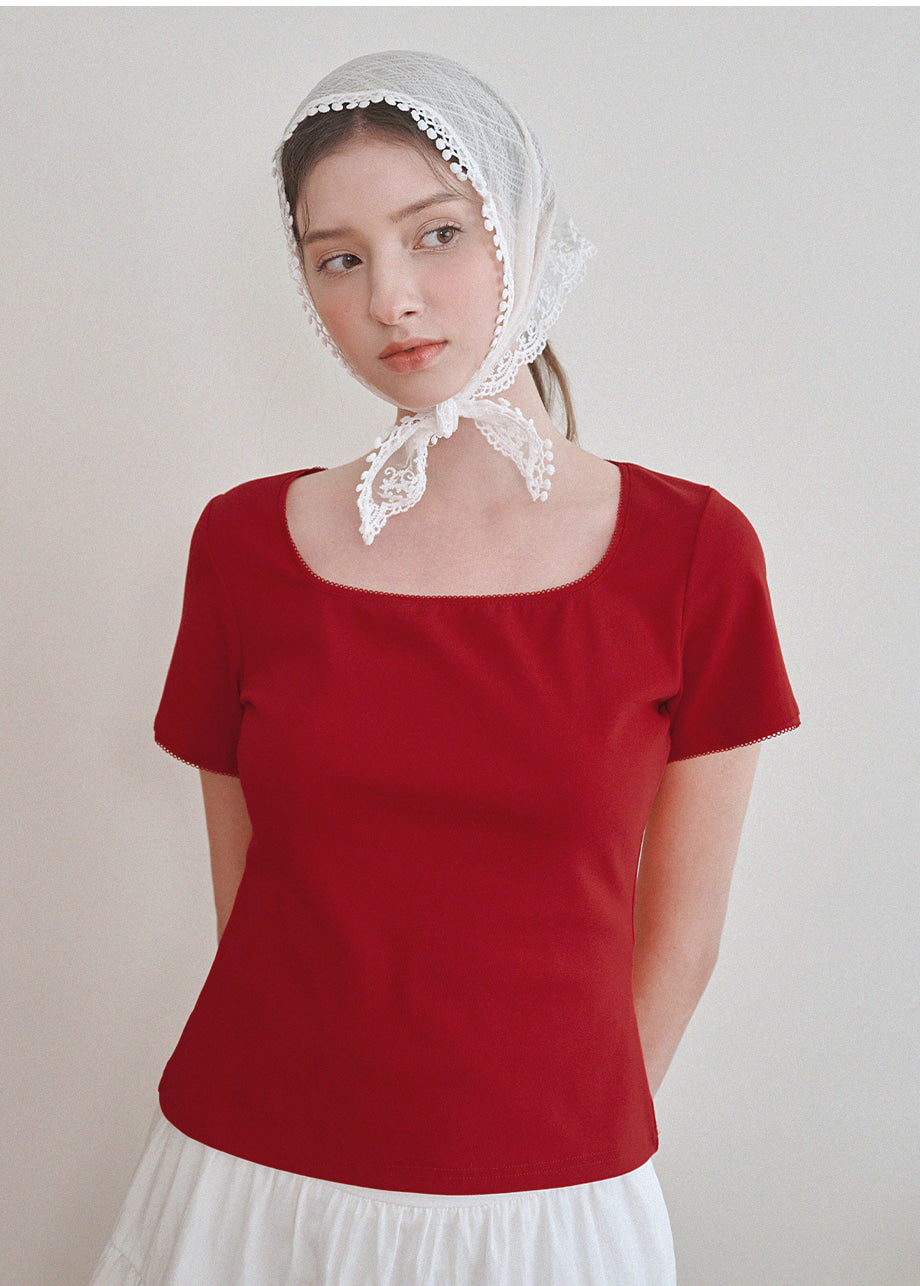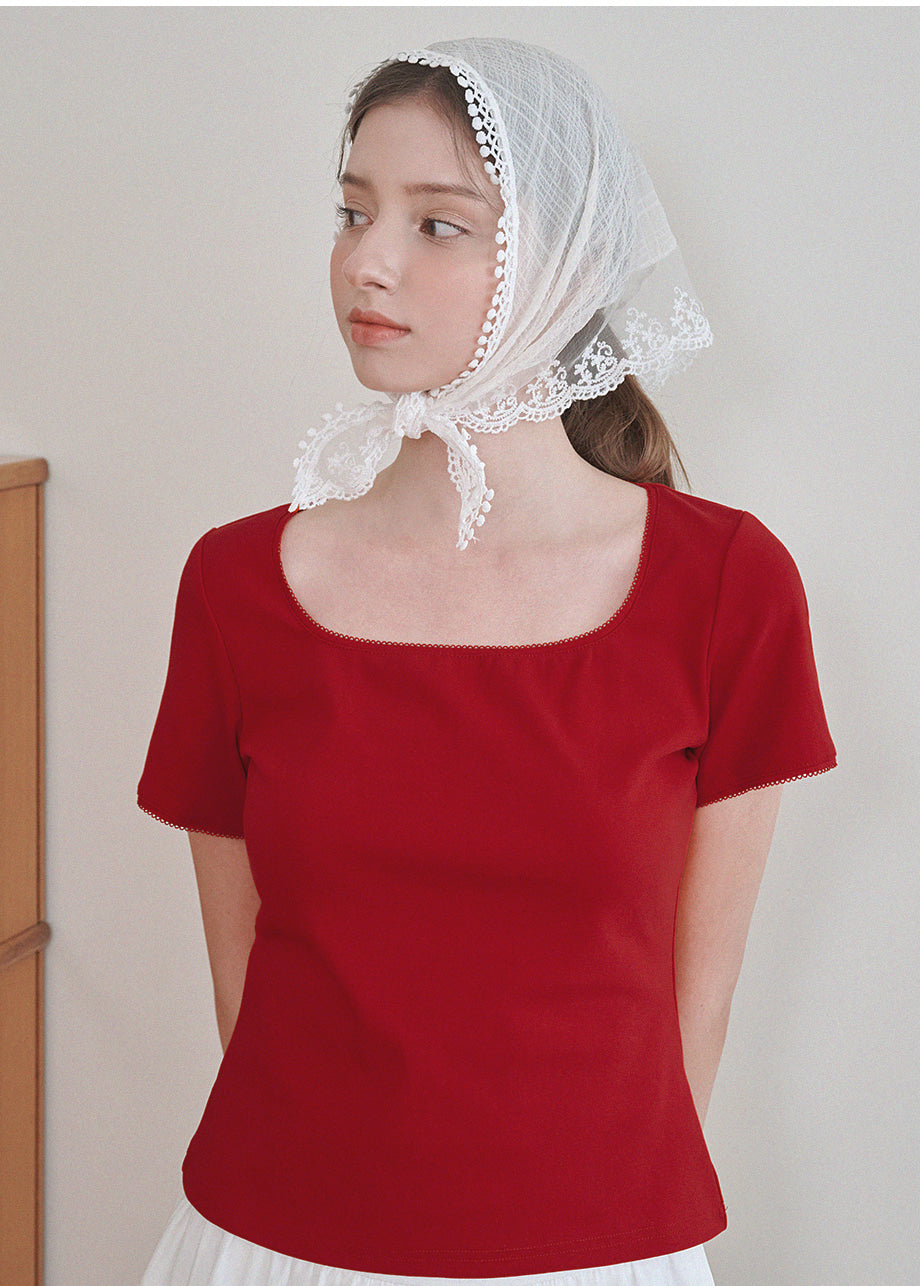 ヴィンテージムードの半袖Tシャツ。スリムなフィット感とレースのネックラインがさりげないフェミニンさを引き立てます。*装飾が施された製品のため、クリーニング専門店でのお手入れをおすすめいたします。やむを得ず洗濯機をご使用の際は、ネットに入れて冷水で洗濯することをおすすめいたします。