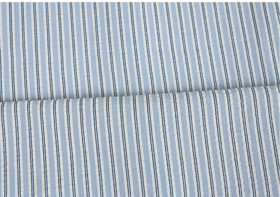 デイリームードで着用できるストライプドレスです。軽く快適なリンクル生地を使用し、着心地を高めました。細かいストライプ柄がポイントとなり、シンプル過ぎず印象的に着こなせます。