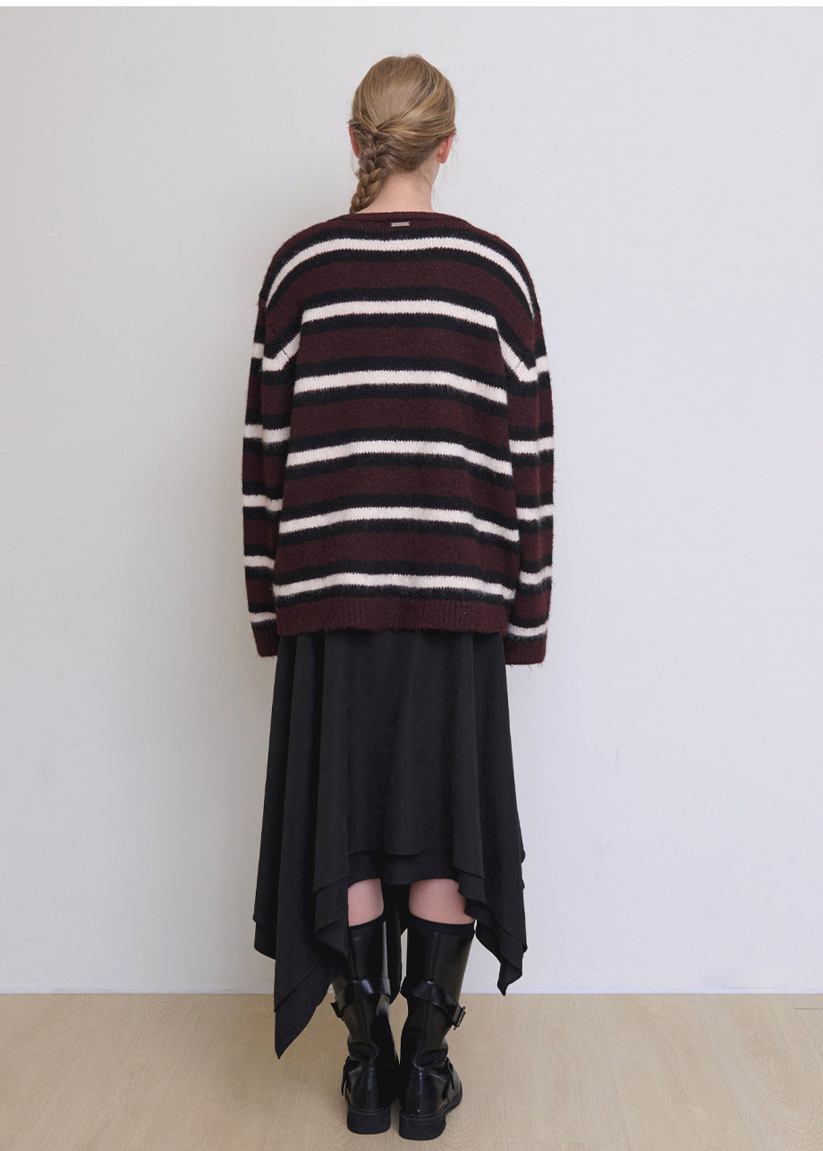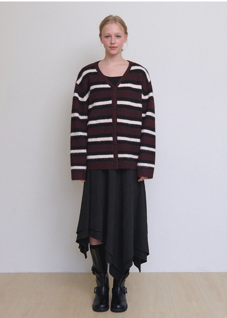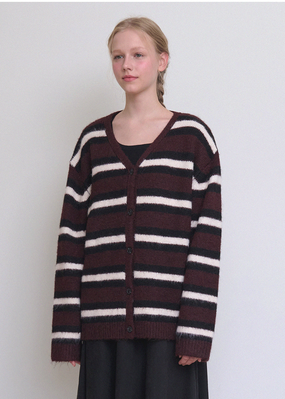 ビンテージカジュアルムードのカーディガンです。柔らかく密度の高い高品質なウール混紡糸を使用しており、優れた保温性と快適な着心地が特徴です。ヘアリーな質感が、着用時により一層ムードのあるスタイリングを演出します。Vネックデザインにヒップを覆う丈感にオーバーフィットで制作され、今秋のアウターとしてぜひおすすめしたいアイテムです。ボーダーパターンと配色でポイントを与え、シンプルすぎずに様々なムードを演出します。ネック後ろ中央にはペンダントで装飾を施し、上品に仕上げました。*装飾が施された製品のため、クリーニング専門店でのお手入れをおすすめいたします。ご注意:濃色に白い毛が見える場合がありますが、天然素材の特性であり、不良品ではございません。