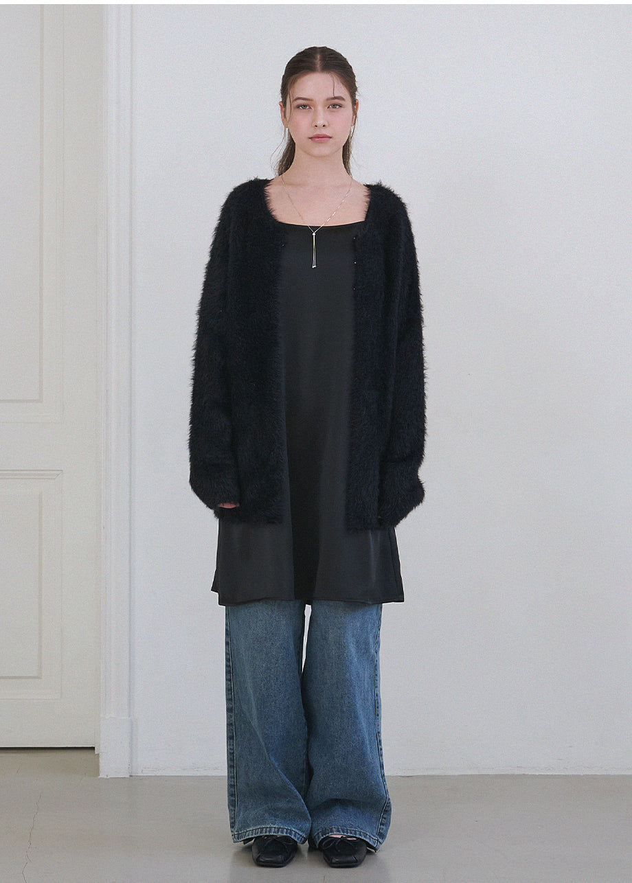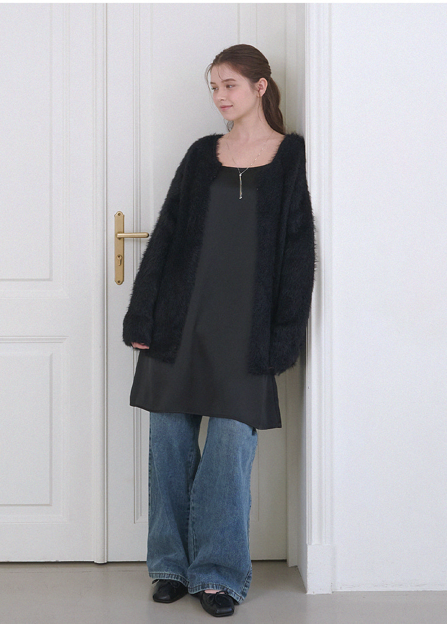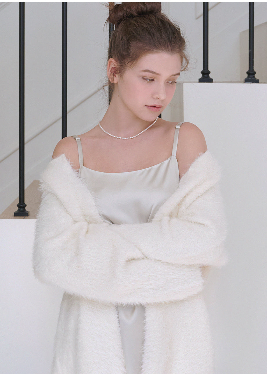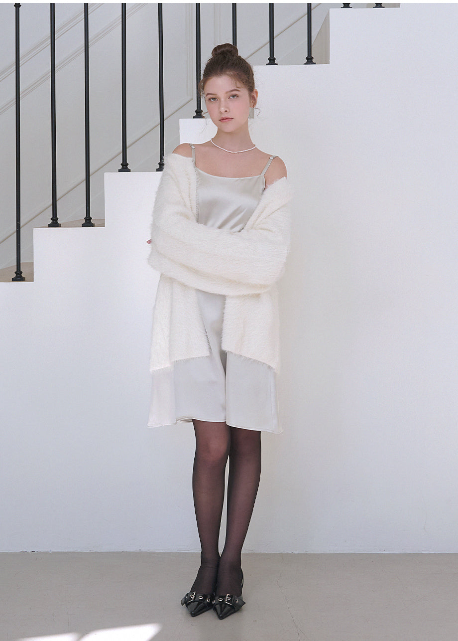 フェミニンでヴィンテージなムードが漂うドレスとカーディガンのセットアップです。ドレスには耐久性に優れた上質なサテン生地を使用し、カーディガンにはふんわりとしたロングヘア糸を採用して、刺激のない柔らかく暖かな着心地を実現しました。調節可能なストラップ付きスリーブレスドレスとヒップを覆う丈感のオーバーフィットカーディガンで、様々なスタイリングを気軽に楽しめます。ホリデールックやデートルックなど、特別な日の装いにもおすすめ。単品でもセットでも多彩に着こなせます。カーディガンの後ろ襟中央にはペンダント装飾をあしらい、上品さをプラスしました。*装飾や特殊な素材を使用した製品のため、クリーニング専門店でのお手入れをおすすめいたします。