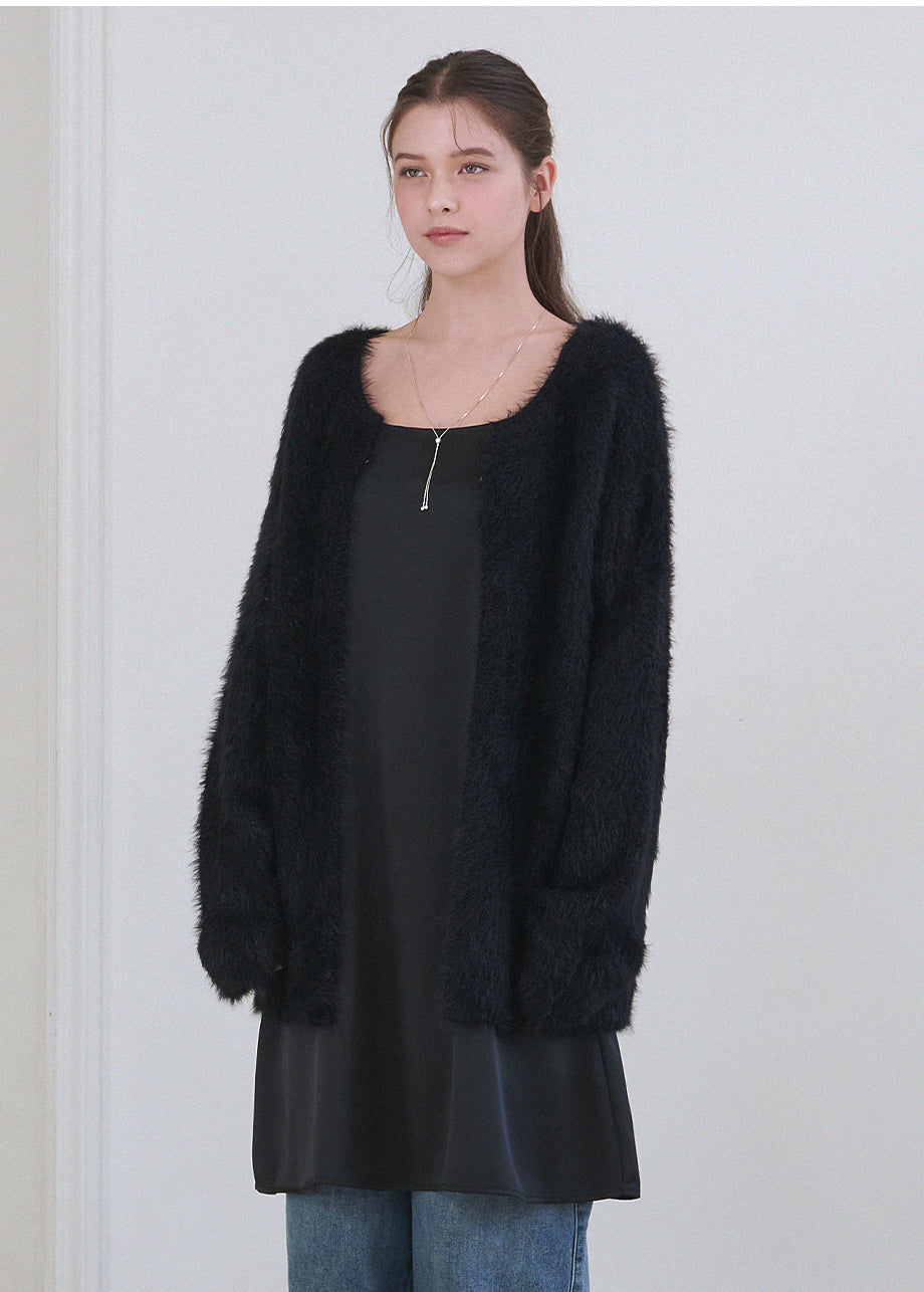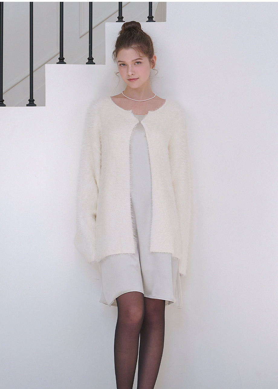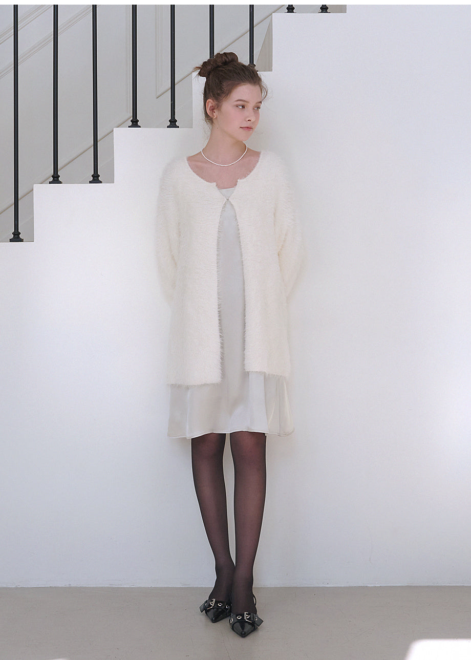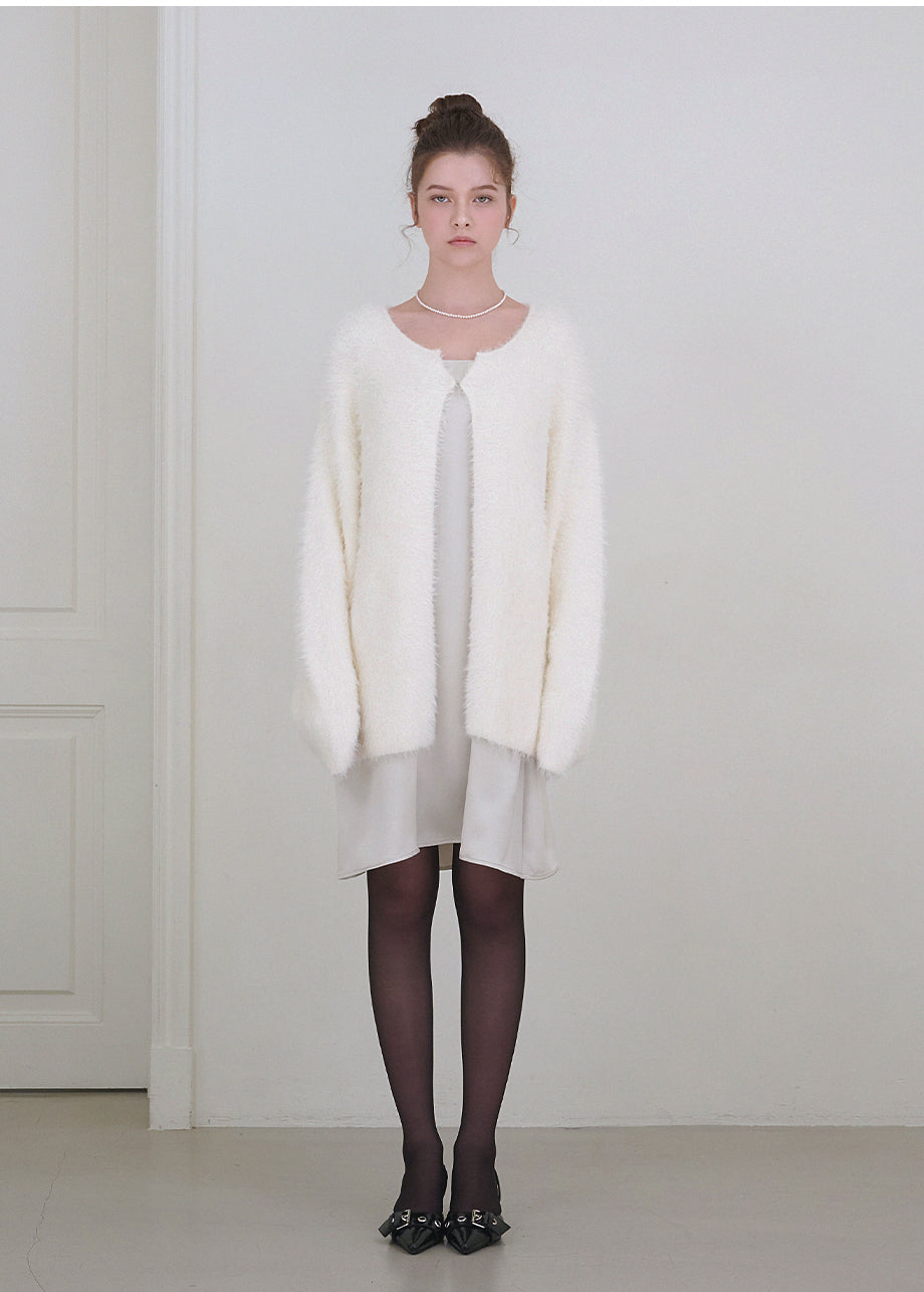 フェミニンでヴィンテージなムードが漂うドレスとカーディガンのセットアップです。ドレスには耐久性に優れた上質なサテン生地を使用し、カーディガンにはふんわりとしたロングヘア糸を採用して、刺激のない柔らかく暖かな着心地を実現しました。調節可能なストラップ付きスリーブレスドレスとヒップを覆う丈感のオーバーフィットカーディガンで、様々なスタイリングを気軽に楽しめます。ホリデールックやデートルックなど、特別な日の装いにもおすすめ。単品でもセットでも多彩に着こなせます。カーディガンの後ろ襟中央にはペンダント装飾をあしらい、上品さをプラスしました。*装飾や特殊な素材を使用した製品のため、クリーニング専門店でのお手入れをおすすめいたします。