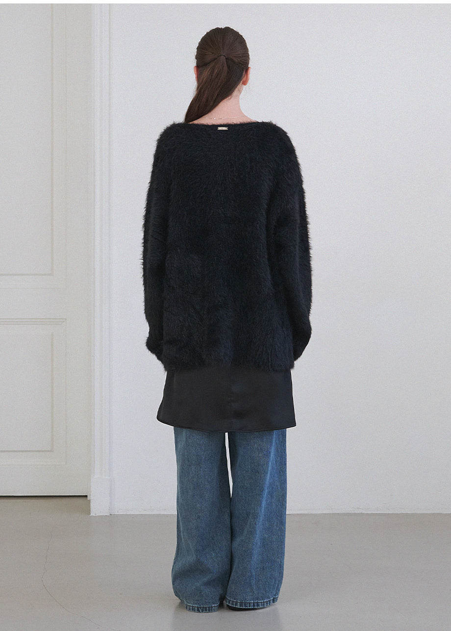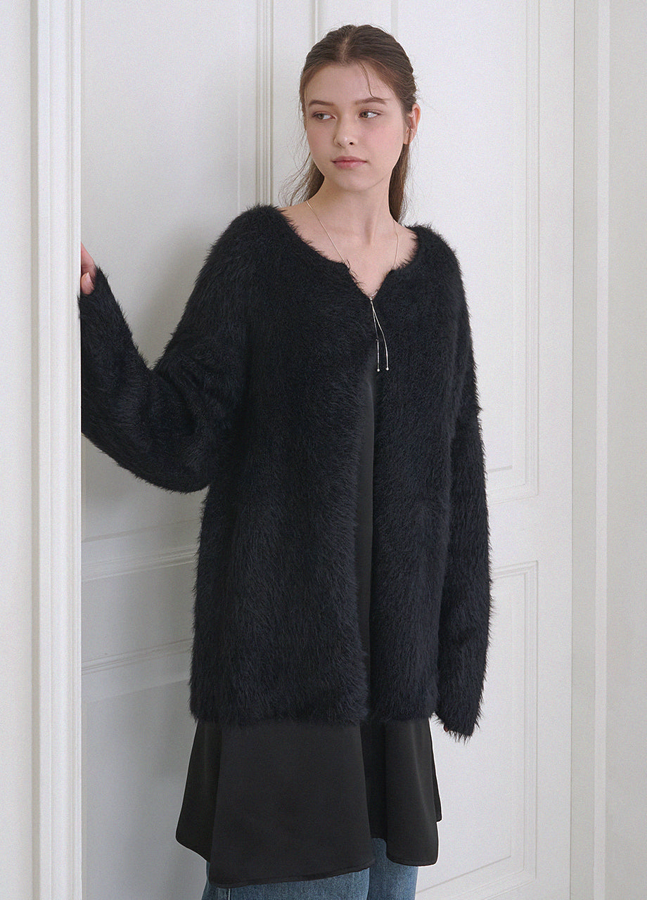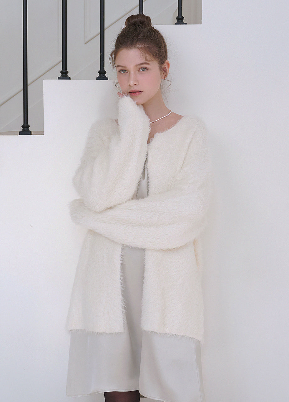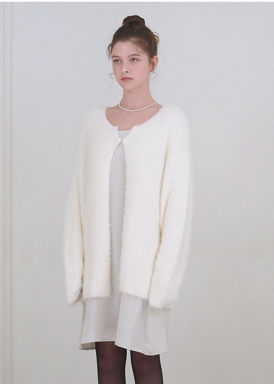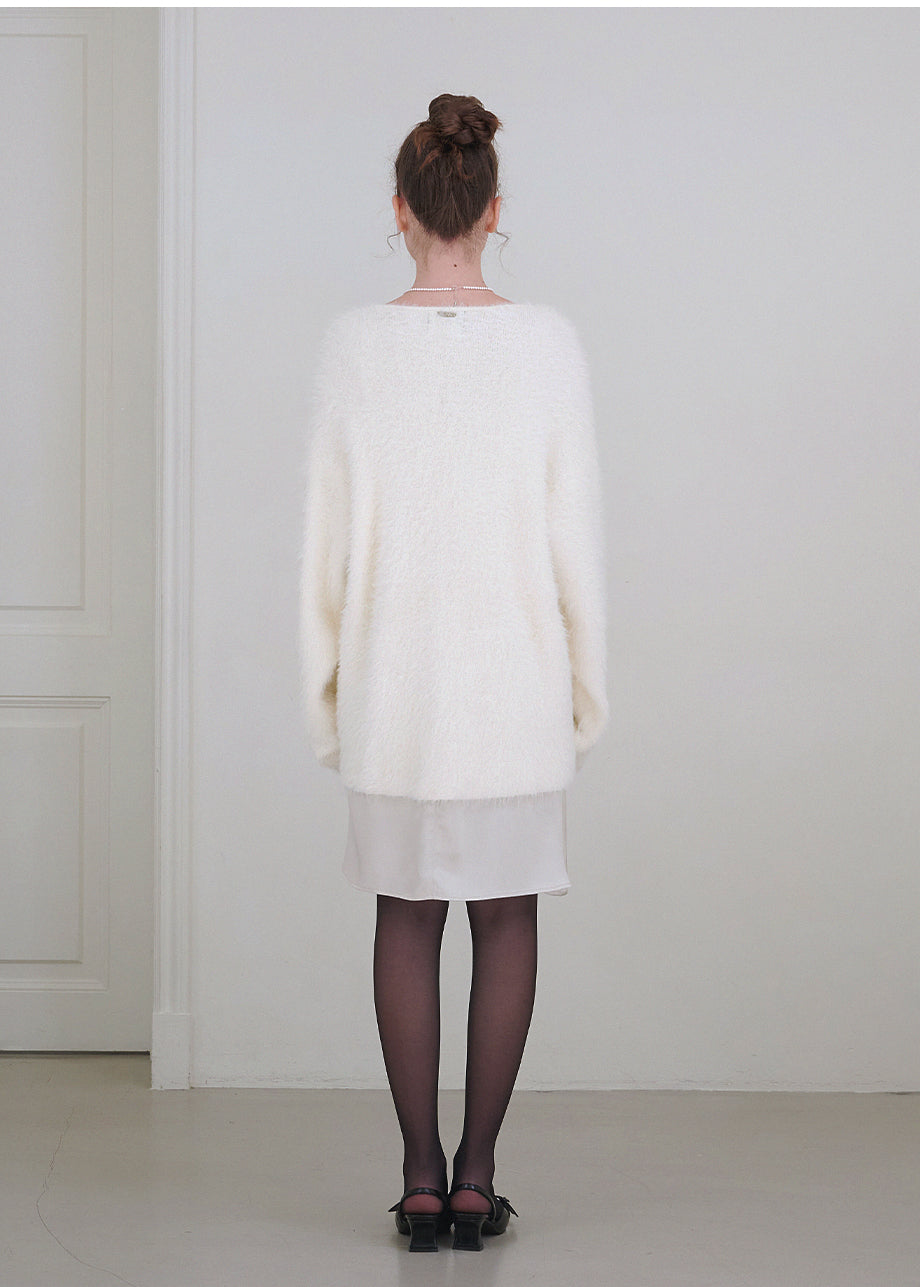 フェミニンでヴィンテージなムードが漂うドレスとカーディガンのセットアップです。ドレスには耐久性に優れた上質なサテン生地を使用し、カーディガンにはふんわりとしたロングヘア糸を採用して、刺激のない柔らかく暖かな着心地を実現しました。調節可能なストラップ付きスリーブレスドレスとヒップを覆う丈感のオーバーフィットカーディガンで、様々なスタイリングを気軽に楽しめます。ホリデールックやデートルックなど、特別な日の装いにもおすすめ。単品でもセットでも多彩に着こなせます。カーディガンの後ろ襟中央にはペンダント装飾をあしらい、上品さをプラスしました。*装飾や特殊な素材を使用した製品のため、クリーニング専門店でのお手入れをおすすめいたします。