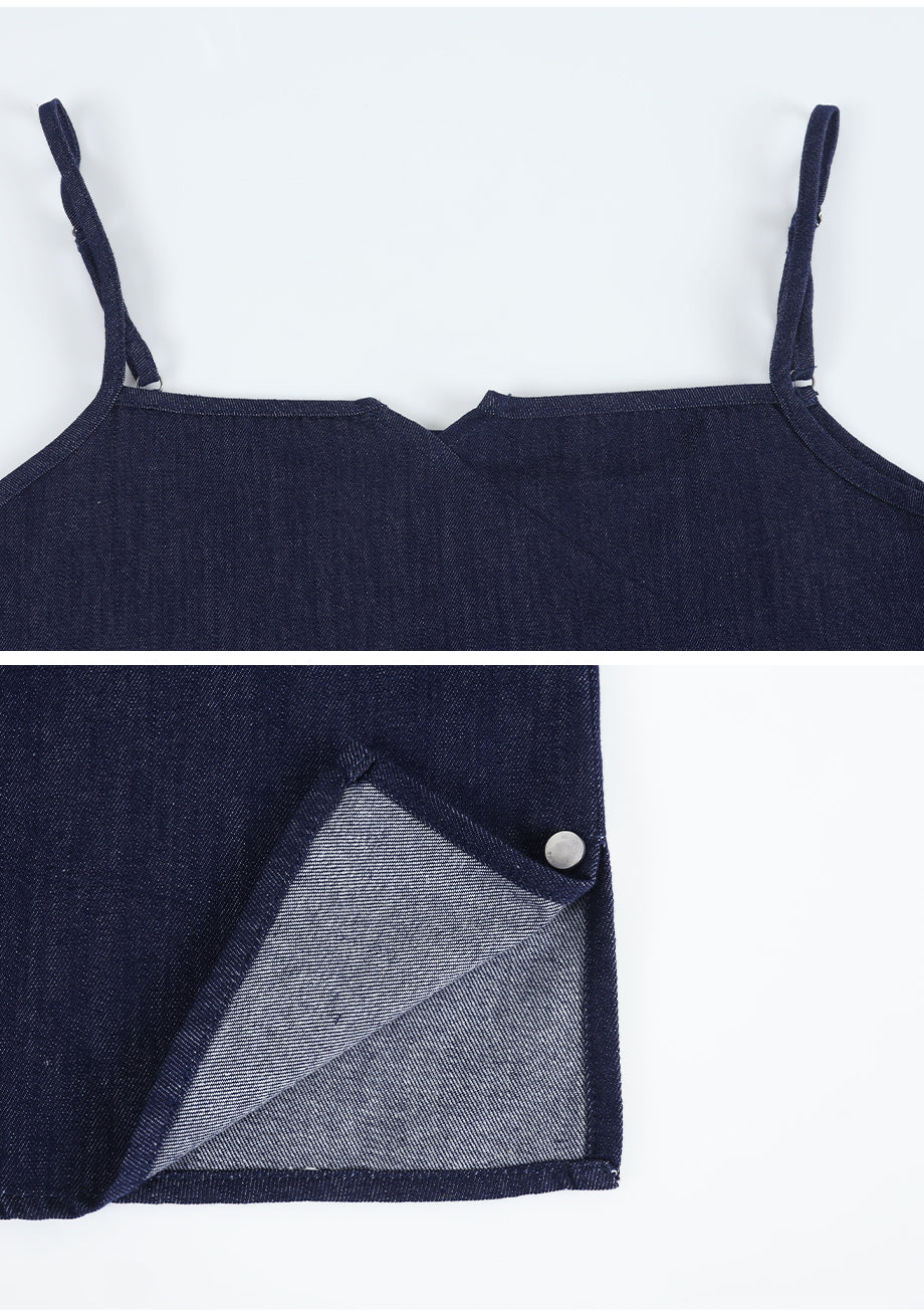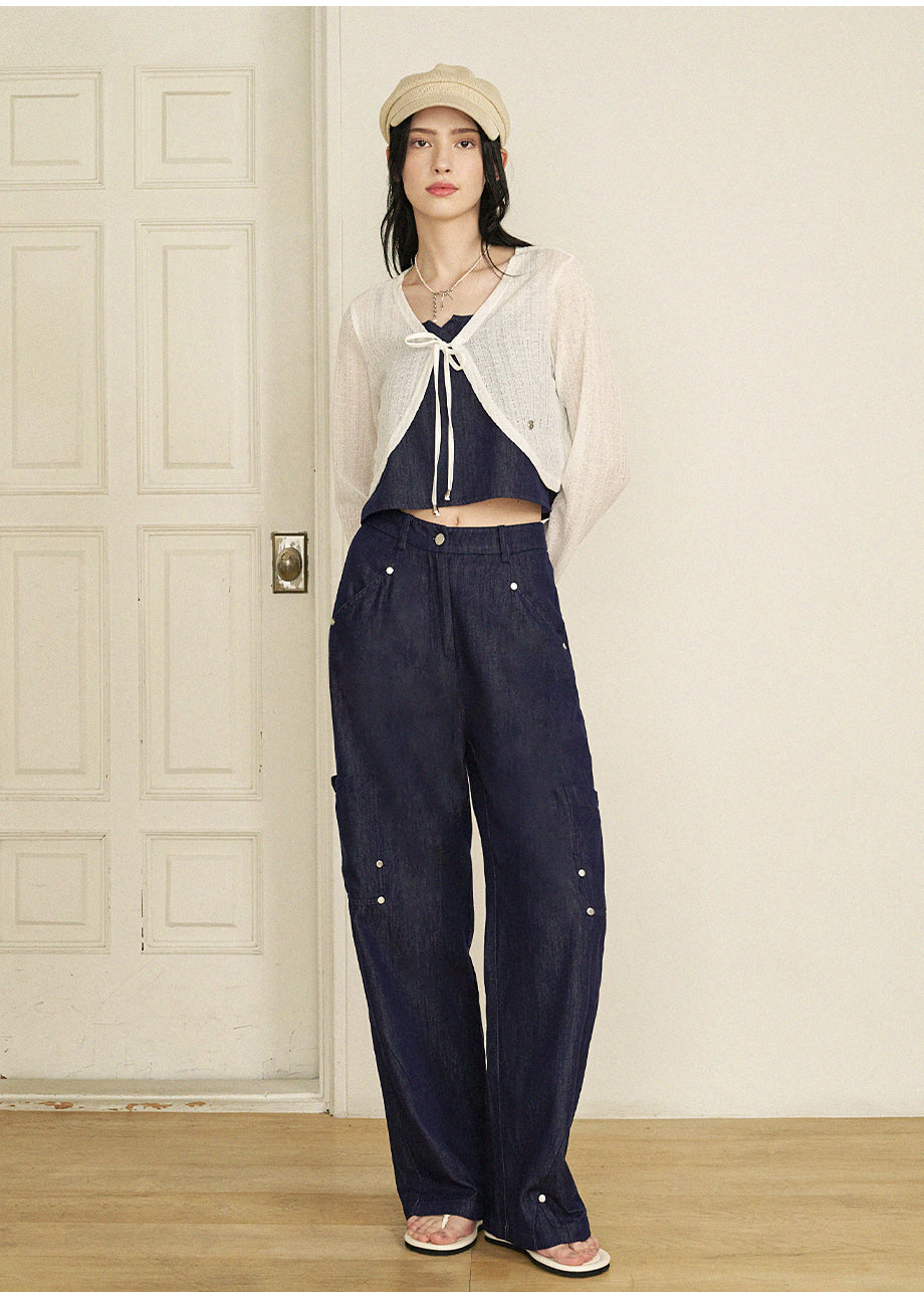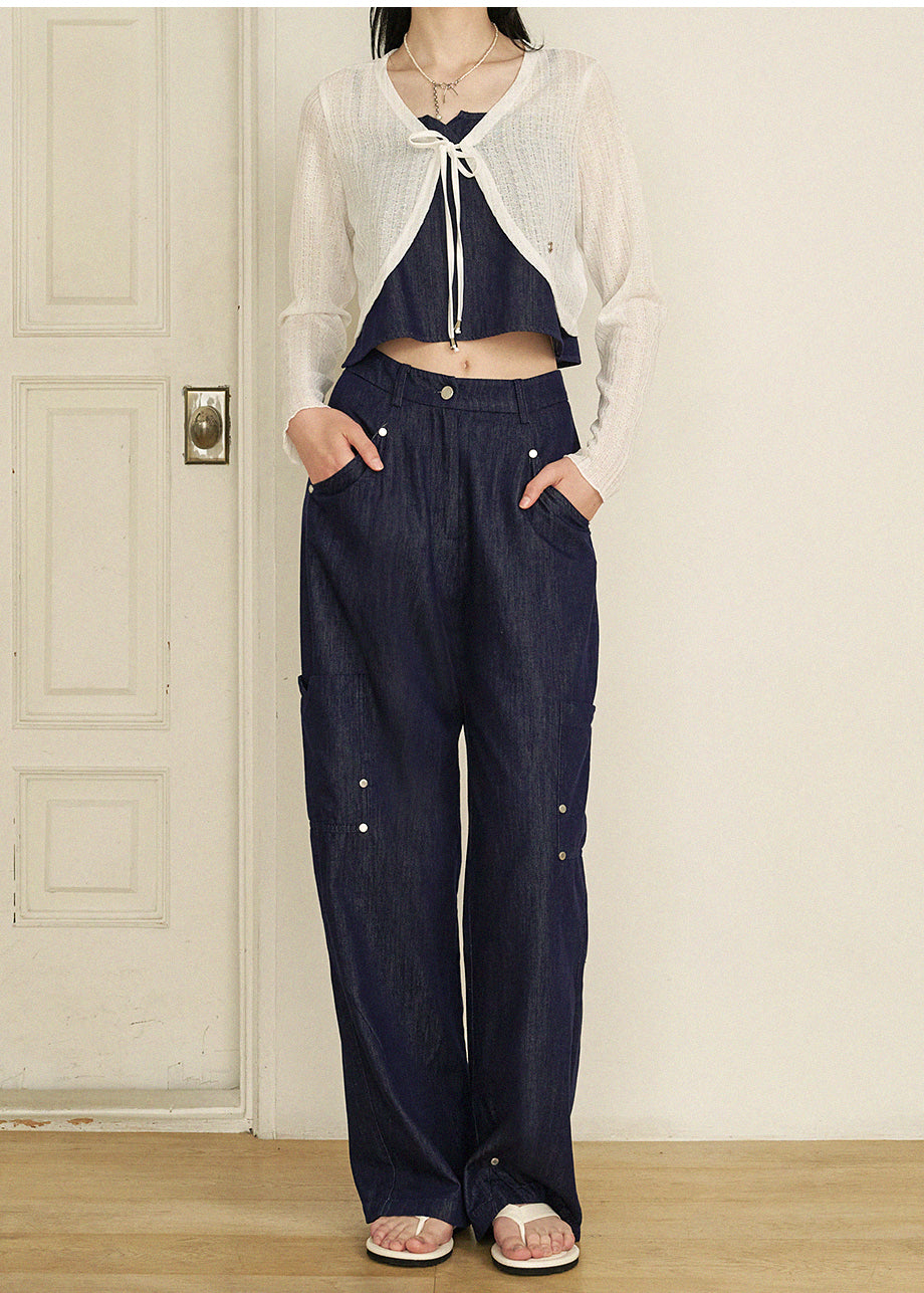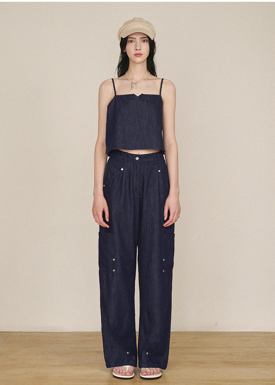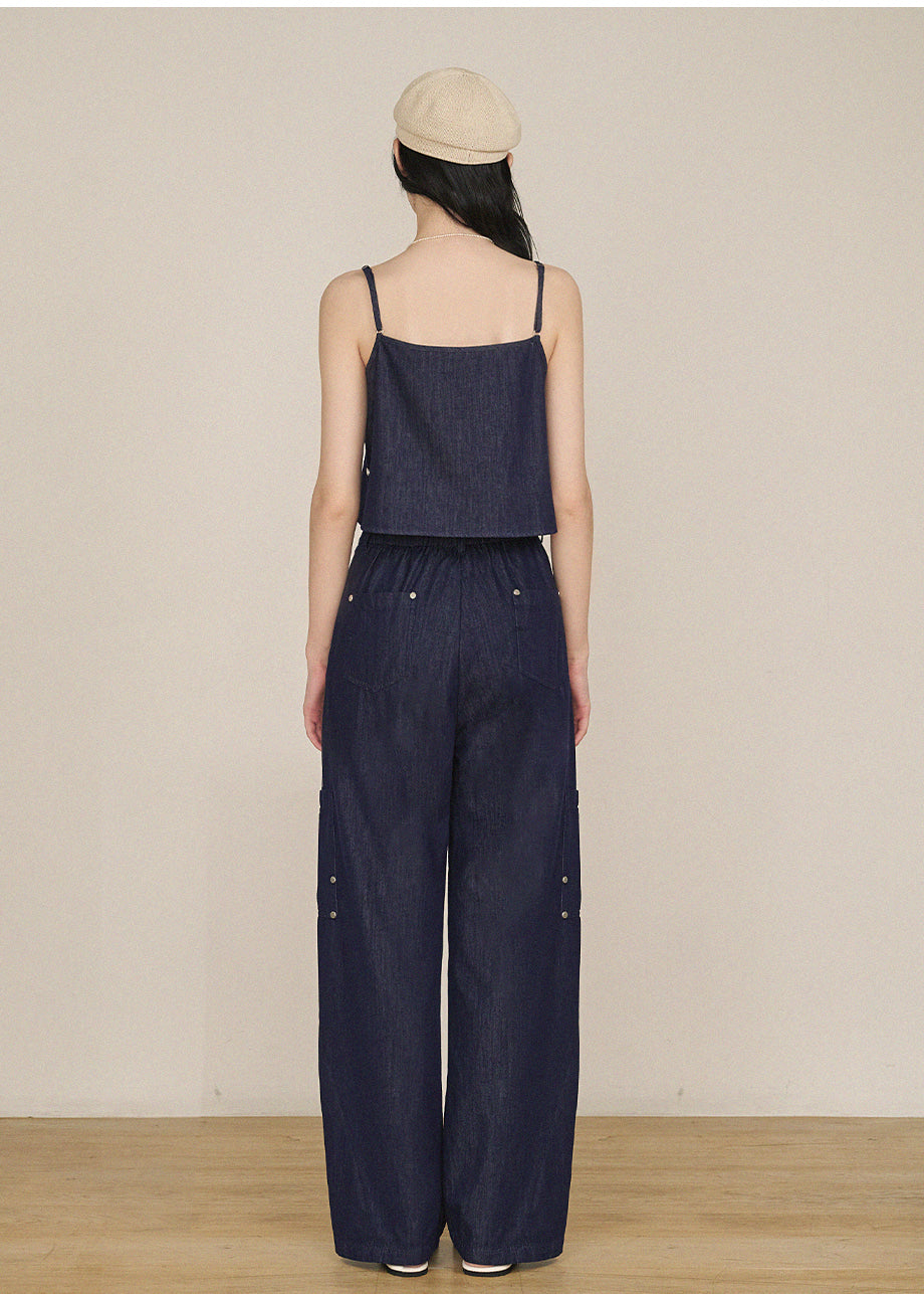 デイリーでユニークなムードのビスチェとパンツのセットアップです。軽くて丈夫なデニム素材を使用し、シルエットとクオリティを高めました。