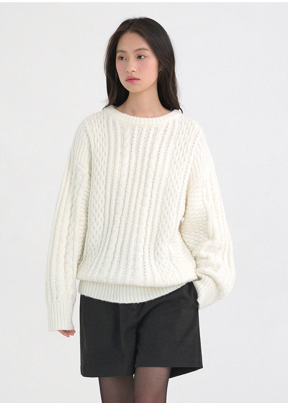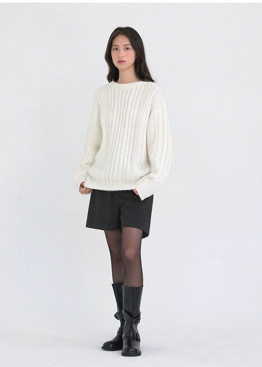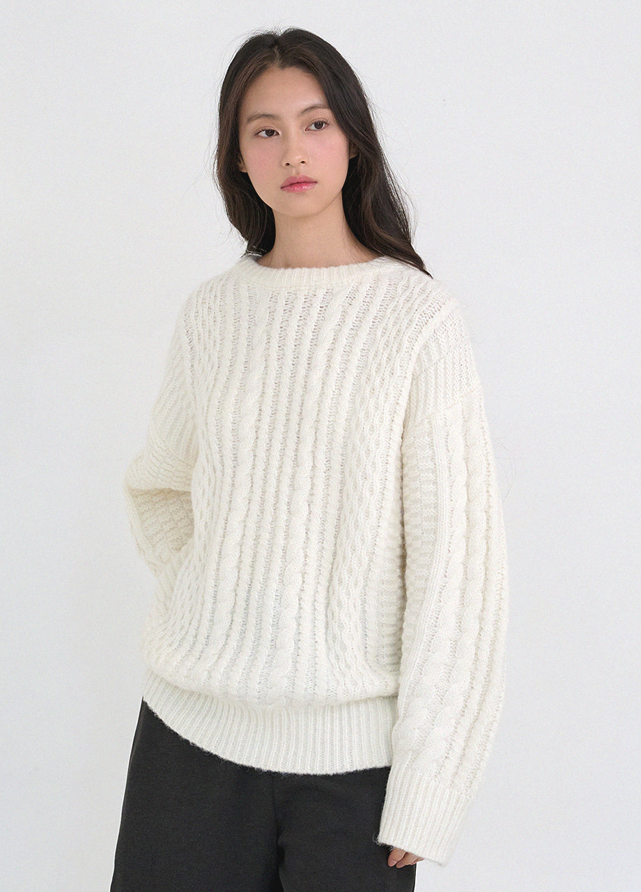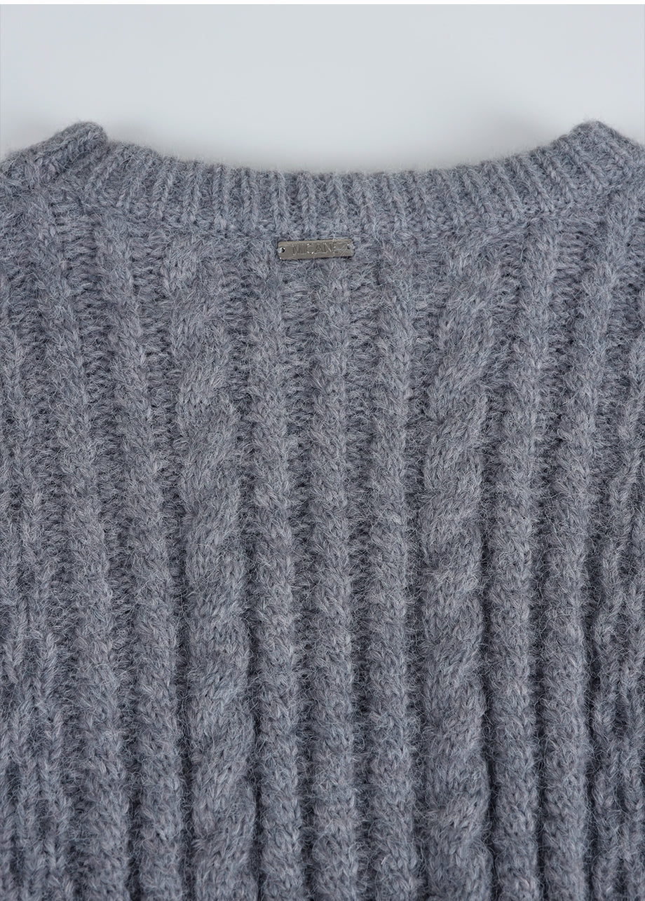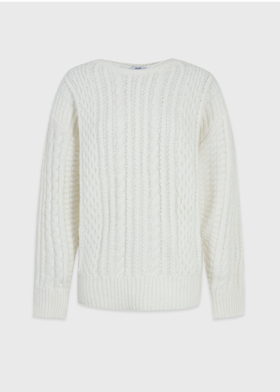 クラシックカジュアルムードのニットです。柔らかく密度の高い高品質なウール混糸を使用し、優れた保温性と快適な着心地が特徴です。コージーな雰囲気のツイスト編みでオーバーフィットに仕上げ、シーズンムードを感じられるスタイリングが楽しめます。しっかりとした編み地で耐久性を高め、長くご愛用いただけます。カジュアルなデザインで単独でもインナーニットとしても多様に活用可能です。バックネック中央にはペンダント風の装飾を加え、上品に仕上げました。*装飾や特殊な素材の製品のため、クリーニング専門店でのお手入れをおすすめいたします。
