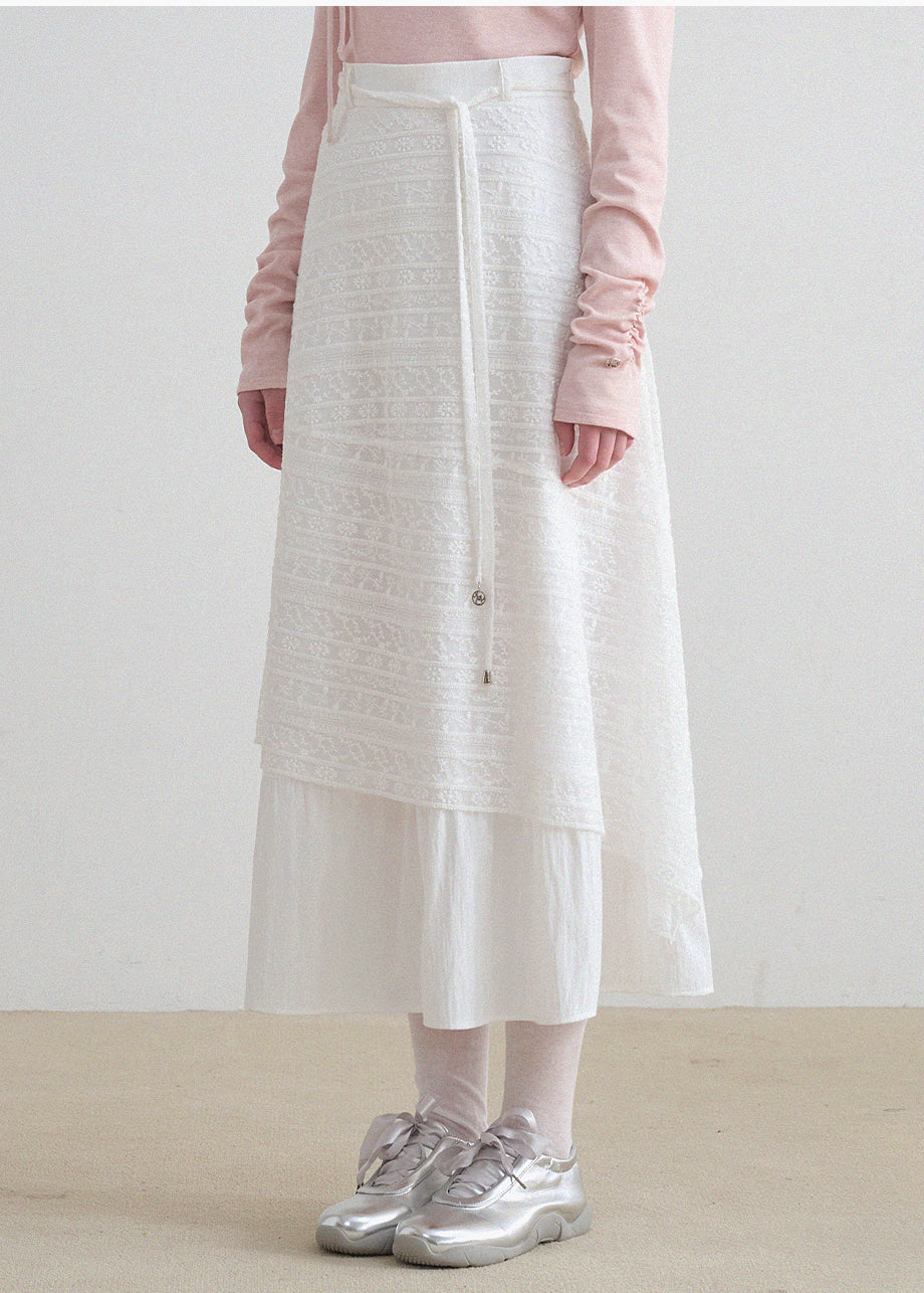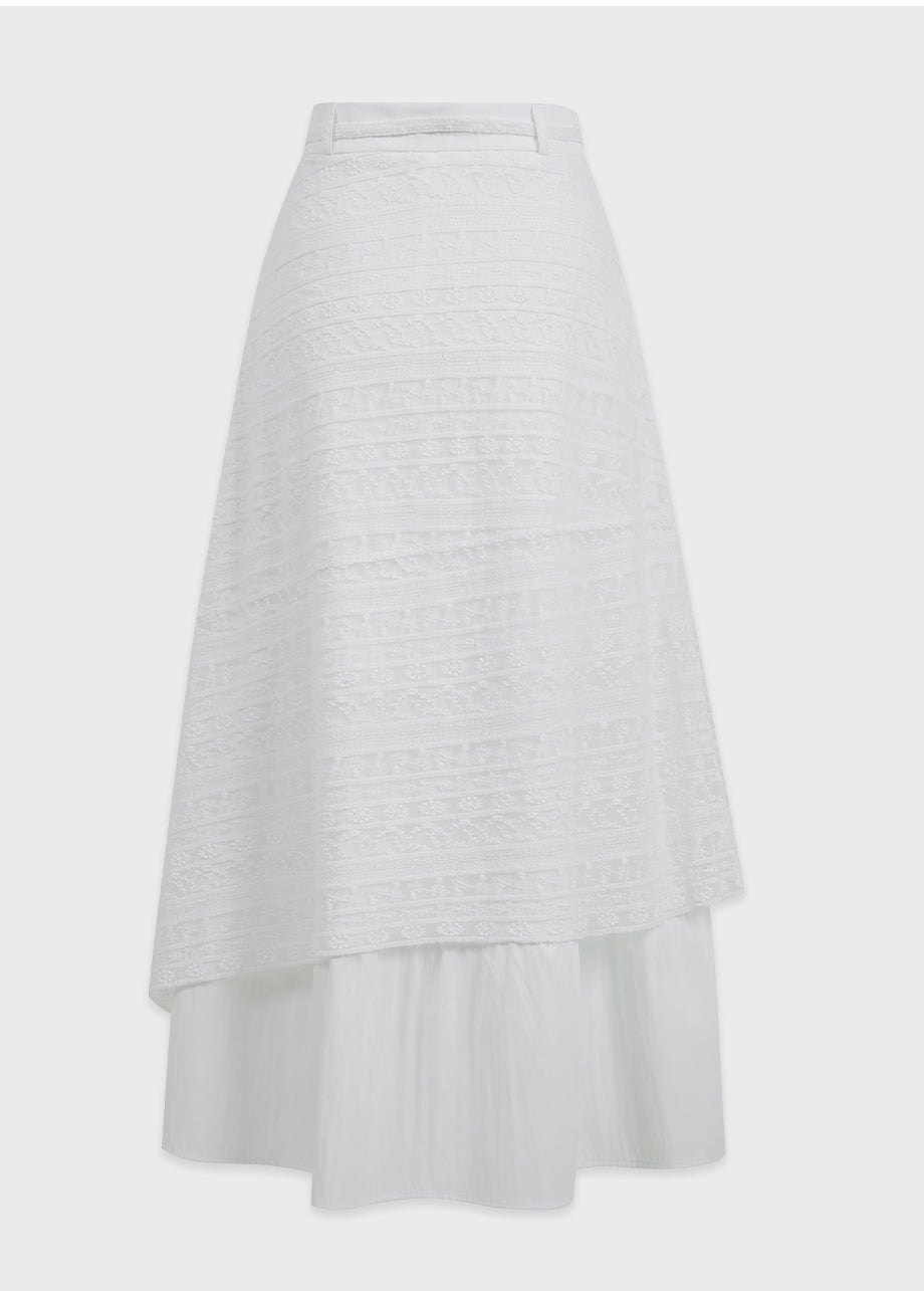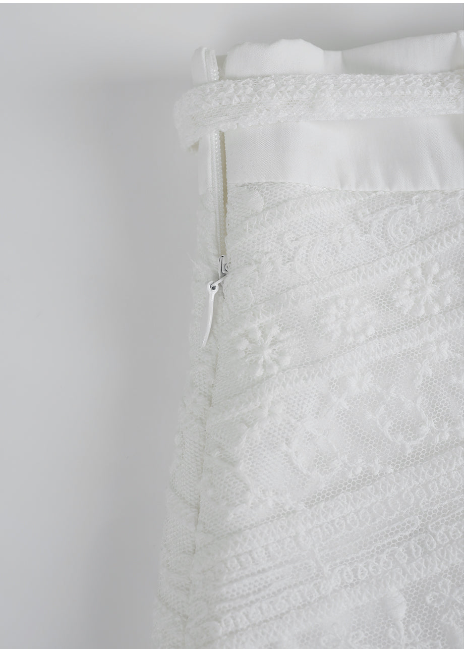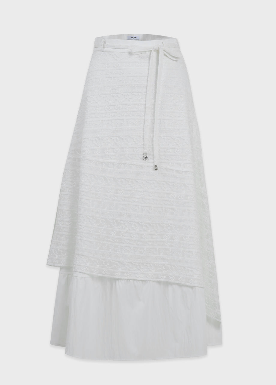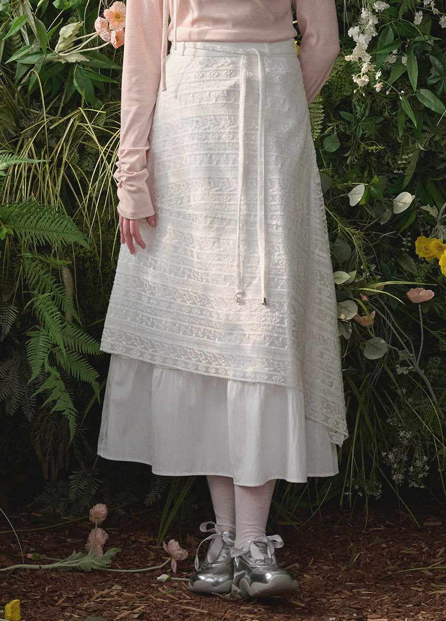 ロマンティックなムードで着用できるロングスカートです。レースストラップが付属し、お好みでコーデしてフェミニンな印象に仕上げられます。レイヤードされたデザインが魅力的なユニークさを添えています。*装飾が施された製品のため、クリーニング専門店でのお手入れをおすすめいたします。