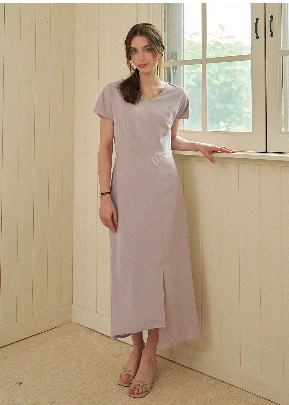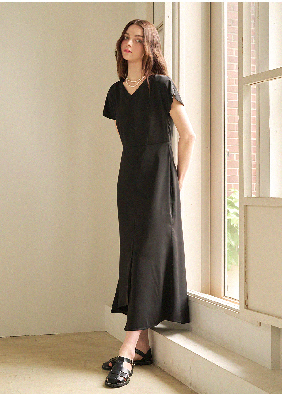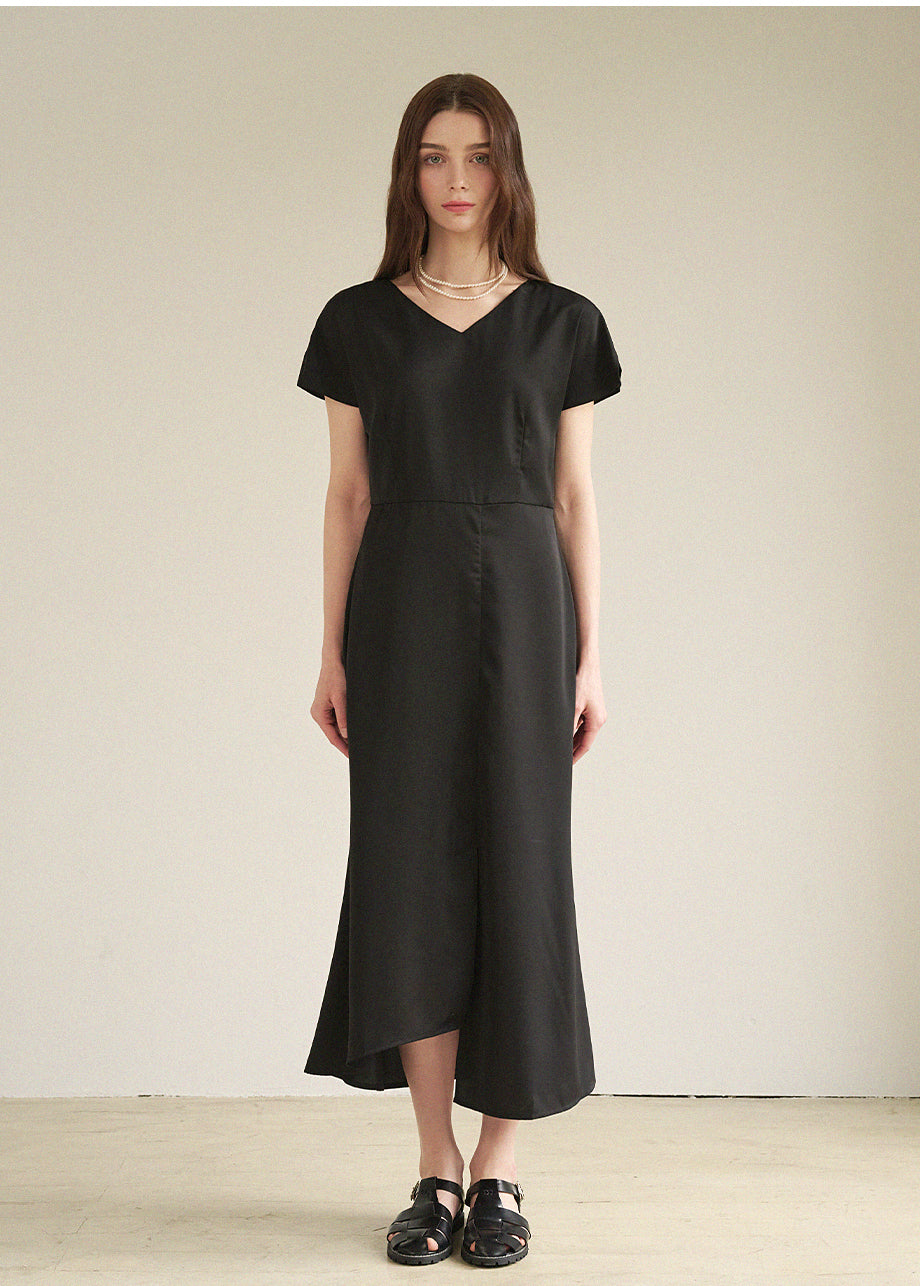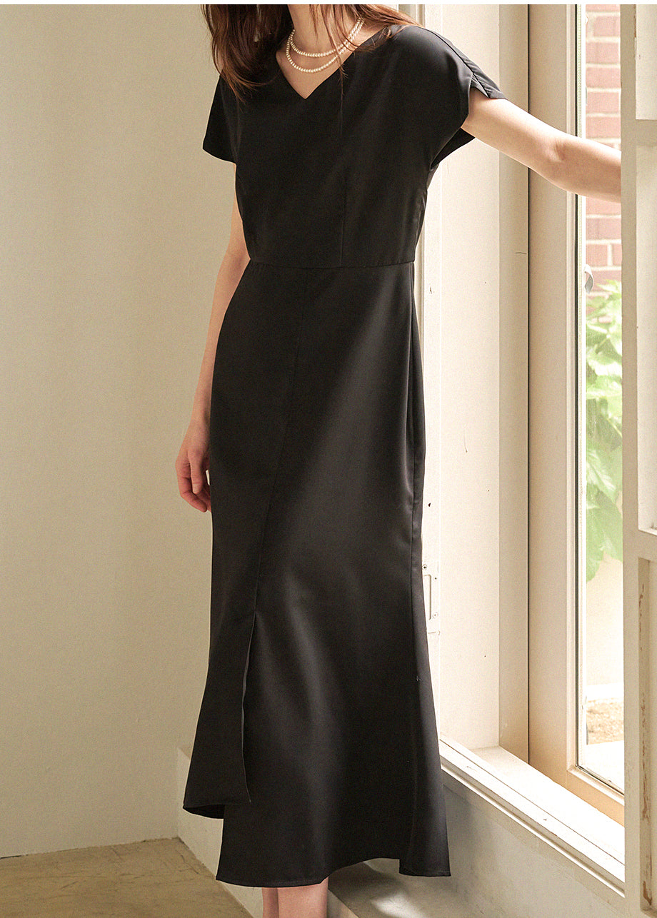 フェミニンでデイリーなムードのワンピースです。軽くて丈夫な素材を使用し、フィット感とクオリティを高めました。Vネックデザインとロング丈のマーメイドシルエットで、スリムに見える効果も期待できます。