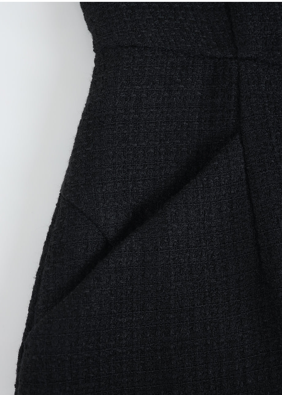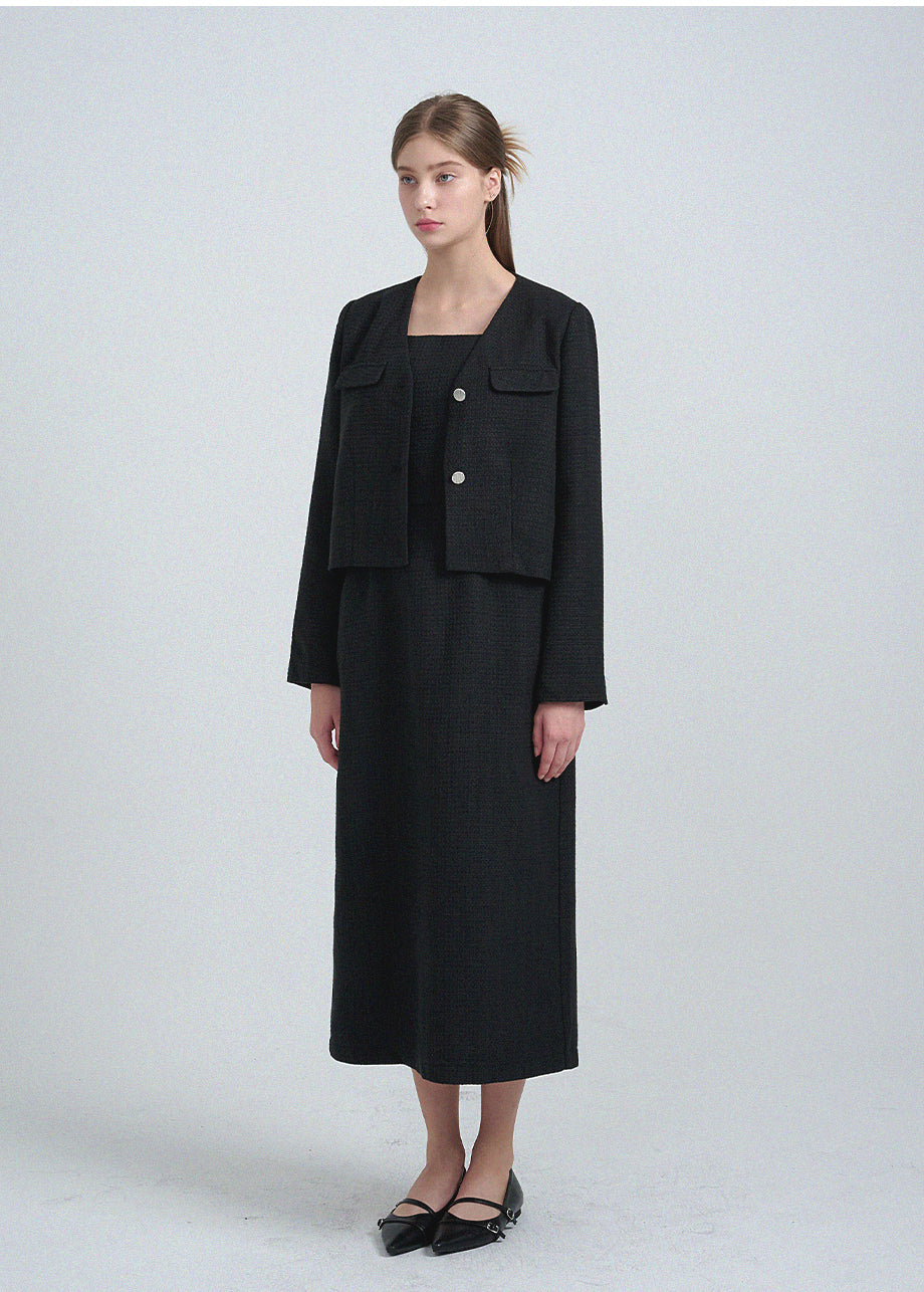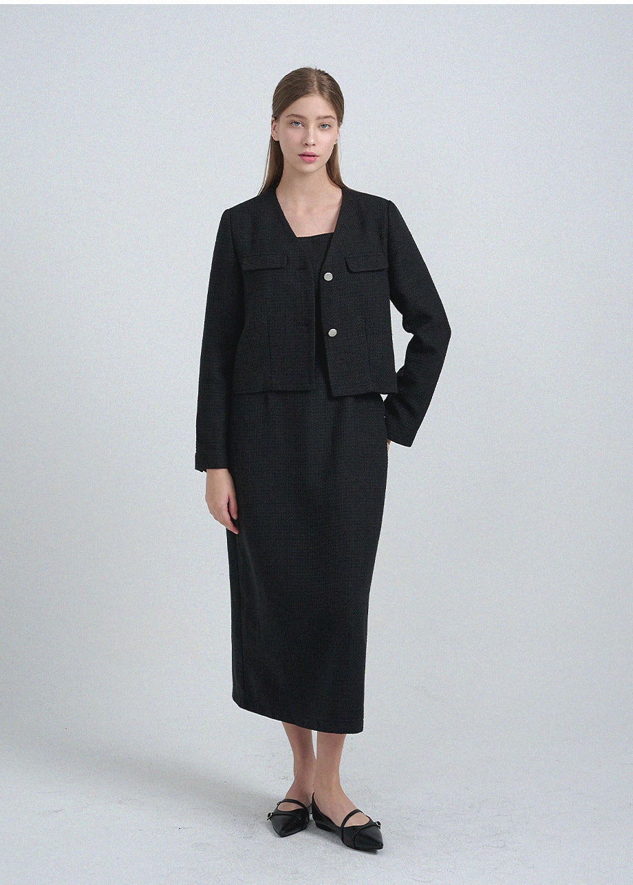 クラシックでフェミニンなムードを漂わせるドレスとジャケットのセットアップです。耐久性に優れた高級感のあるツイード生地で仕立てられており、型崩れせず体型を美しく補正してくれる着心地が特徴です。ビスチェ風ロングドレスのデザインに、サイドのシグネチャーカットラインと斜めポケットを加え、実用性とクオリティを同時に高めました。クラシックな雰囲気のVネックジャケットがセットになっており、フォーマルルック、ゲストルック、オフィスルックなど幅広いシーンで活躍します。薄めのショルダーパッドをプラスし、ボリューム感を抑えながらシルエットを整えてくれます。全体的にミニマルなデザインで、単品でもセットでもおすすめのアイテムです。ジャケットのネック後ろ中心にペンダント装飾を施し、より上質な仕上がりにしました。*装飾や特殊なデザインが施された製品のため、クリーニング専門店でのお手入れをおすすめいたします。