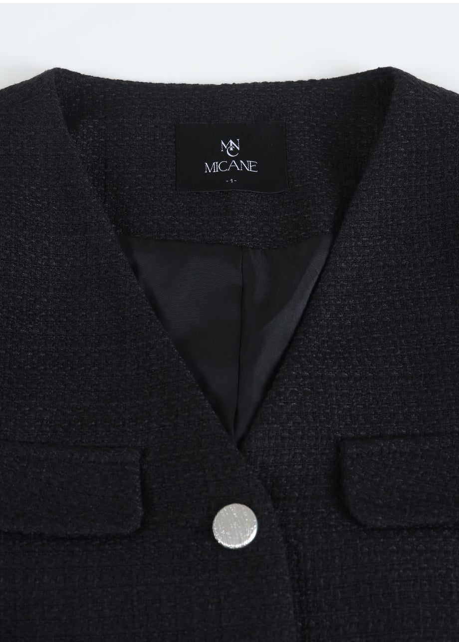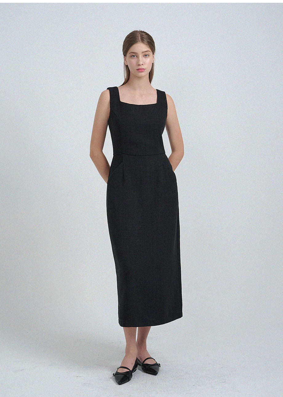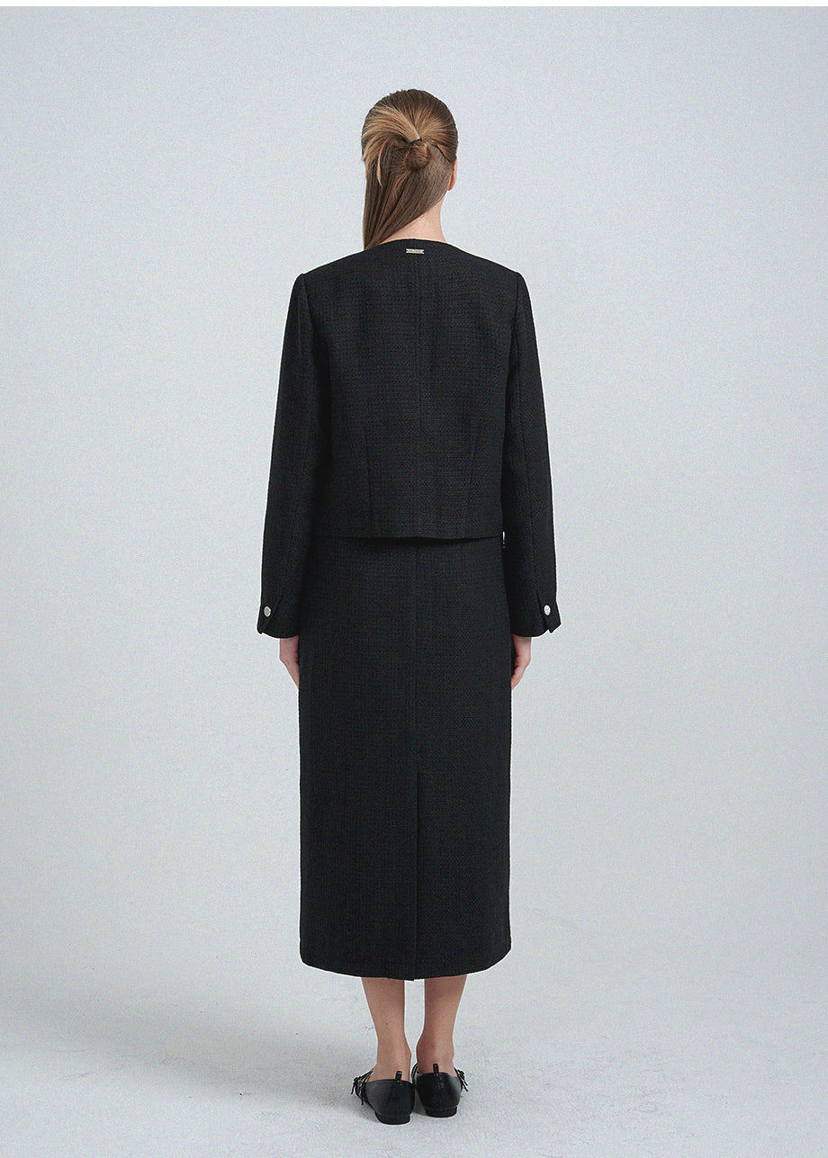 クラシックでフェミニンなムードを漂わせるドレスとジャケットのセットアップです。耐久性に優れた高級感のあるツイード生地で仕立てられており、型崩れせず体型を美しく補正してくれる着心地が特徴です。ビスチェ風ロングドレスのデザインに、サイドのシグネチャーカットラインと斜めポケットを加え、実用性とクオリティを同時に高めました。クラシックな雰囲気のVネックジャケットがセットになっており、フォーマルルック、ゲストルック、オフィスルックなど幅広いシーンで活躍します。薄めのショルダーパッドをプラスし、ボリューム感を抑えながらシルエットを整えてくれます。全体的にミニマルなデザインで、単品でもセットでもおすすめのアイテムです。ジャケットのネック後ろ中心にペンダント装飾を施し、より上質な仕上がりにしました。*装飾や特殊なデザインが施された製品のため、クリーニング専門店でのお手入れをおすすめいたします。