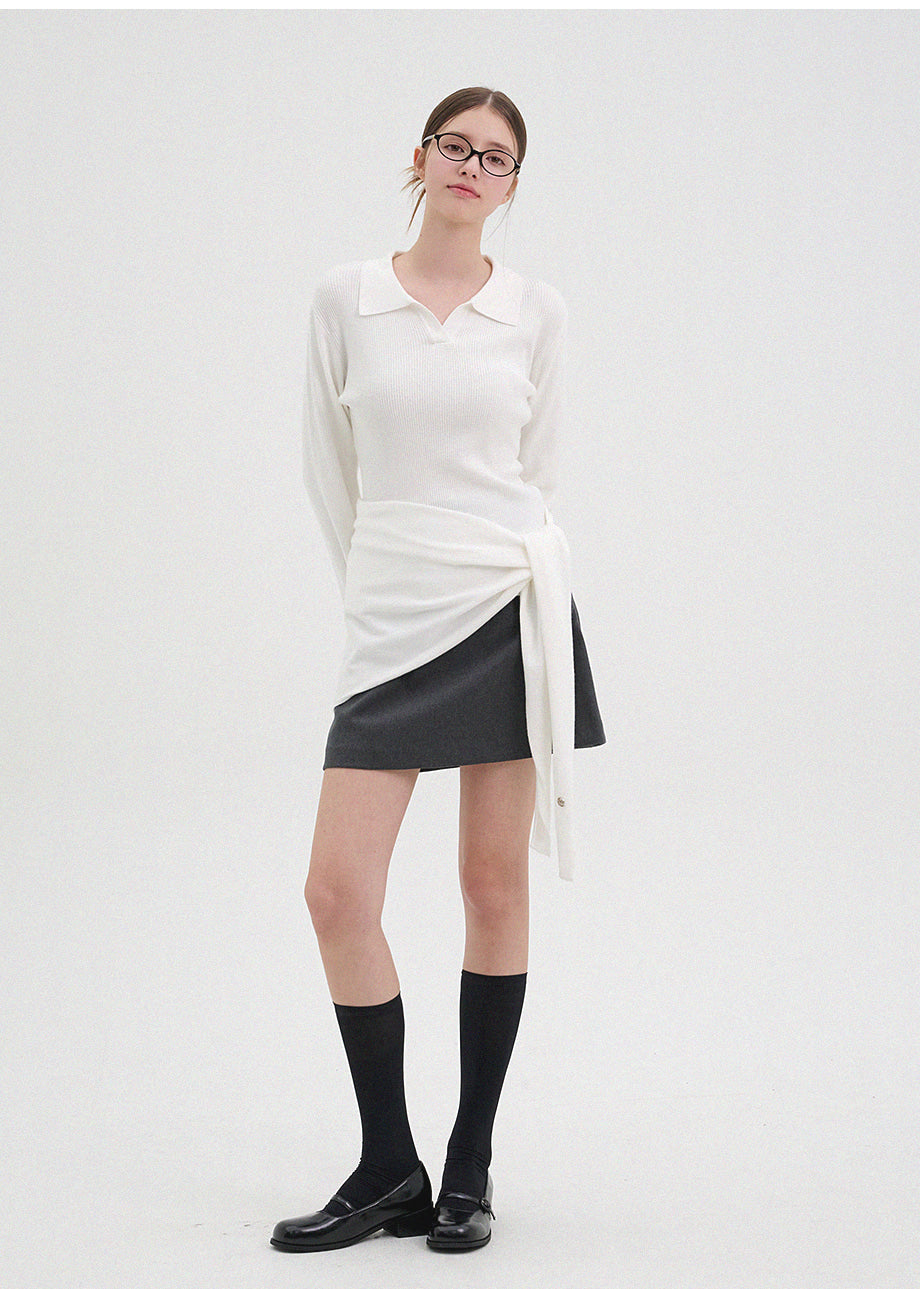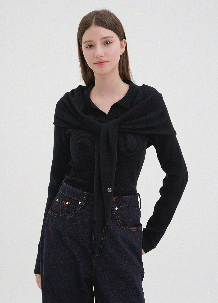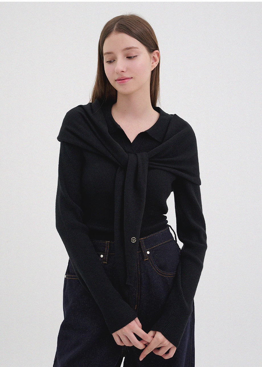 クラシックカジュアルムードのニット。柔らかく伸縮性に優れたリブ編み素材を使用し、肌にやさしく暖かく快適な着心地が魅力。軽やかな着用感で、秋は一枚着として、冬は厚手アウターのインナーとしても活躍します。オープンカラーのデザインで首元もすっきり。セットのスカーフは肩掛けやウエストマークなど、アレンジ次第でさまざまなスタイリングを楽しめます。後ろ襟元のペンダントディテールで仕上げ、上質感をプラスしました。*装飾が施された製品のため、クリーニング専門店でのお手入れをおすすめいたします。