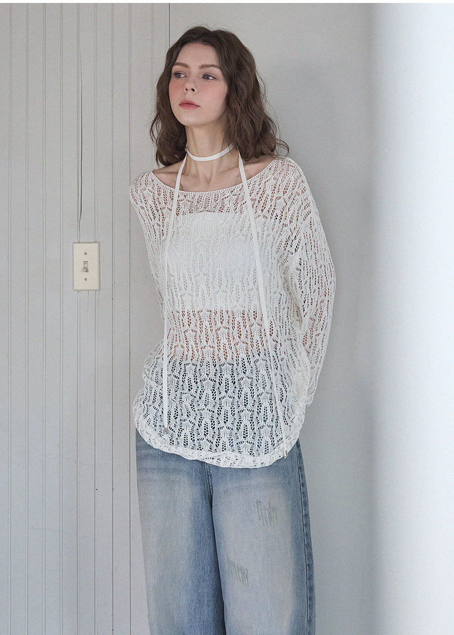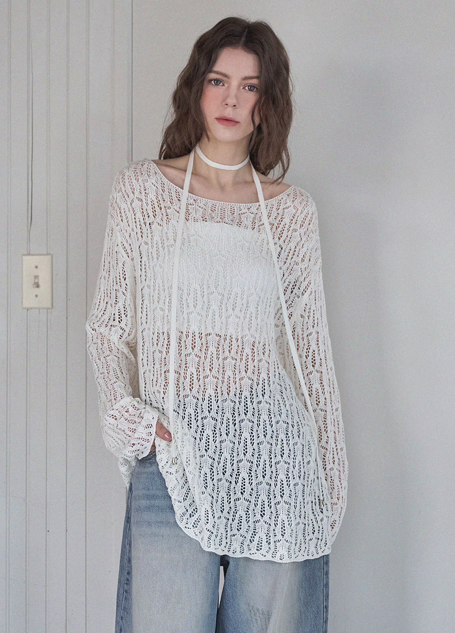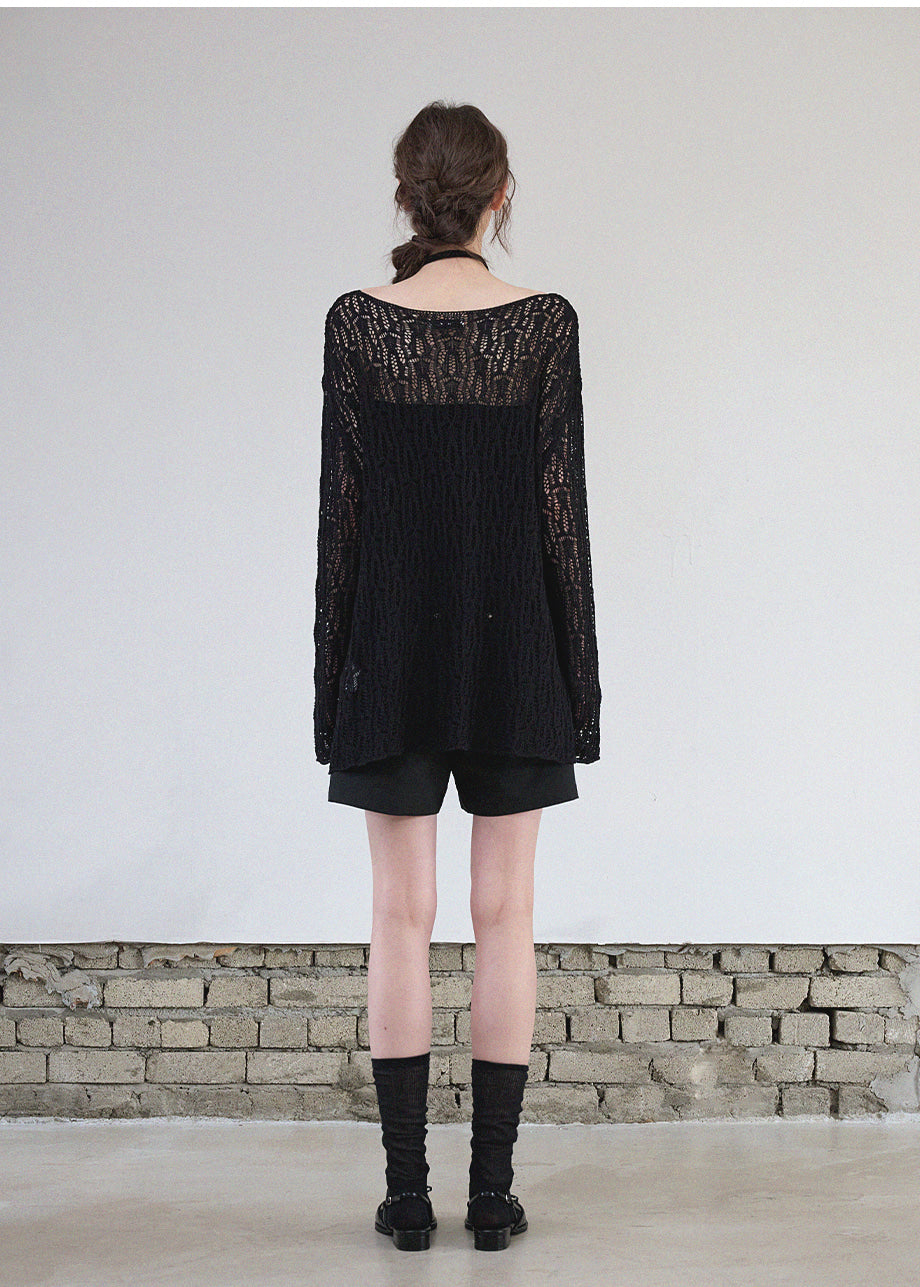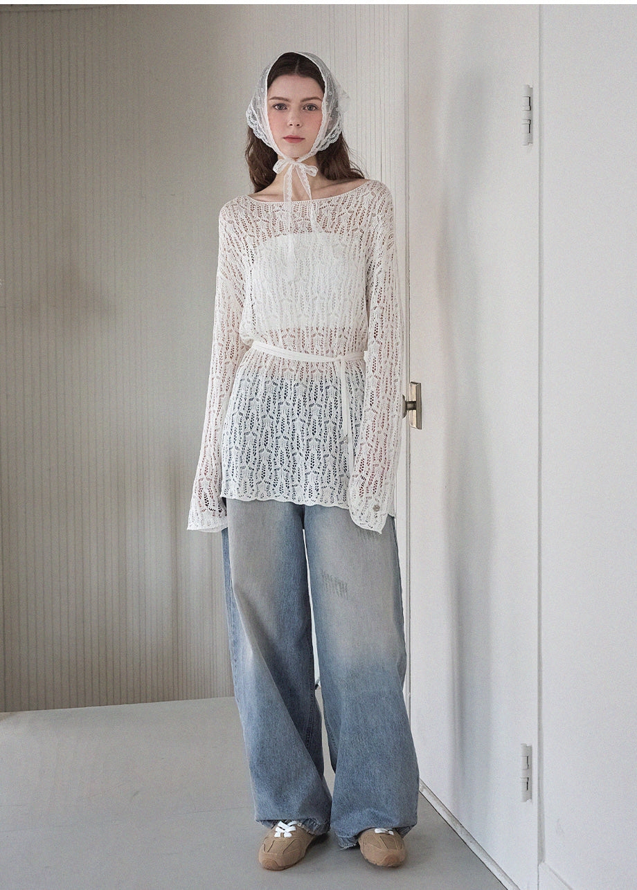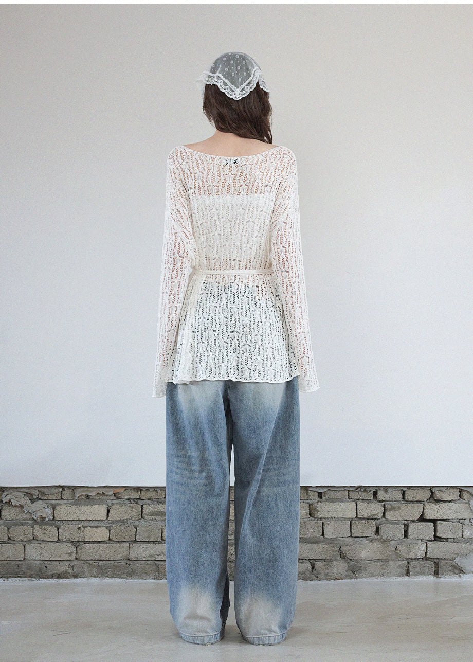 ヴィンテージな感性のロングノースリーブニットです。繊細なパターンとほんのり透け感のあるデザインが、フェミニンでユニークな雰囲気を演出します。*装飾が施された製品のため、クリーニング専門店でのお手入れをおすすめいたします。