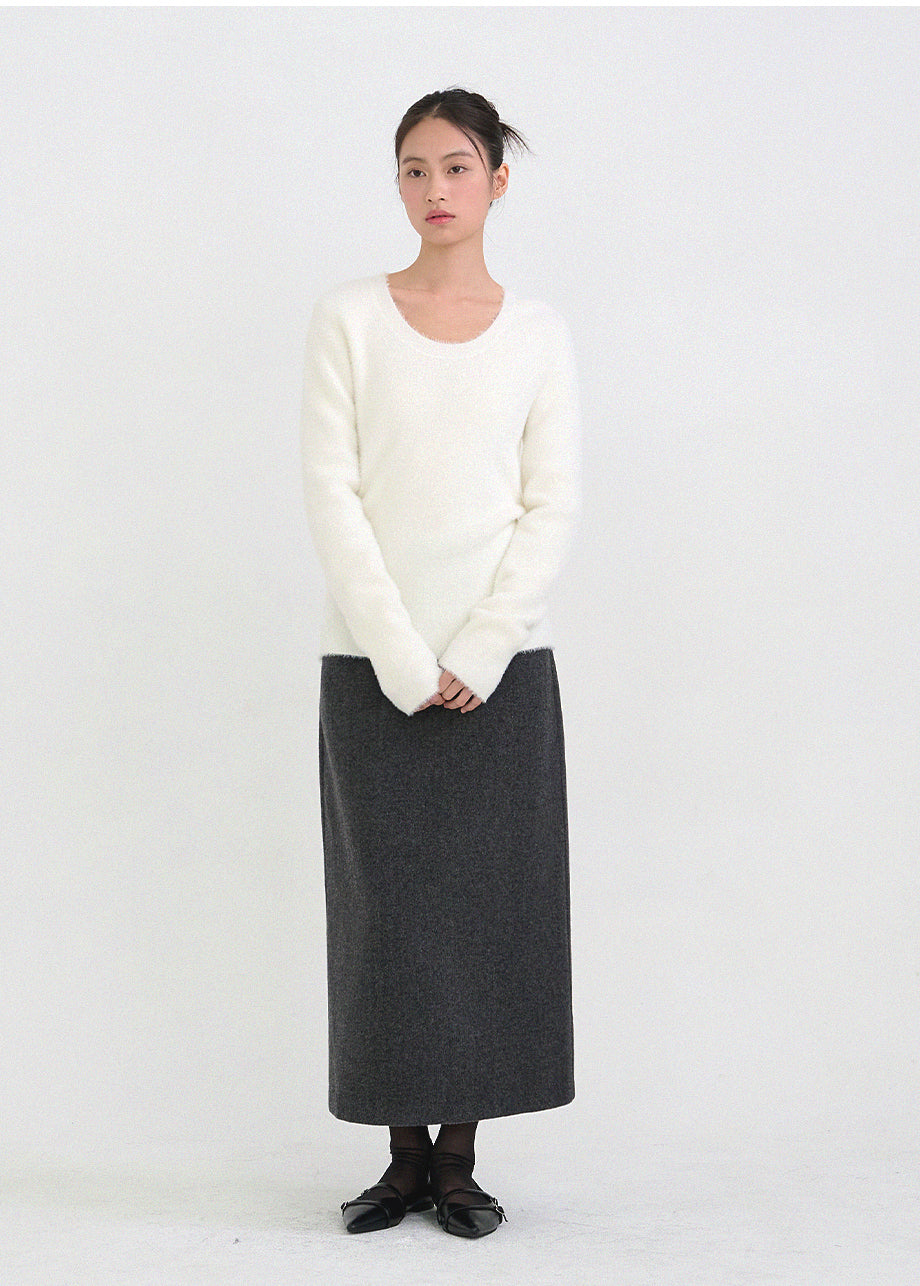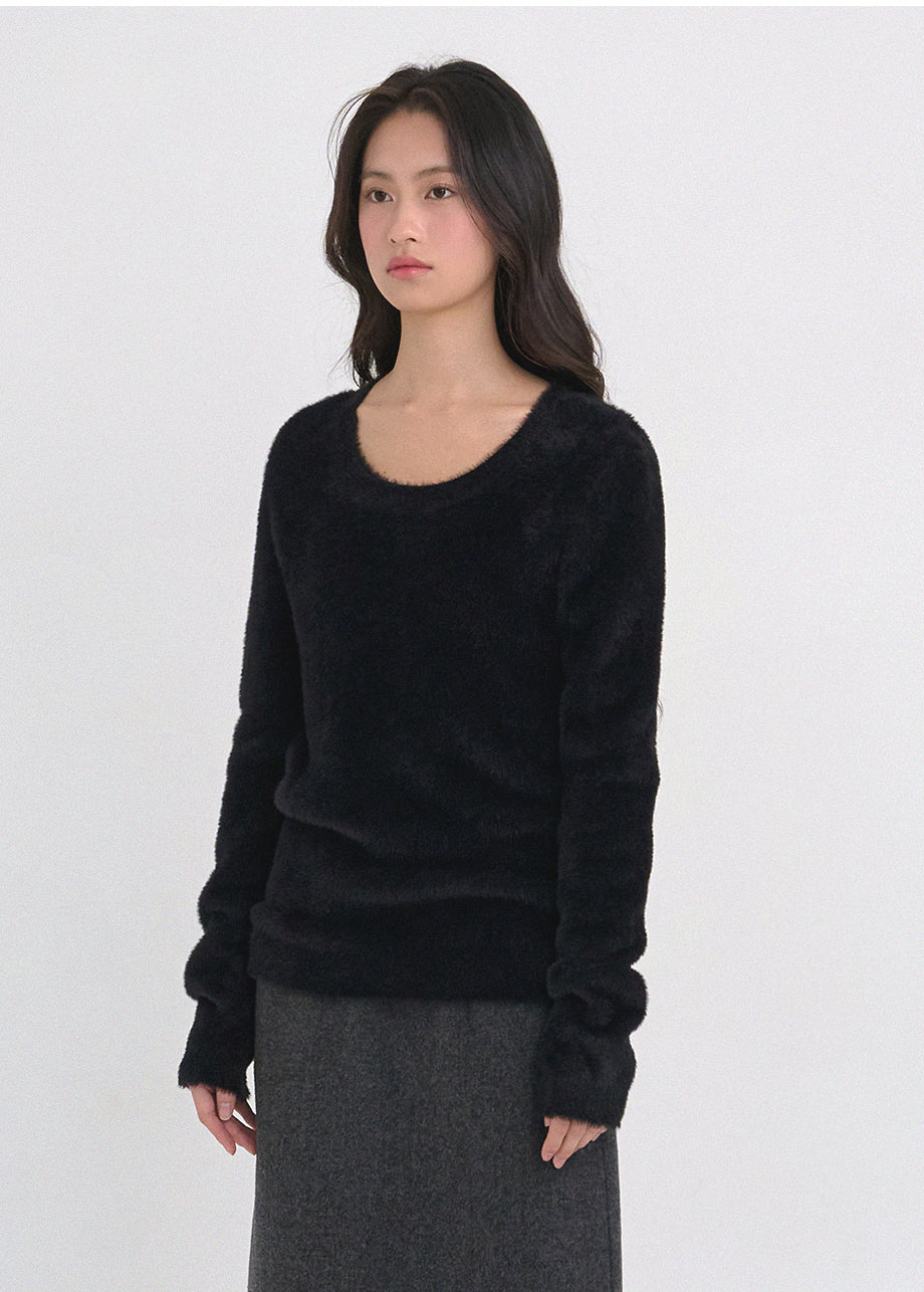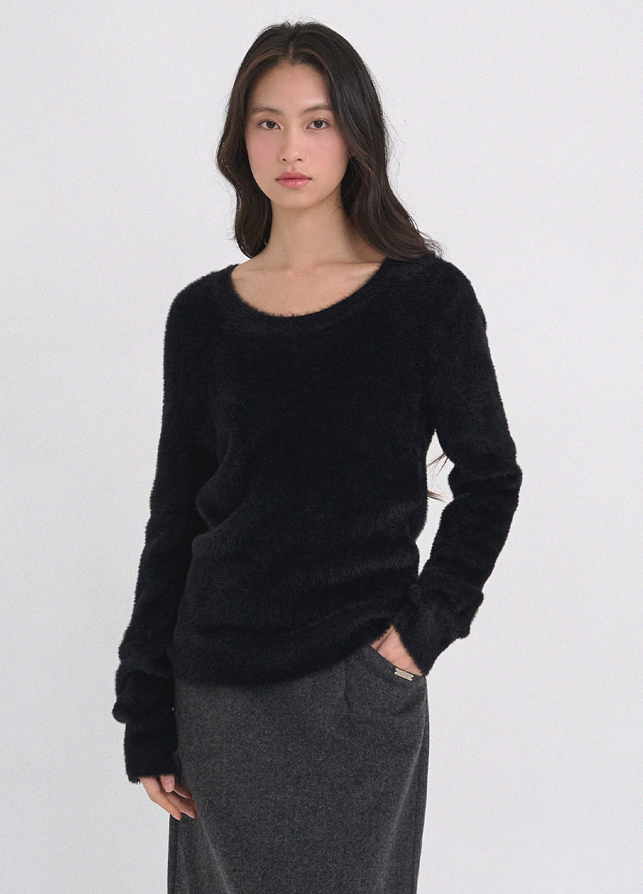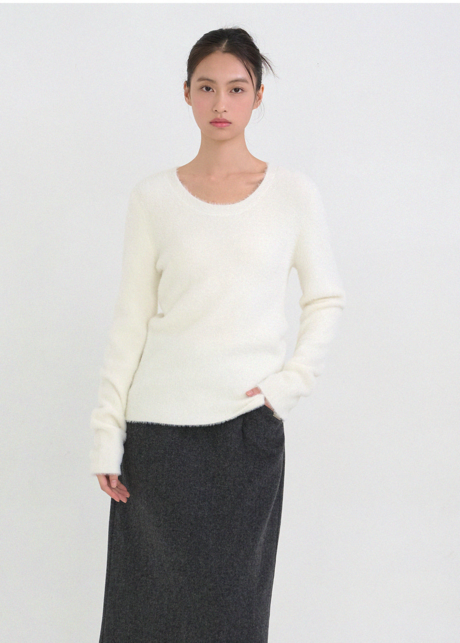 クラシックフェミニンムードのニットです。高級感のあるヘアリー糸を使用し、刺激のない柔らかく温かな着心地が特徴です。ヘアリー糸特有の毛抜けがほとんどなく、お手入れも簡単です。ボディラインを拾わないスリムルーズフィットに、控えめなUネックデザインで、さまざまなアウターのインナーとしてポイント使いにおすすめです。細やかな編み仕上げで長くご愛用いただけます。ベーシックなデザインで幅広いコーディネートが可能です。バックネック中央にはペンダント風の装飾を加え、上品に仕上げました。*装飾や特殊なデザインが施された製品のため、クリーニング専門店でのお手入れをおすすめいたします。